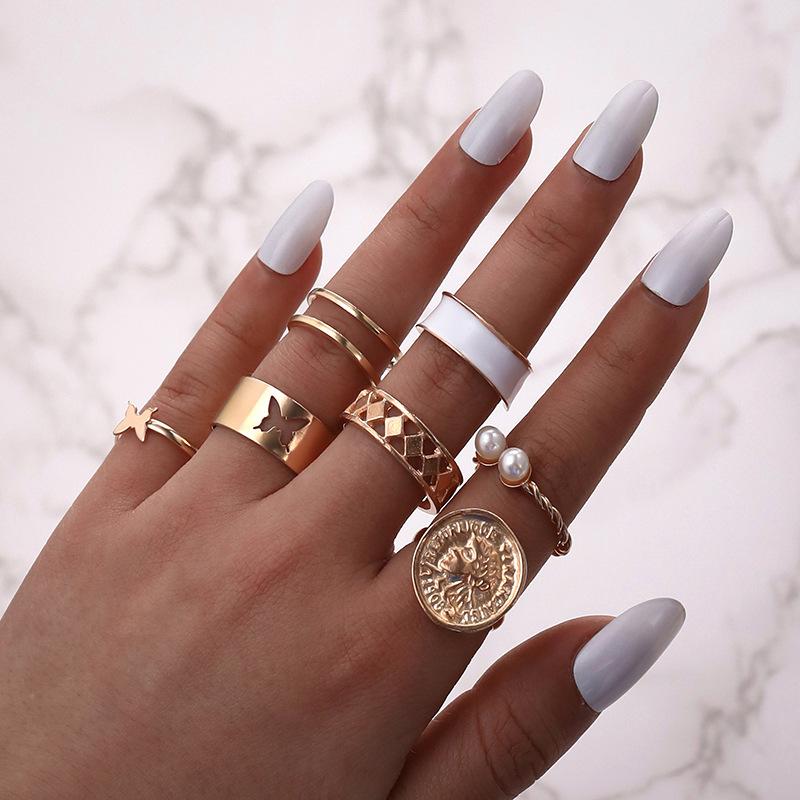 Nuevo anillo de gota de aceite de moda transfronteriza, estilo europeo y americano, mariposa hueca, anillo de perla de 7 piezas, venta al por mayor