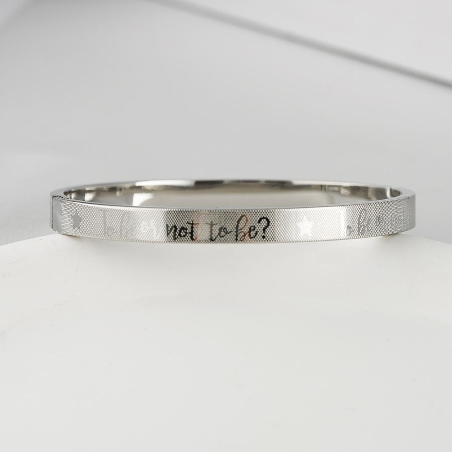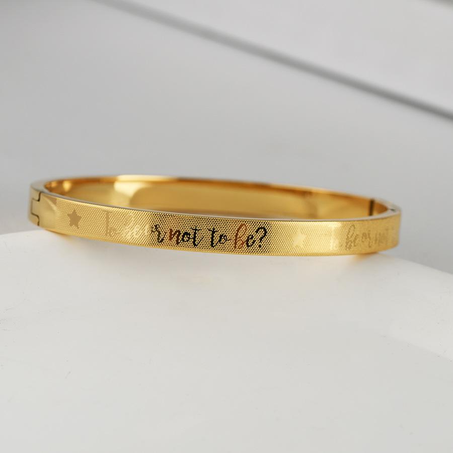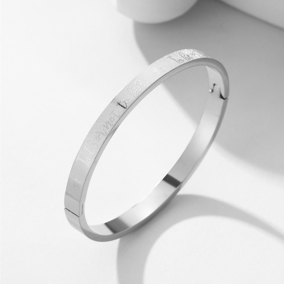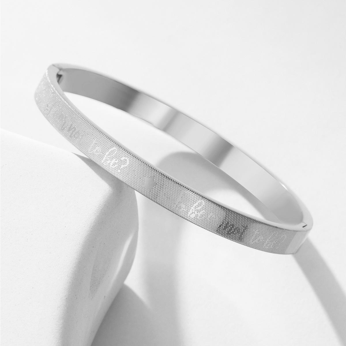 Fabricantes de pulseras de acero de titanio al por mayor, pulsera ajustable abierta en forma de C, pulsera femenina de acero inoxidable con logotipo de texto grabado.