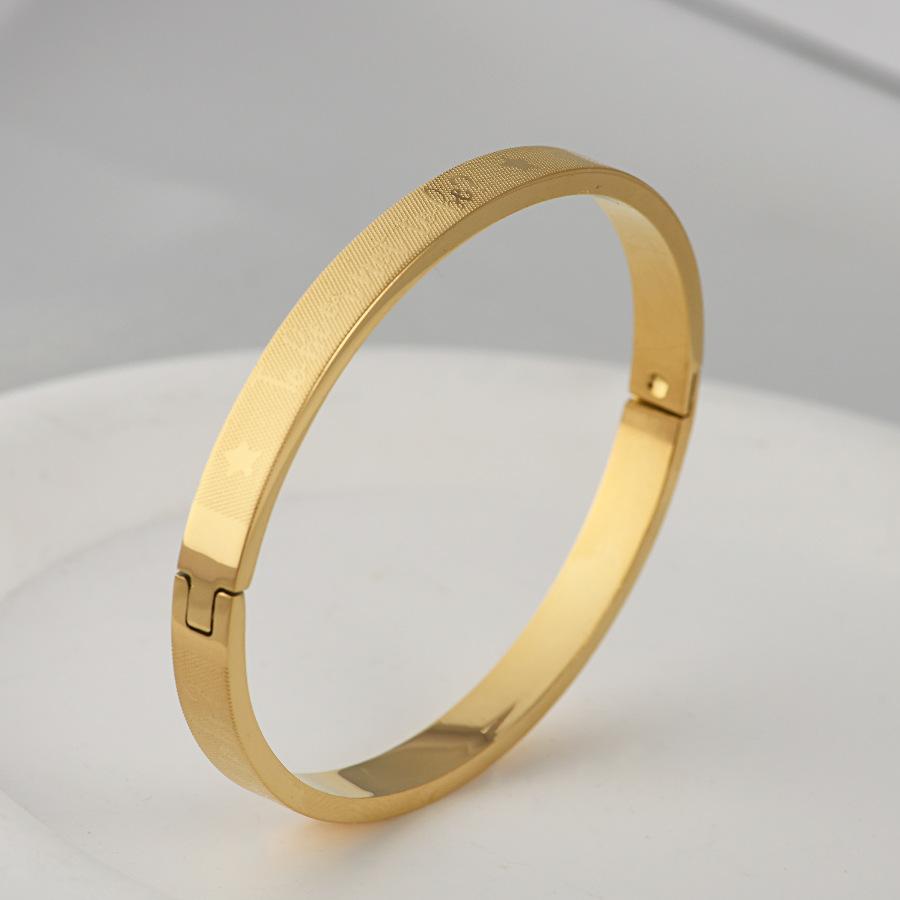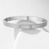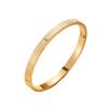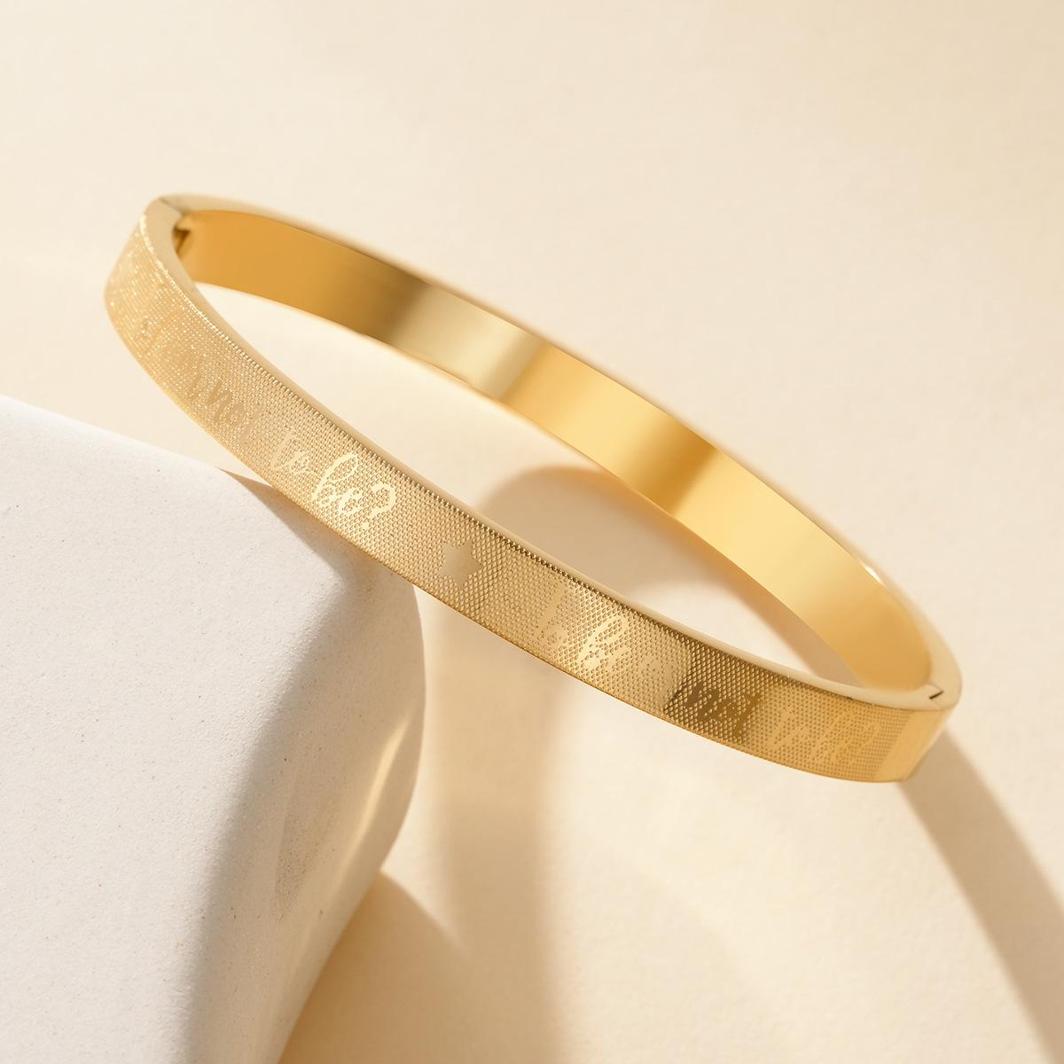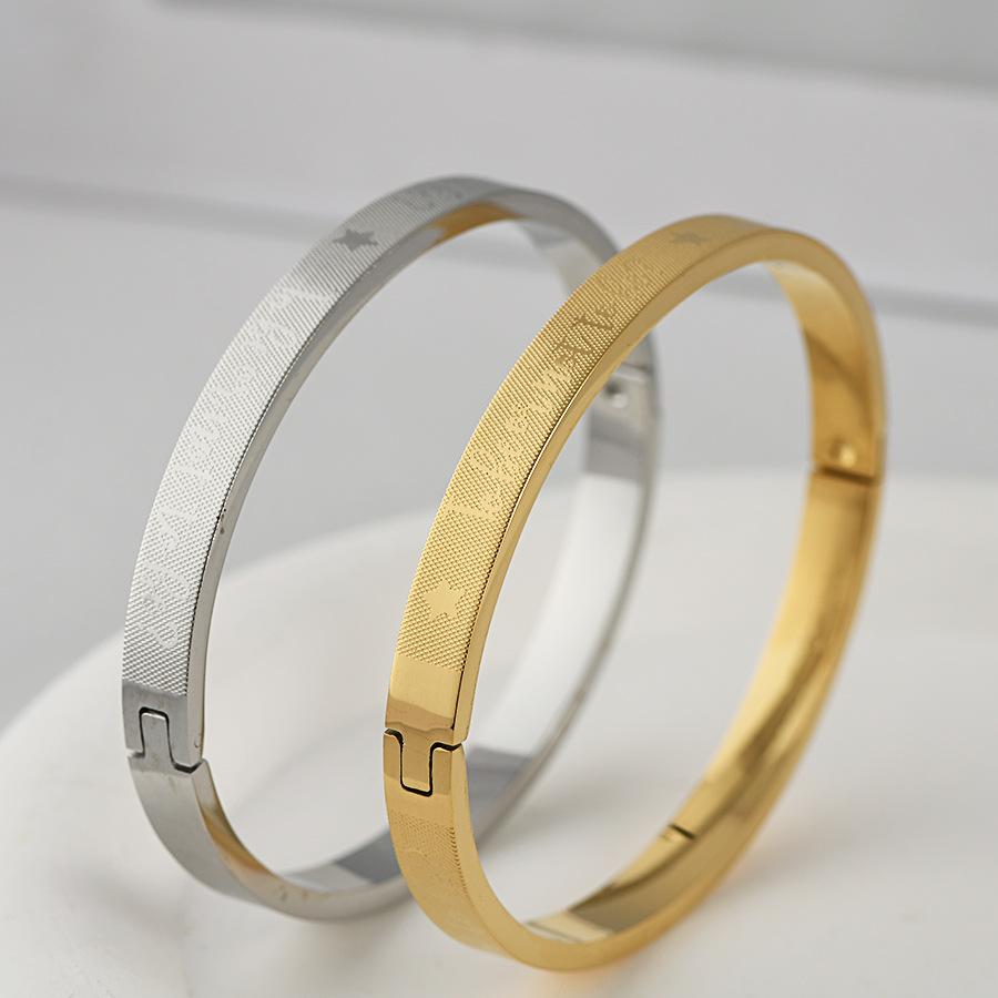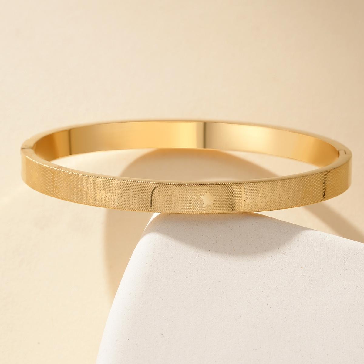 Fabricantes de pulseras de acero de titanio al por mayor, pulsera ajustable abierta en forma de C, pulsera femenina de acero inoxidable con logotipo de texto grabado.
