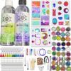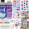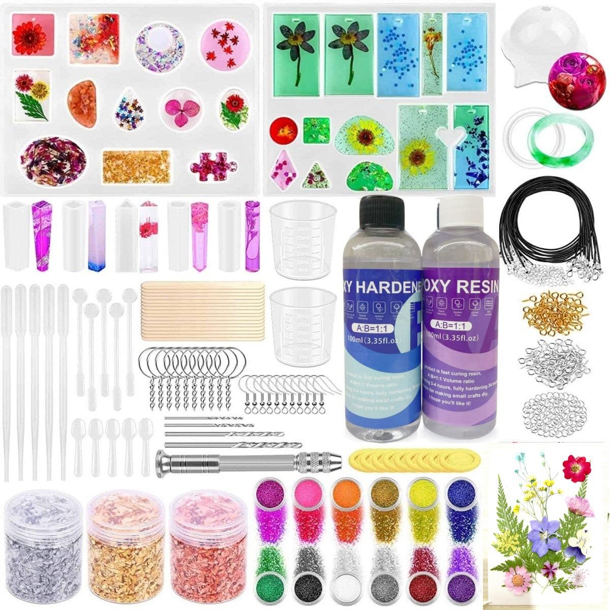 Juego de resina para principiantes de 219 piezas, juego de moldes de resina epoxi con silicona para molde de resina y suministros de resina epoxi (pegamento A y pegamento B, los colores de las botellas son aleatorios), que incluye flores secas, papel de aluminio, hilo para collar, ganchos para pendientes, para hacer joyas de bricolaje