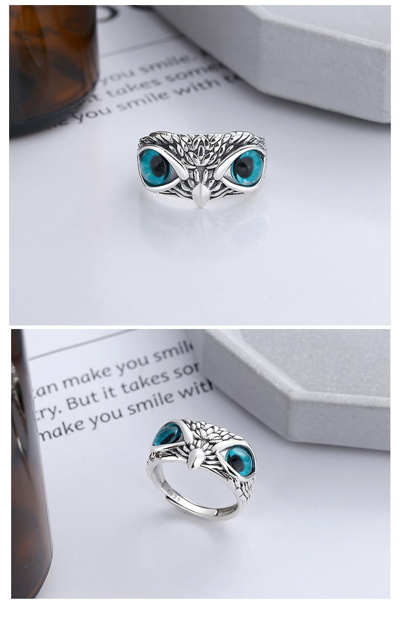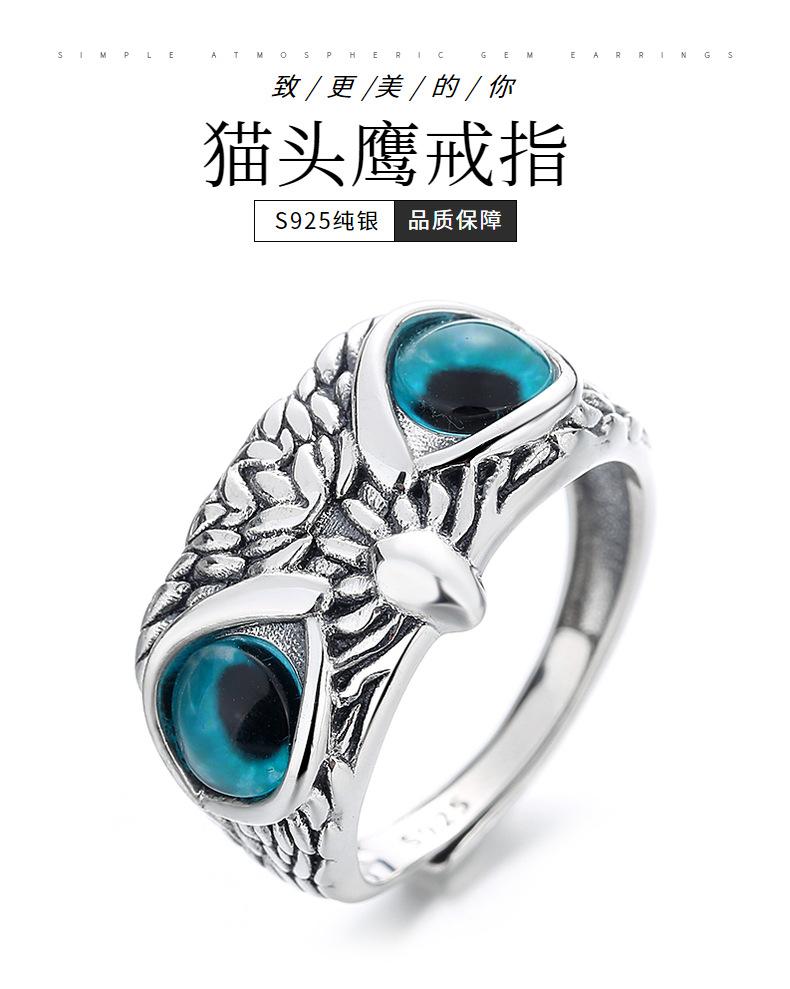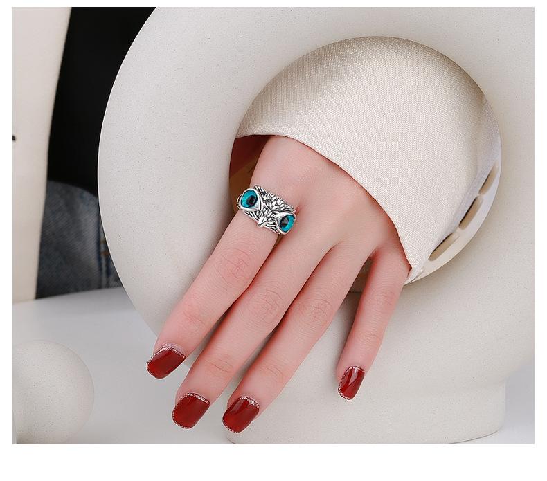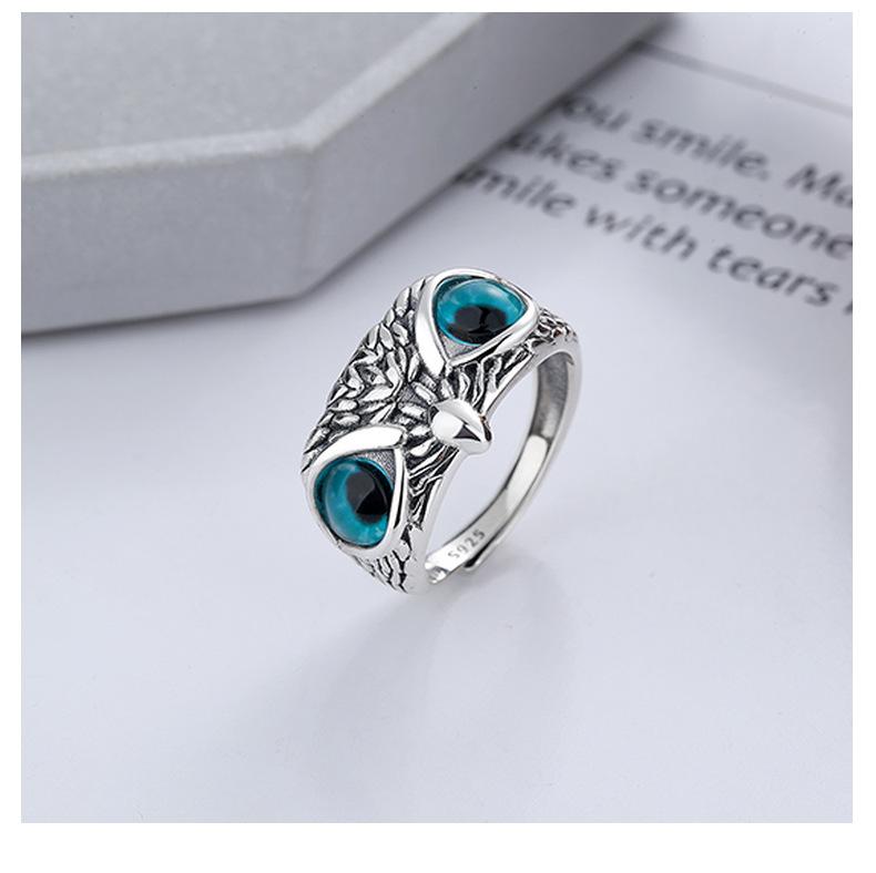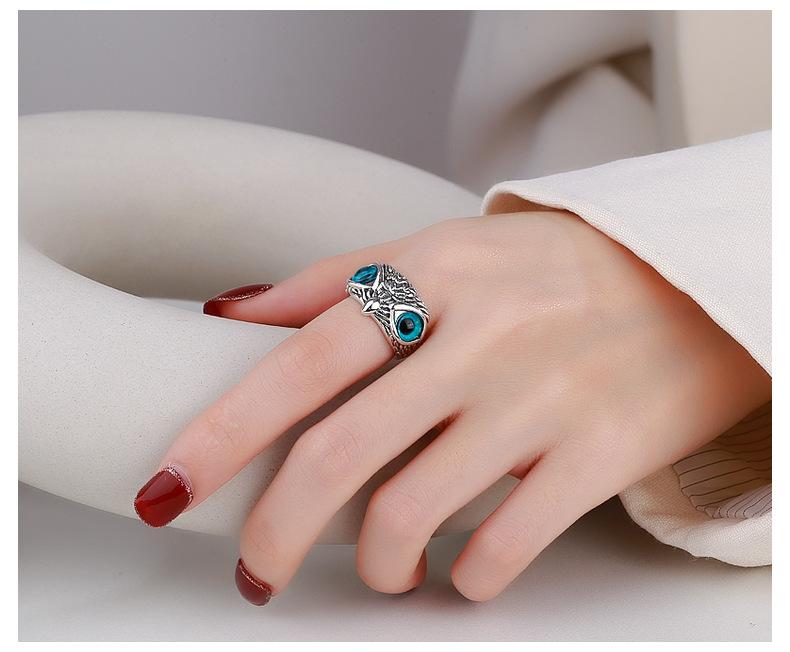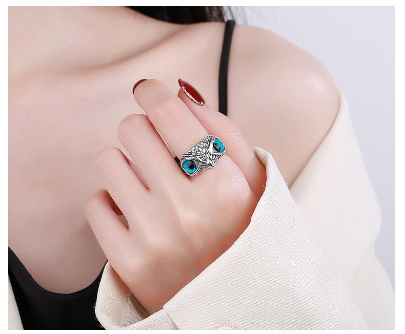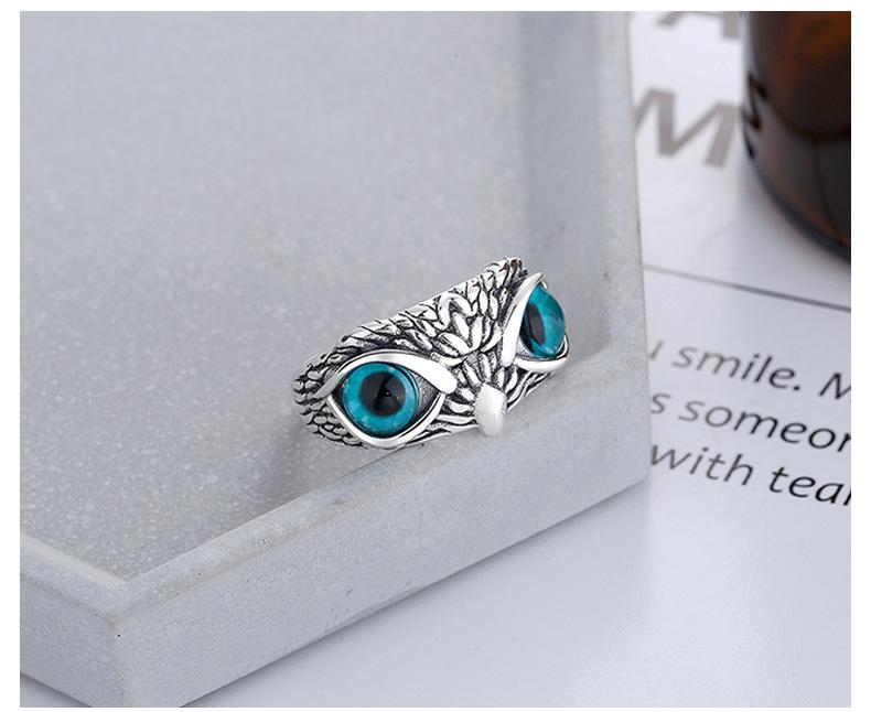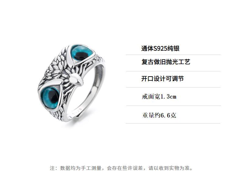 Anillo abierto Yunchao Xuan S925 de plata esterlina, estilo retro industrial, ligero, de lujo, con diseño de búho azul, tridimensional, estilo punk, moderno.