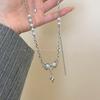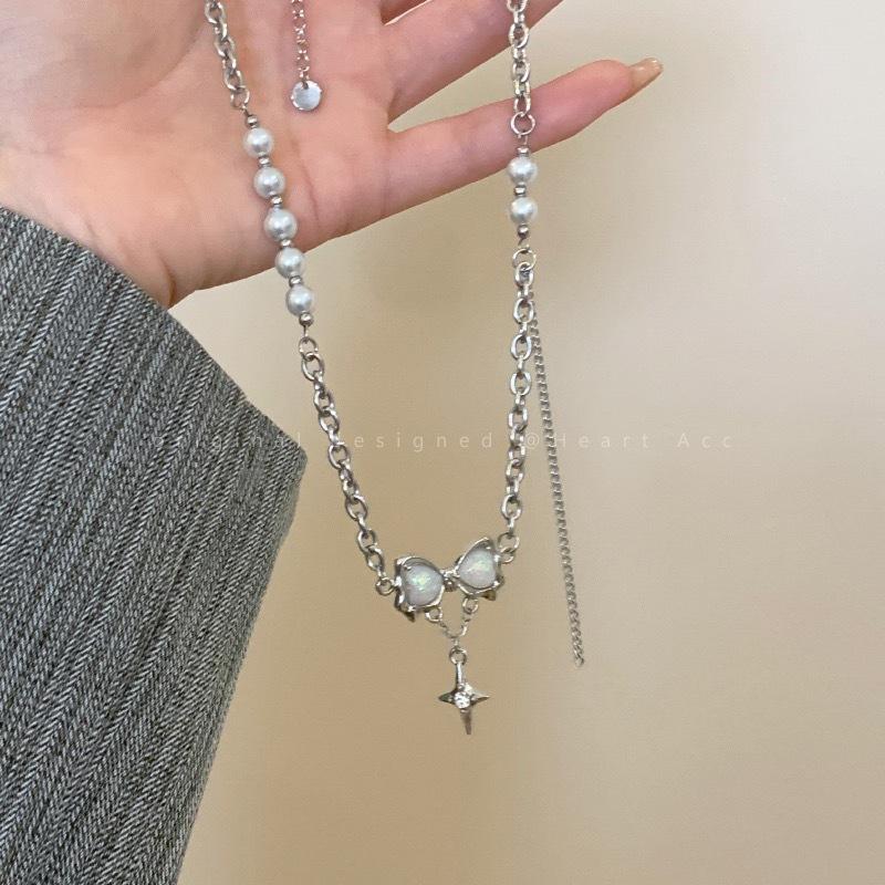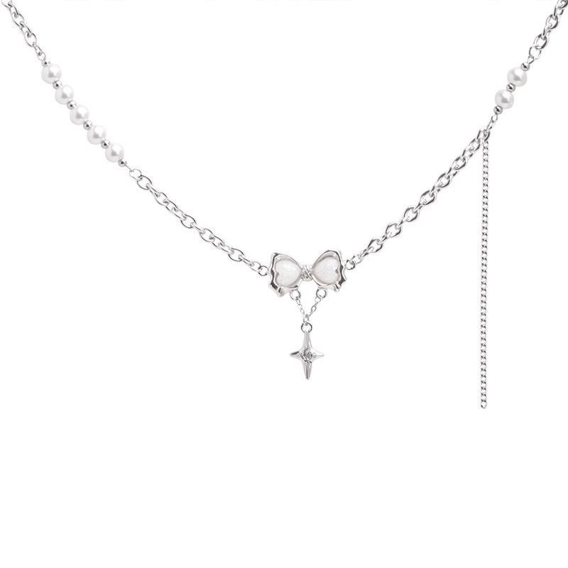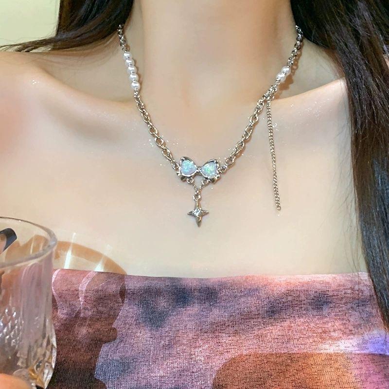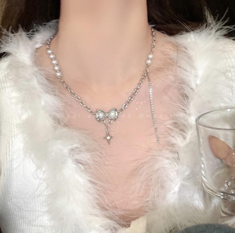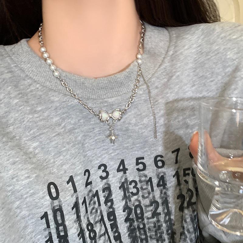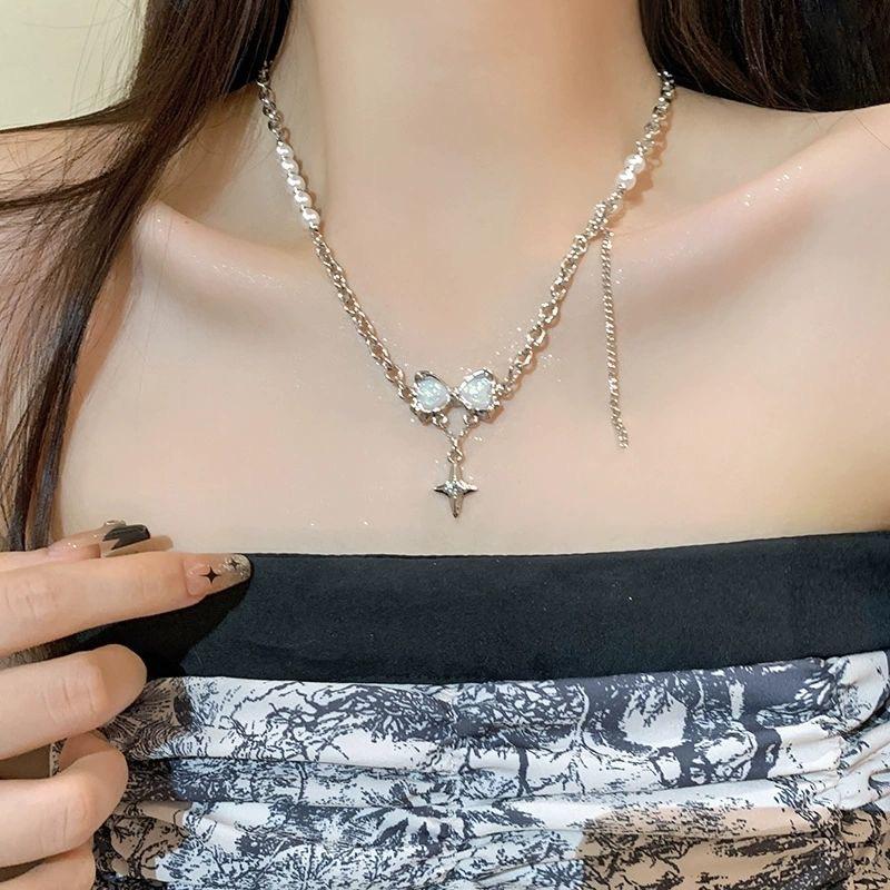 Collar de perlas con doble corazón y lazo para mujer, elegante y moderno, de lujo, con accesorios de alta gama y diseño personalizado, cadena para clavícula.