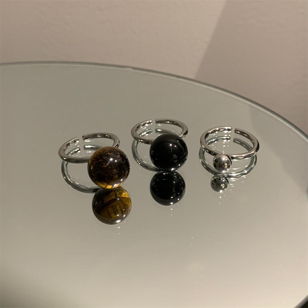 Silver metal ball ring, Black agate ring, Tiger Eye stone ring