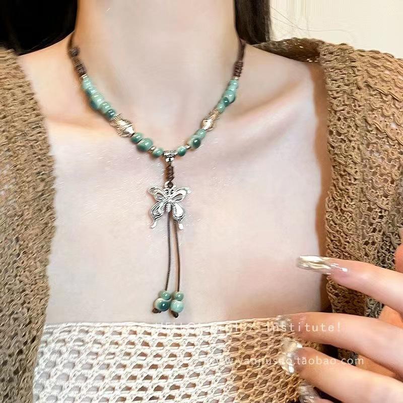 Collar de mariposa con borlas y cuentas tejidas retro de estilo chino, estilo étnico, cadena de clavícula, cadena de cuello de nicho, novedad de 2024