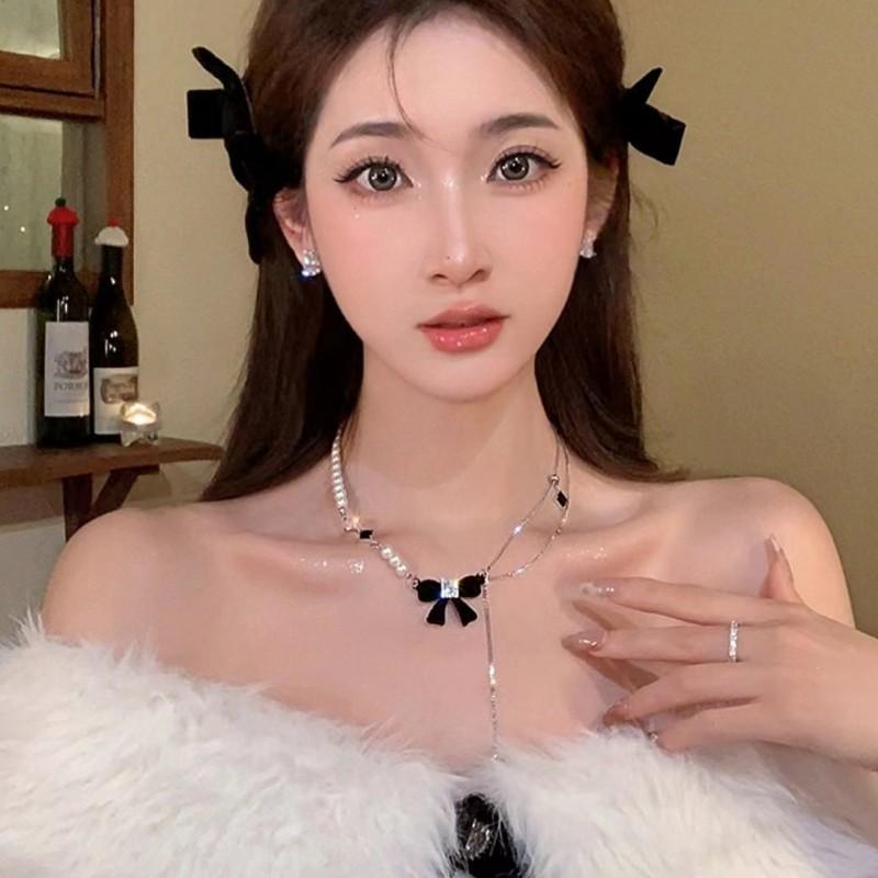 Compra Collar de alta calidad con diseño moderno de lujo y cadena de clavícula con borlas de perlas y lazo de diamantes de imitación para niña dulce al por mayor en Joom.pro