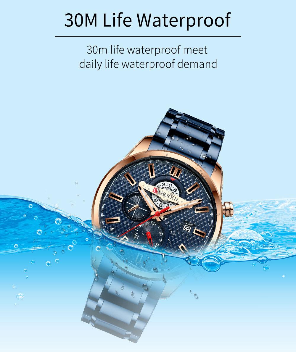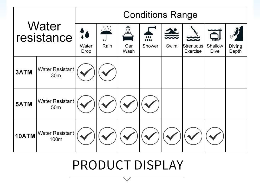 Nota: Es resistente al agua para uso diario, pero no se puede usar para nadar, bañarse, sumergirse ni usar bajo el agua. Resiste lloviznas y pequeñas salpicaduras. Para prolongar la vida útil del reloj, evite el contacto con sustancias corrosivas.