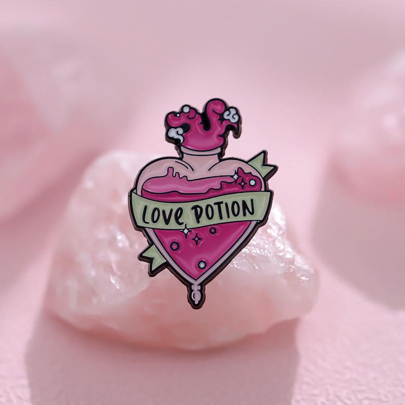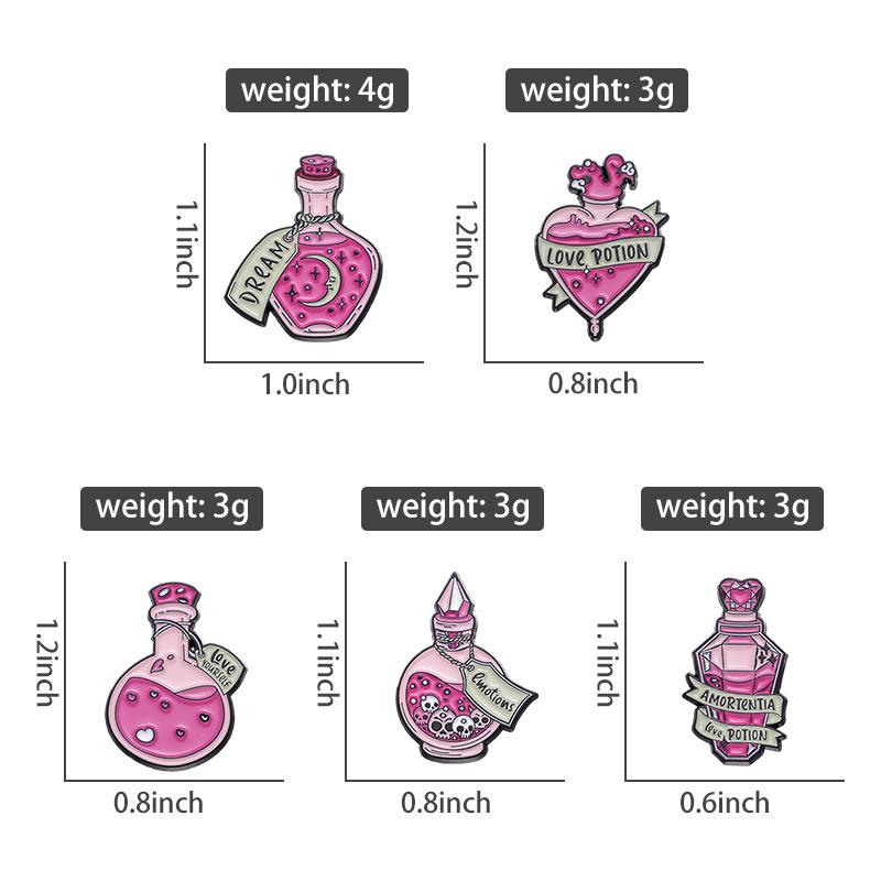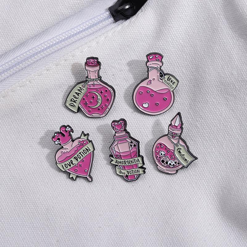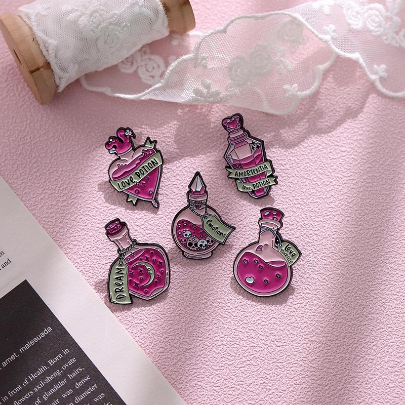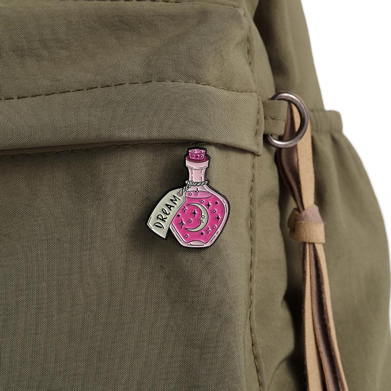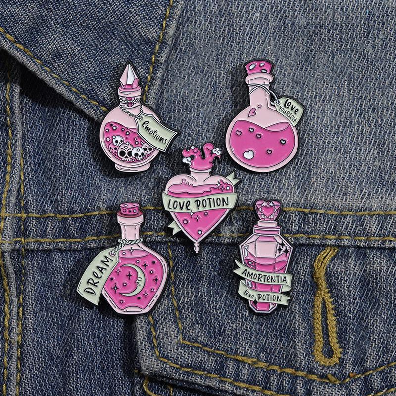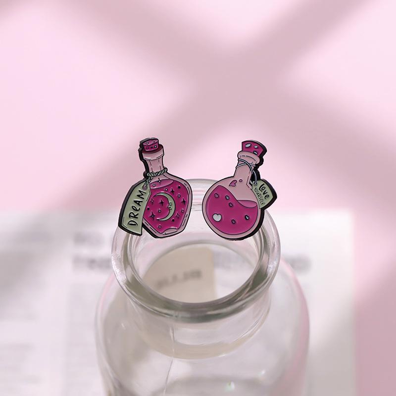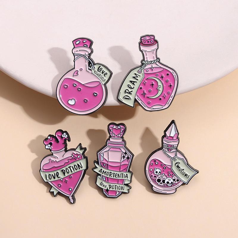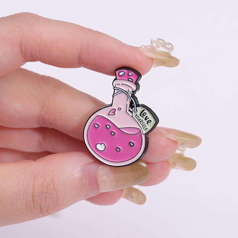 Broche de botella de medicina mágica, creativo y simple con dibujos animados transfronterizos, insignia de metal geométrica, pin de moda con letras pintadas