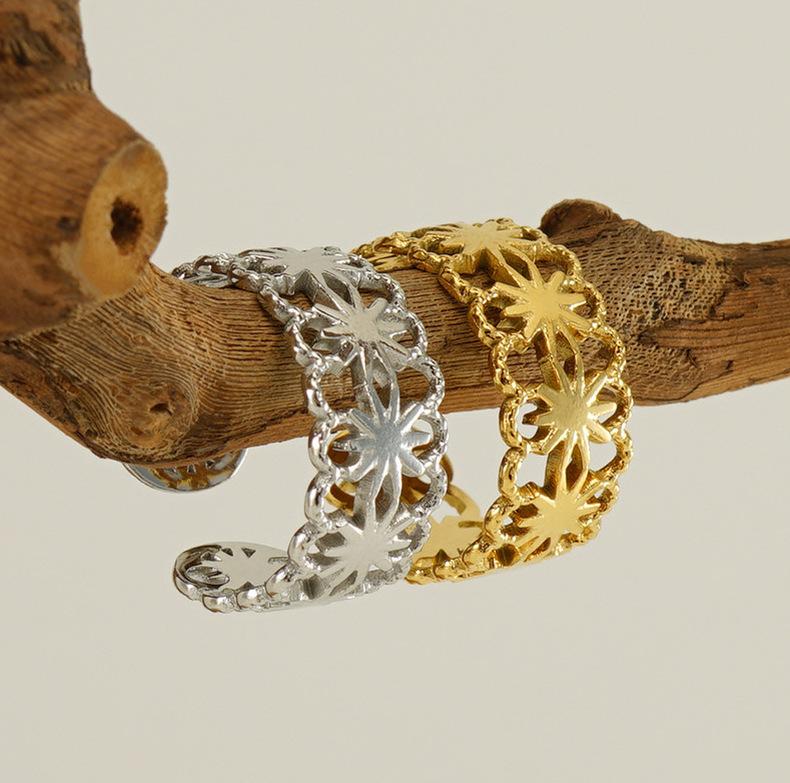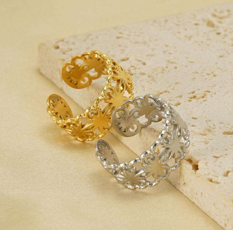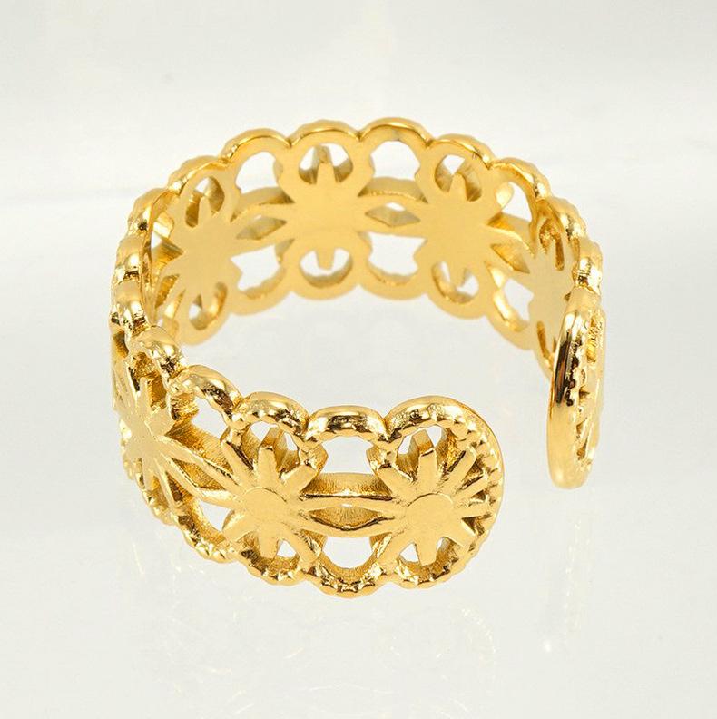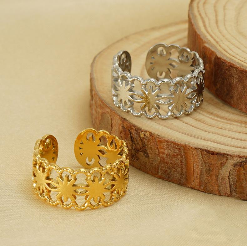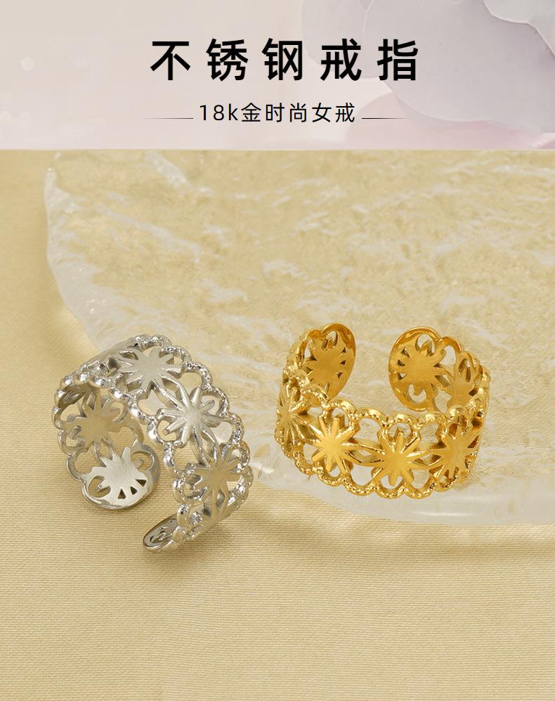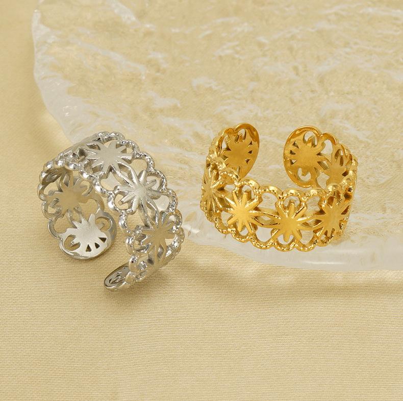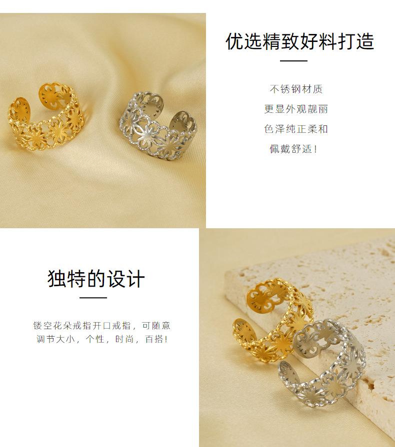 Anillo abierto estilo europeo y americano retro estilo frío para mujer, anillo ajustable con flor hueca de acero de titanio a la moda, venta al por mayor