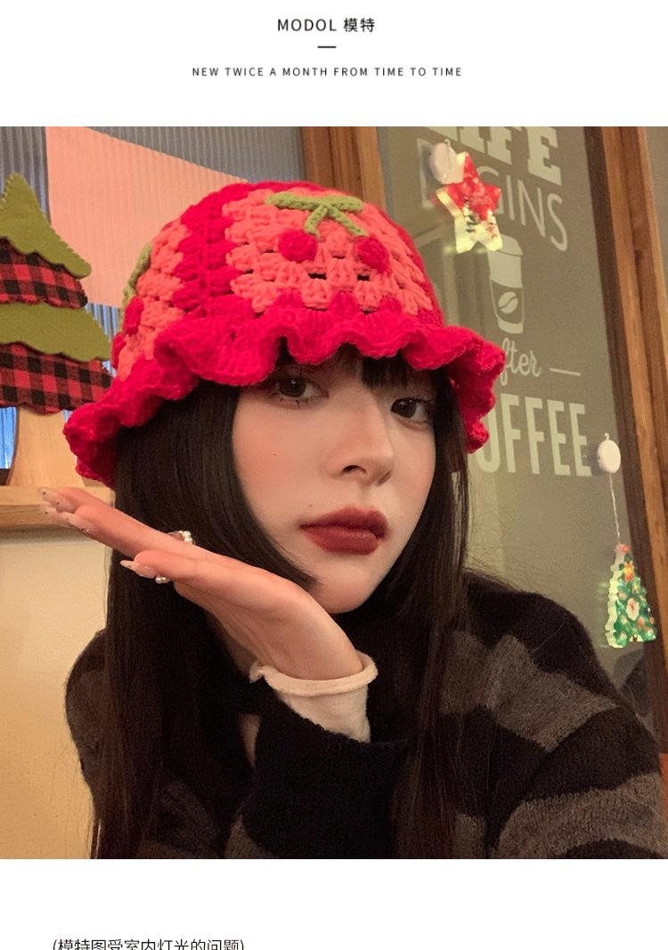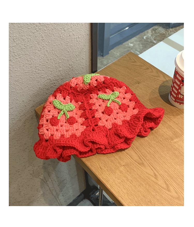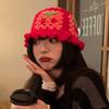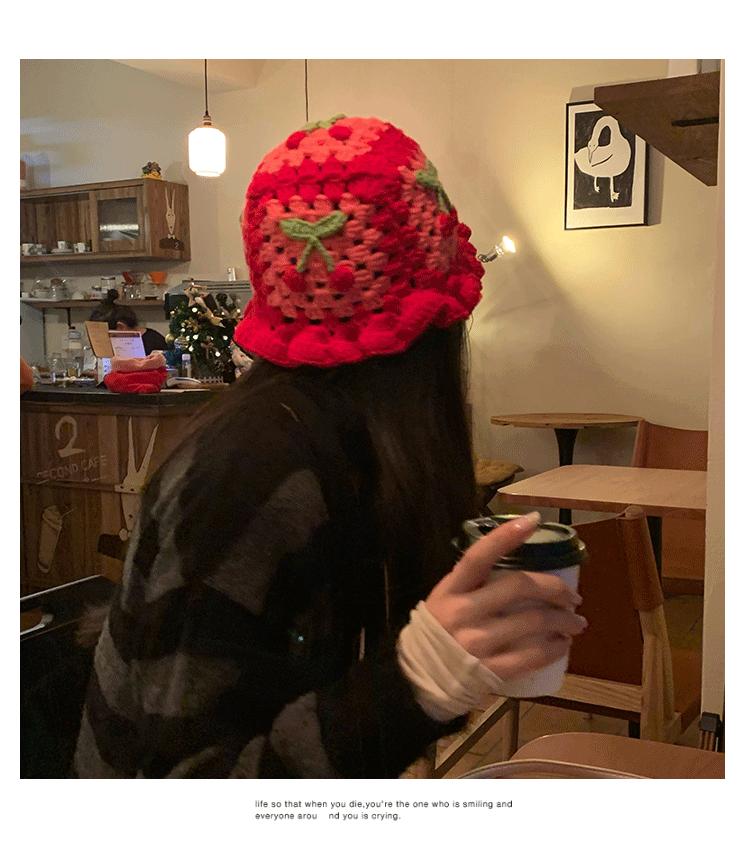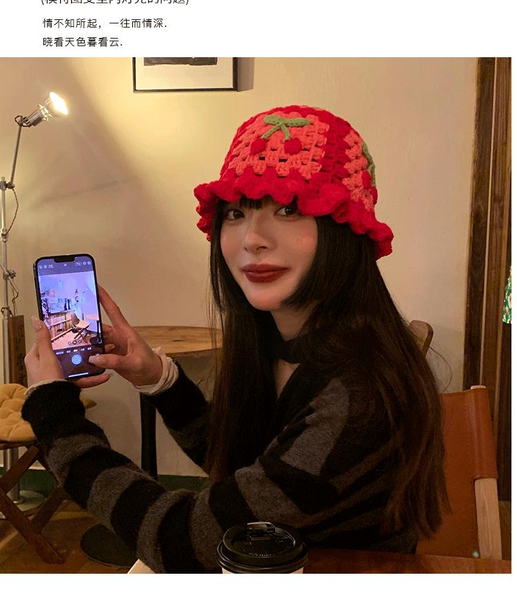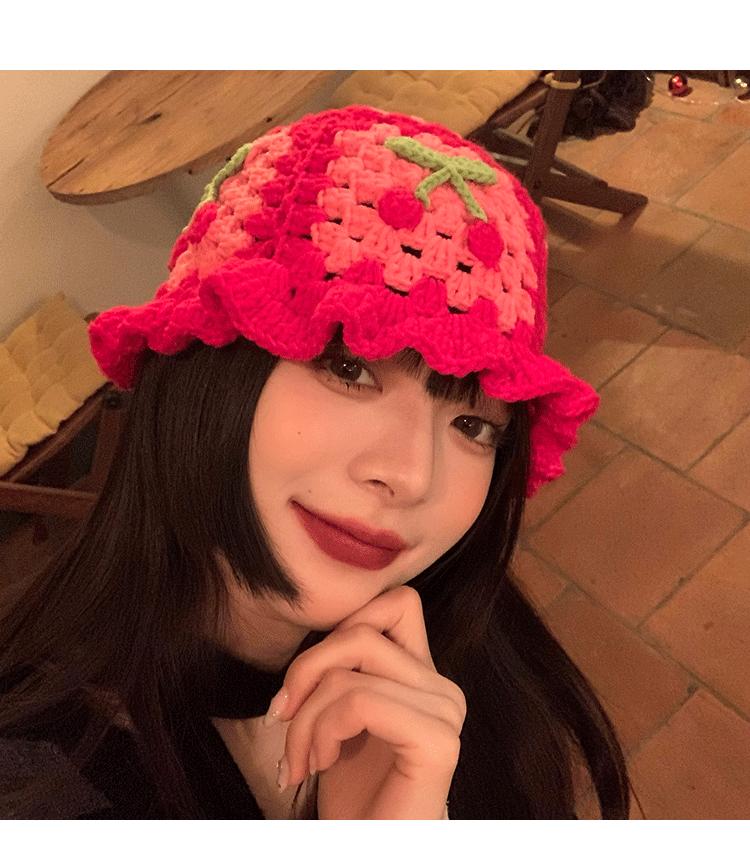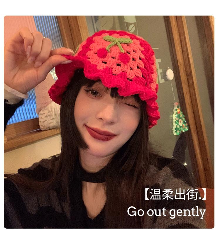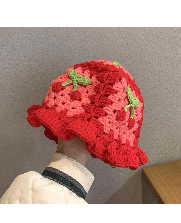 Sombrero de pescador de cerezas, tejido a mano, de lana, bonito y dulce, estilo celebridad, ideal para rostros pequeños.