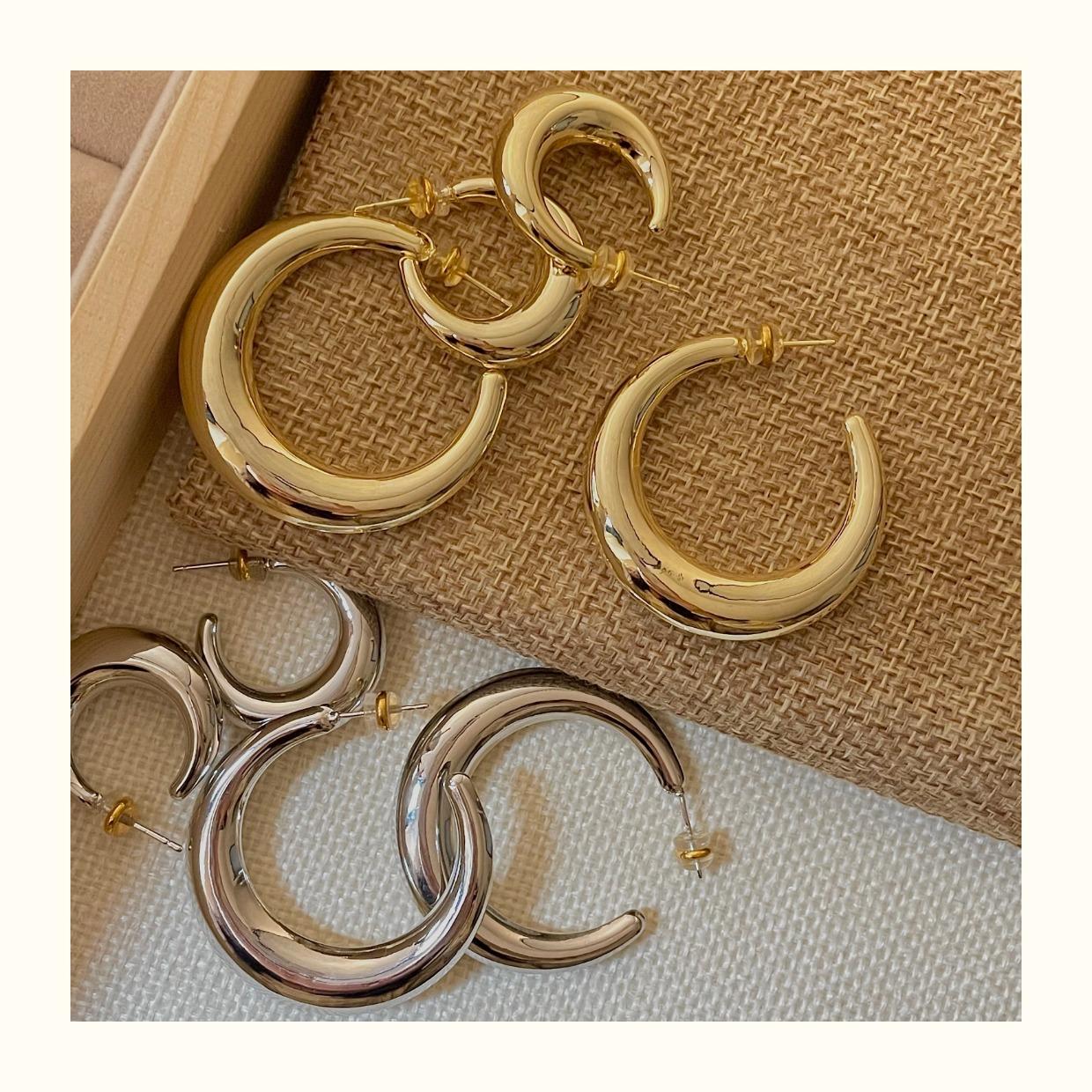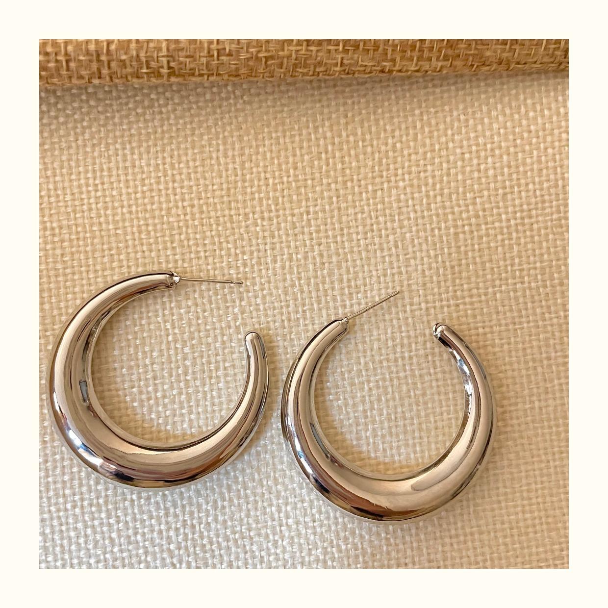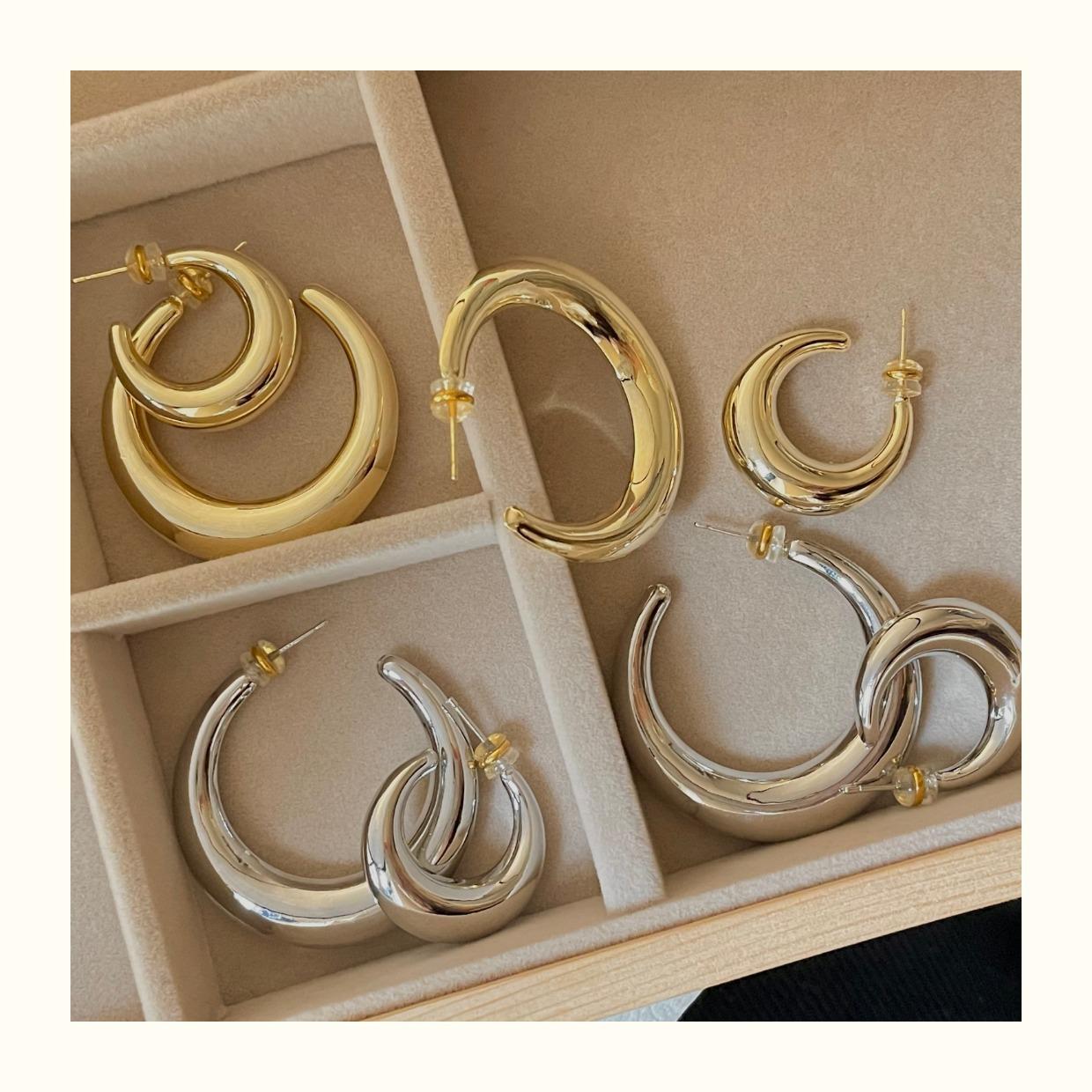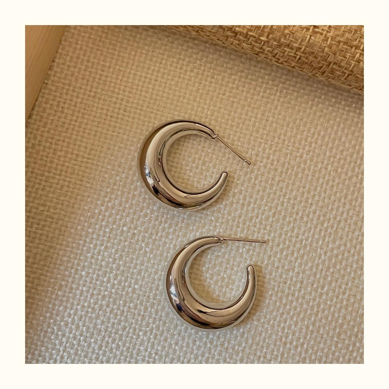 Arete de Aro Metálico Liso Semirredondo de Luna Creciente Simple Elegante Combinable Aretes Grandes Sensación Aretes de Pin Plateados Aretes de Tuerca para Mujer Modernos