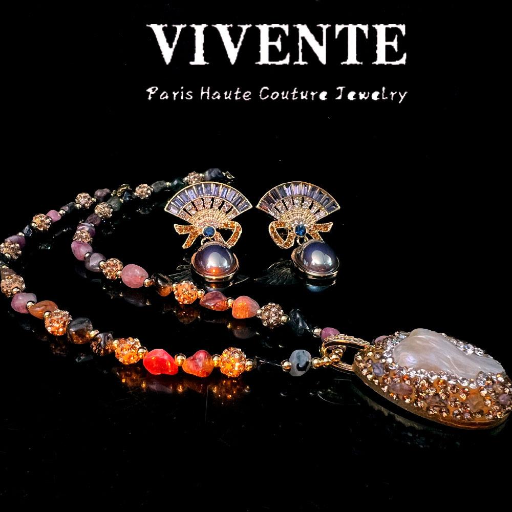 Nuevo collar de piedra cruda barroca natural hecho a mano chino, pendientes vintage en forma de abanico estilo chino chapados en oro auténtico.