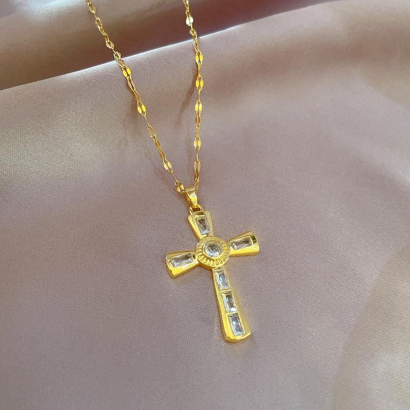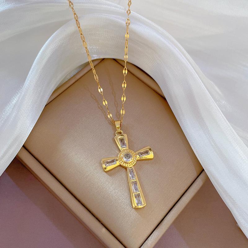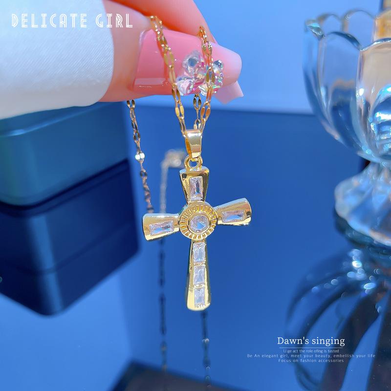 [Acero de Titanio] Lujo Ligero Cruz Minimalista Micro-incrustado Oro Real Collar Cadena Clavícula para Mujer Accesorios Transporter Ins Cyber Rojo