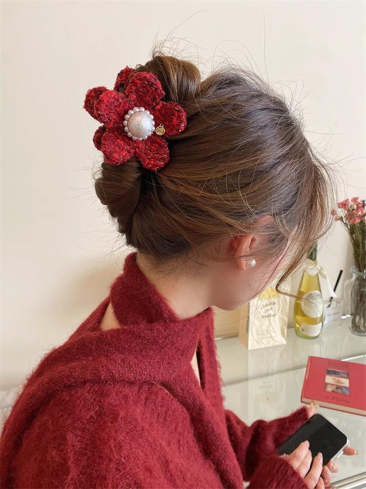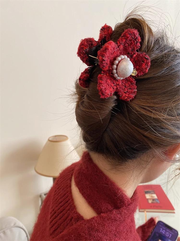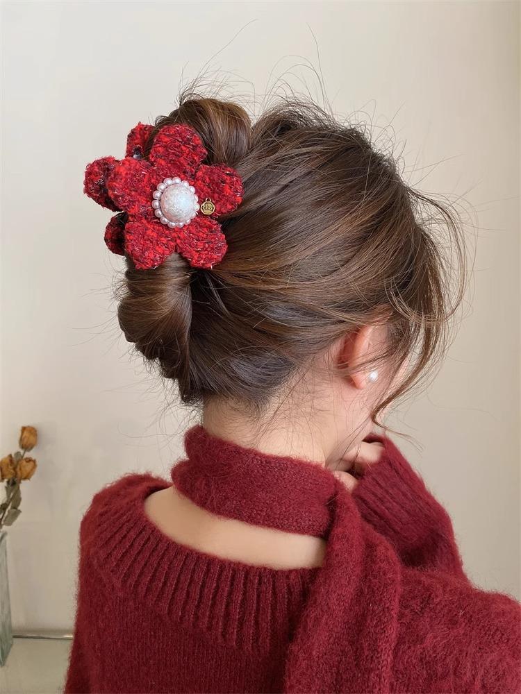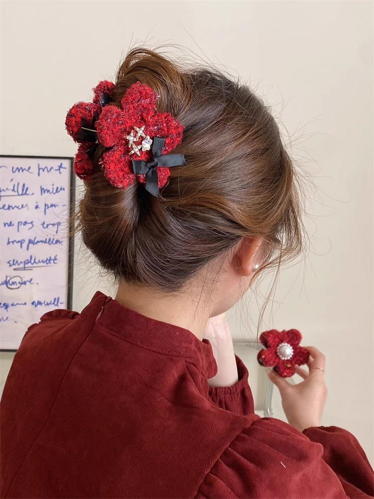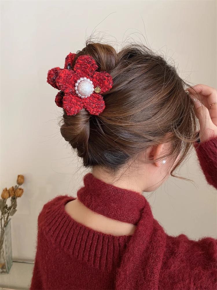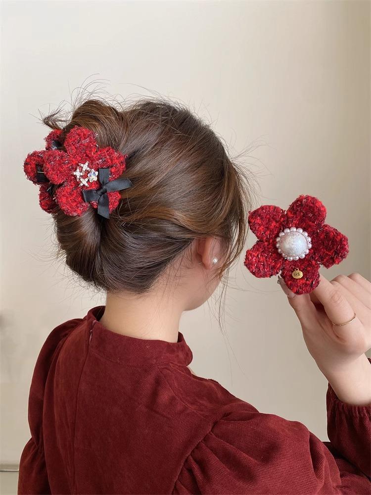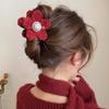 Pinza de pelo de punto con flor roja de Año Nuevo para mujer, temperamento simple, recogido en la espalda, pinza de tiburón, tocado festivo, horquilla para mujer