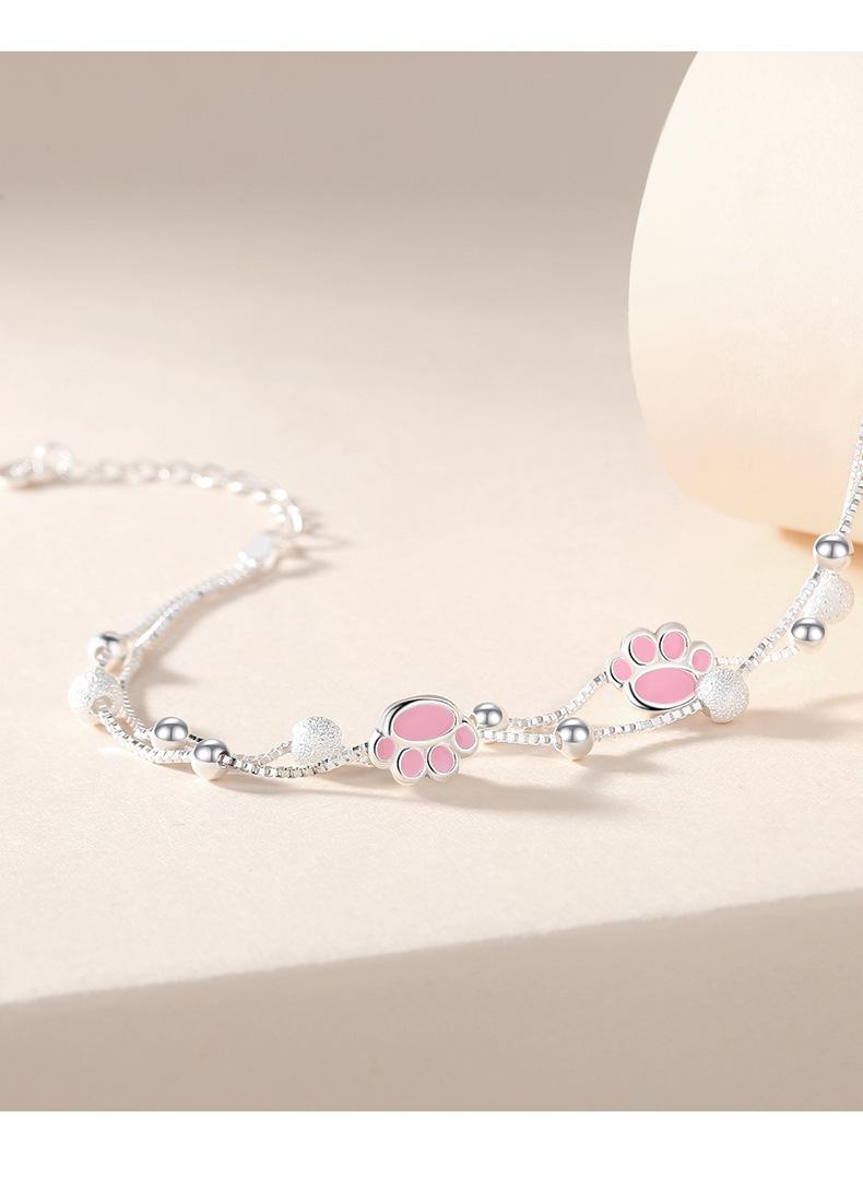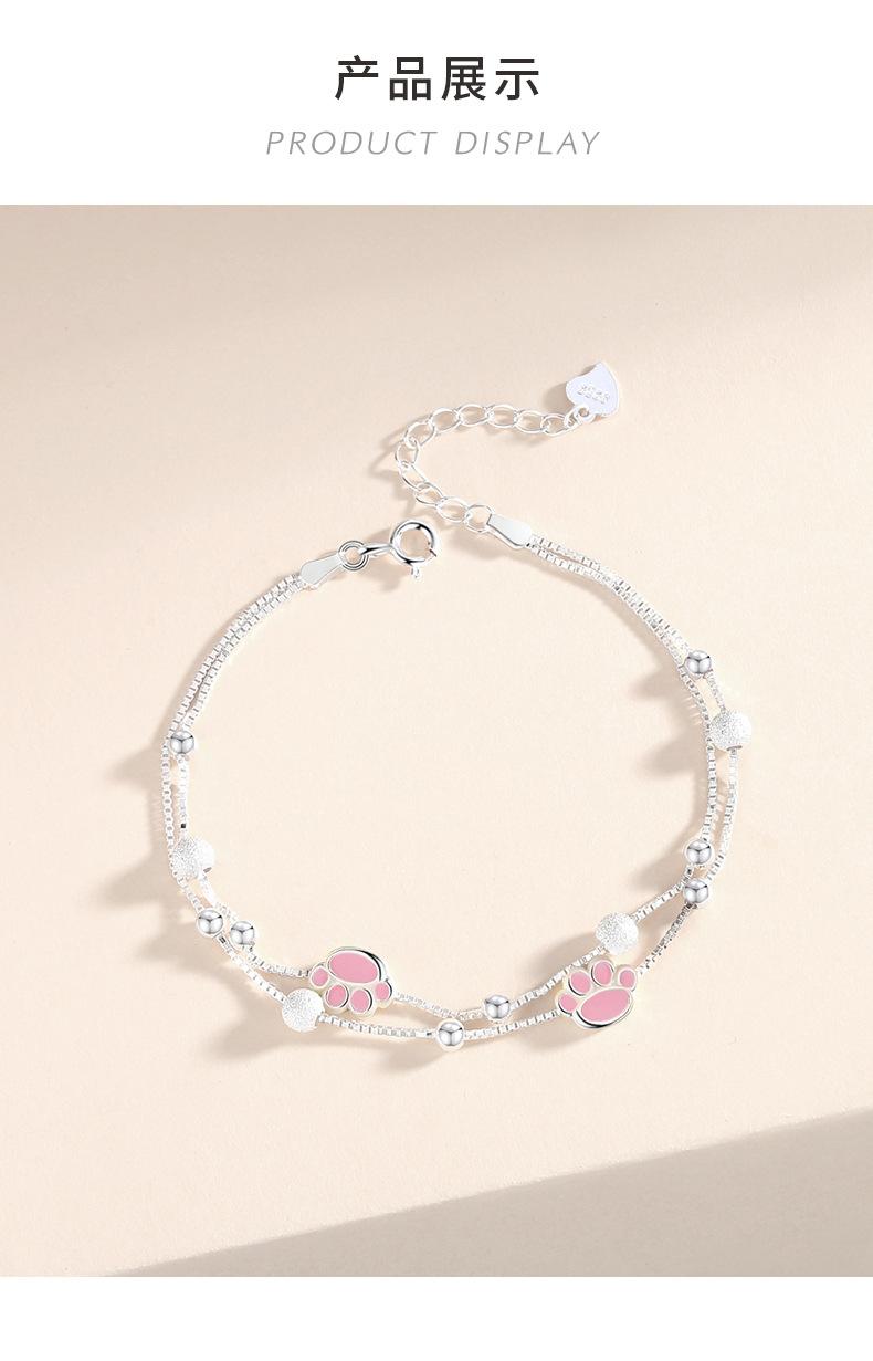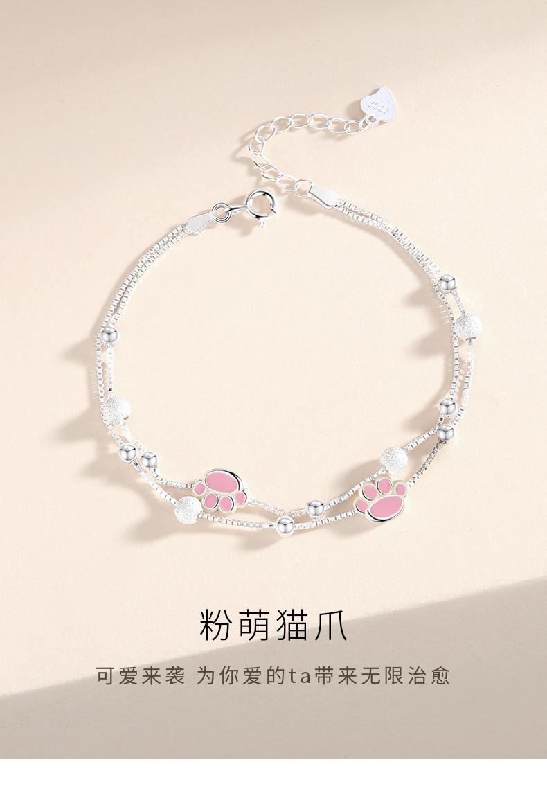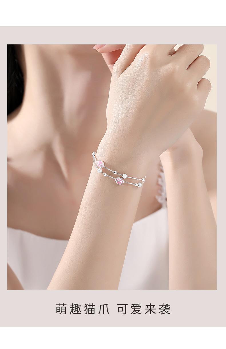 Pulsera de Plata Esterlina S925 con Garra de Gato Rosa para Mujer Pequeña Fresca Bosque Cadena de Caja Doble Capa Pulsera de Cuentas de Bola Corazón de Niña Regalo