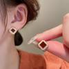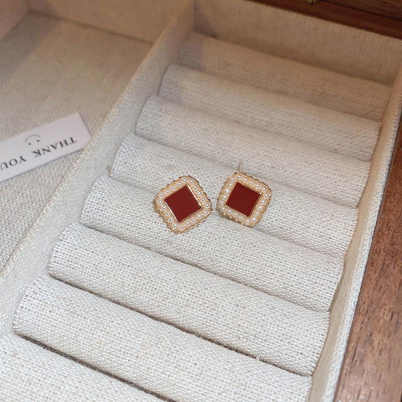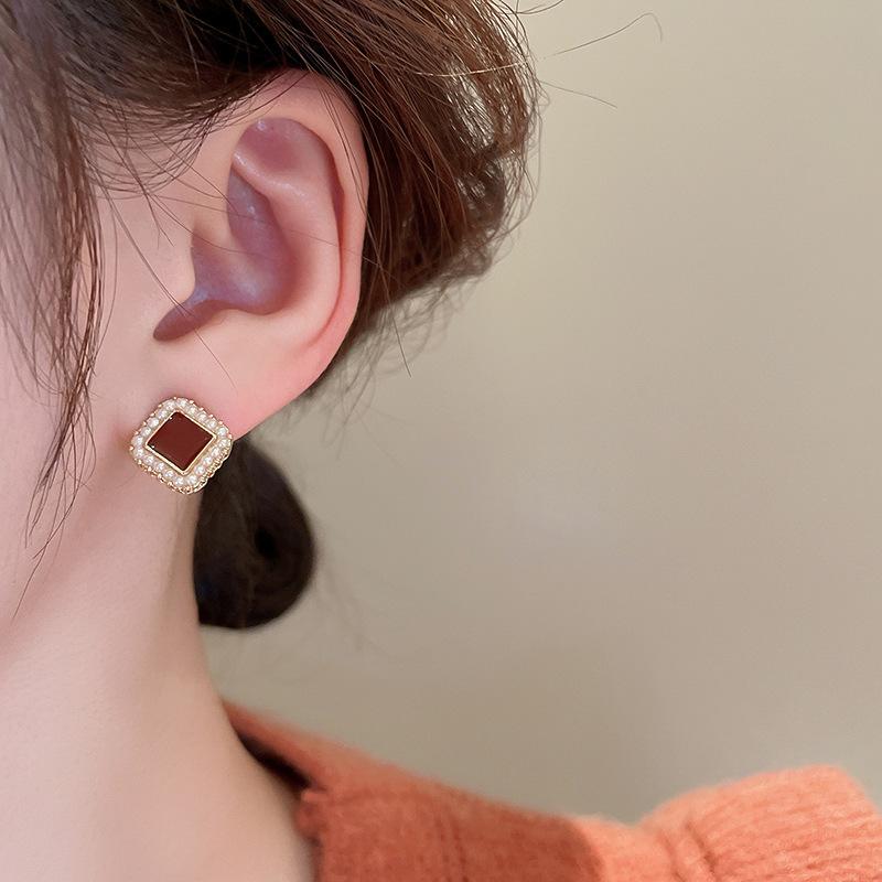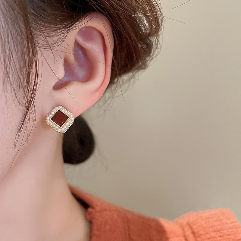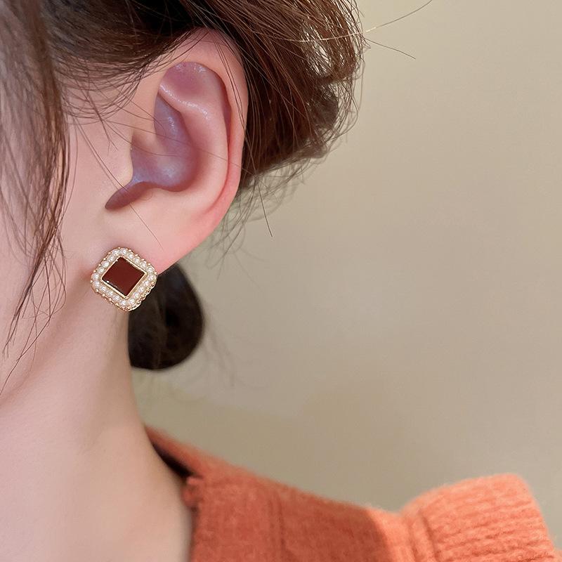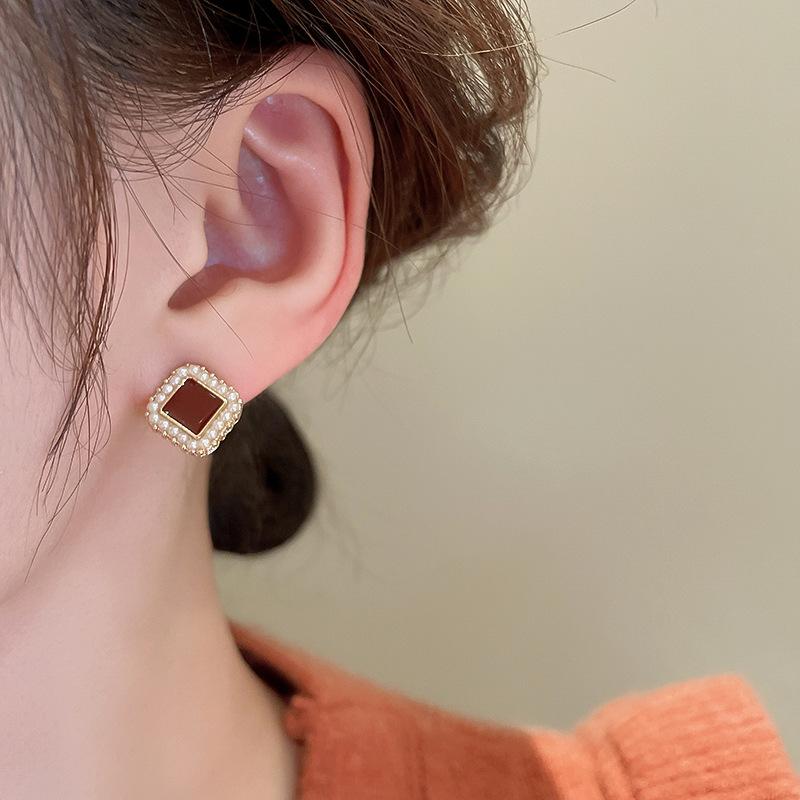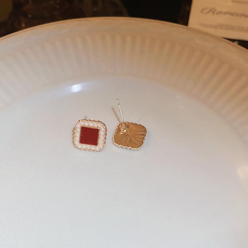 Aretes Retro Compactos Cuadrados con Goteo de Aceite y Perla de Imitación Aguja de Plata Aretes de Moda Francesa Nicho Elegantes de Alta Gama Simples para Mujer