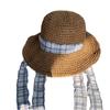 Sombrero de paja con cinta tejida a cuadros azules frescos de estilo japonés para mujer, sombrero grande de viaje de verano, sombrero de playa con protección solar, moderno