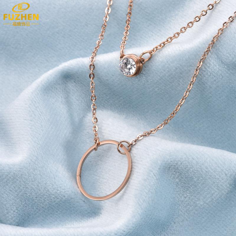 Collar de doble capa con colgante de anillo de diamantes de imitación de circonita con círculo geométrico redondo de acero inoxidable sencillo de moda europea y americana para mujer