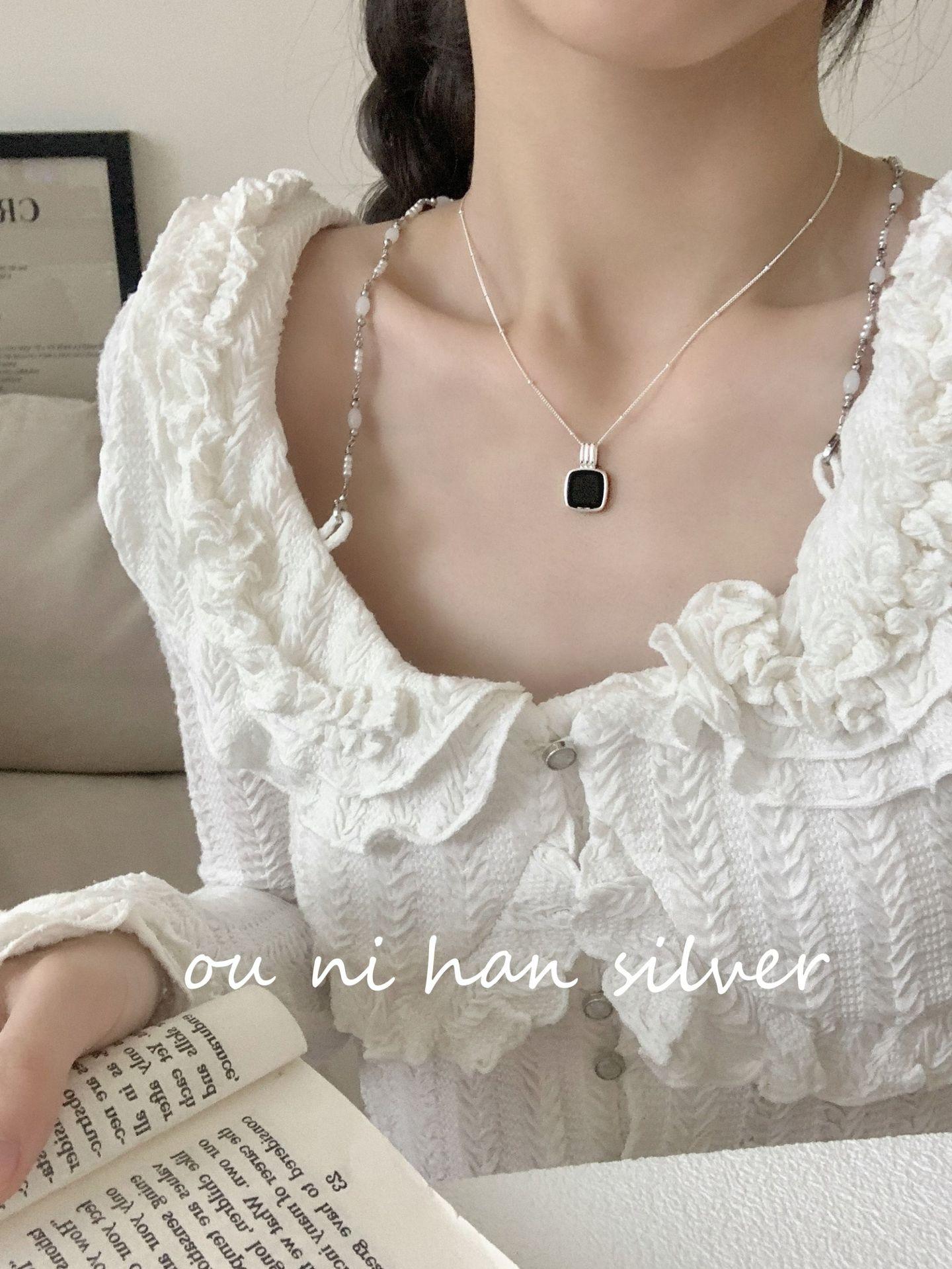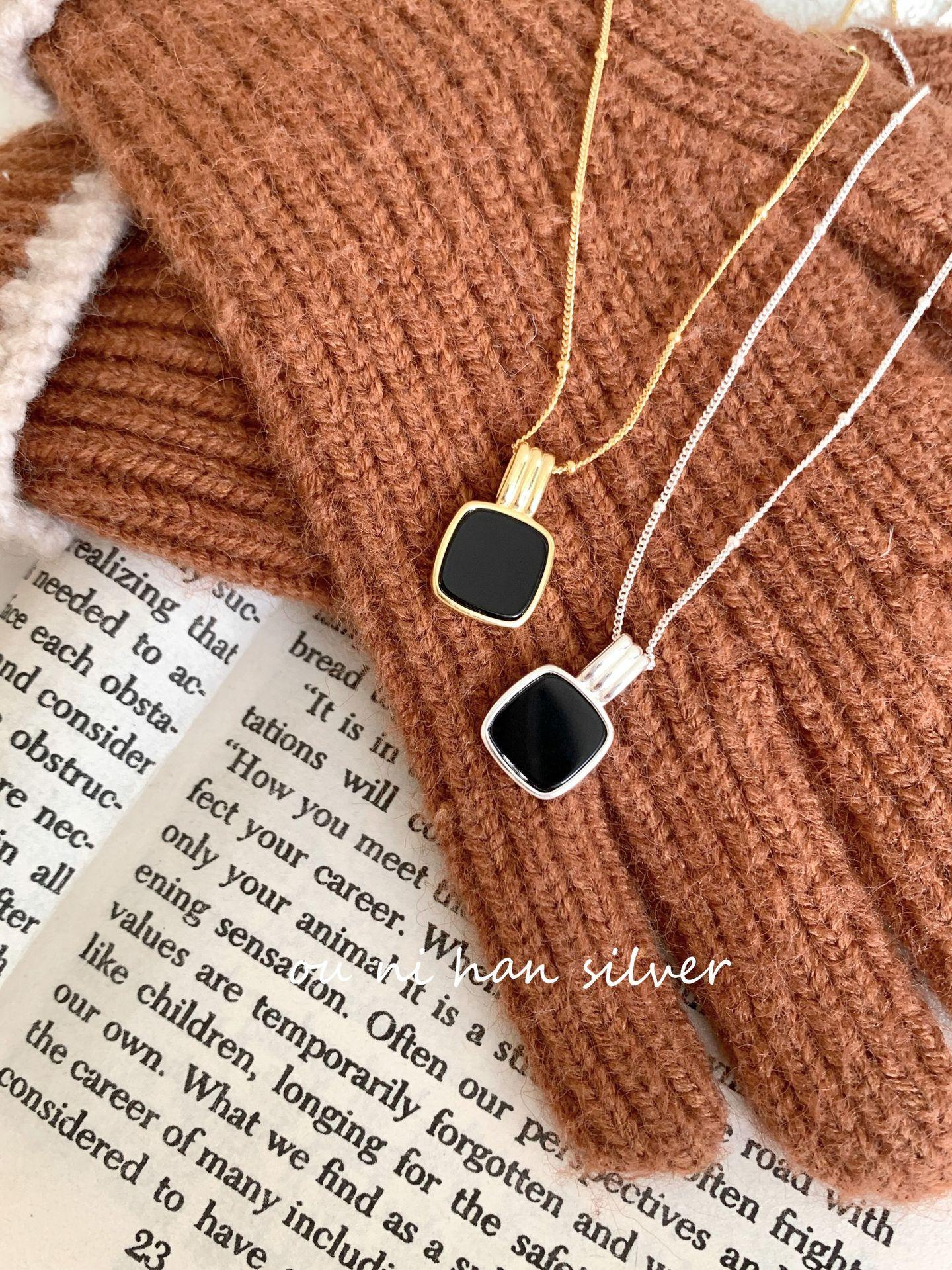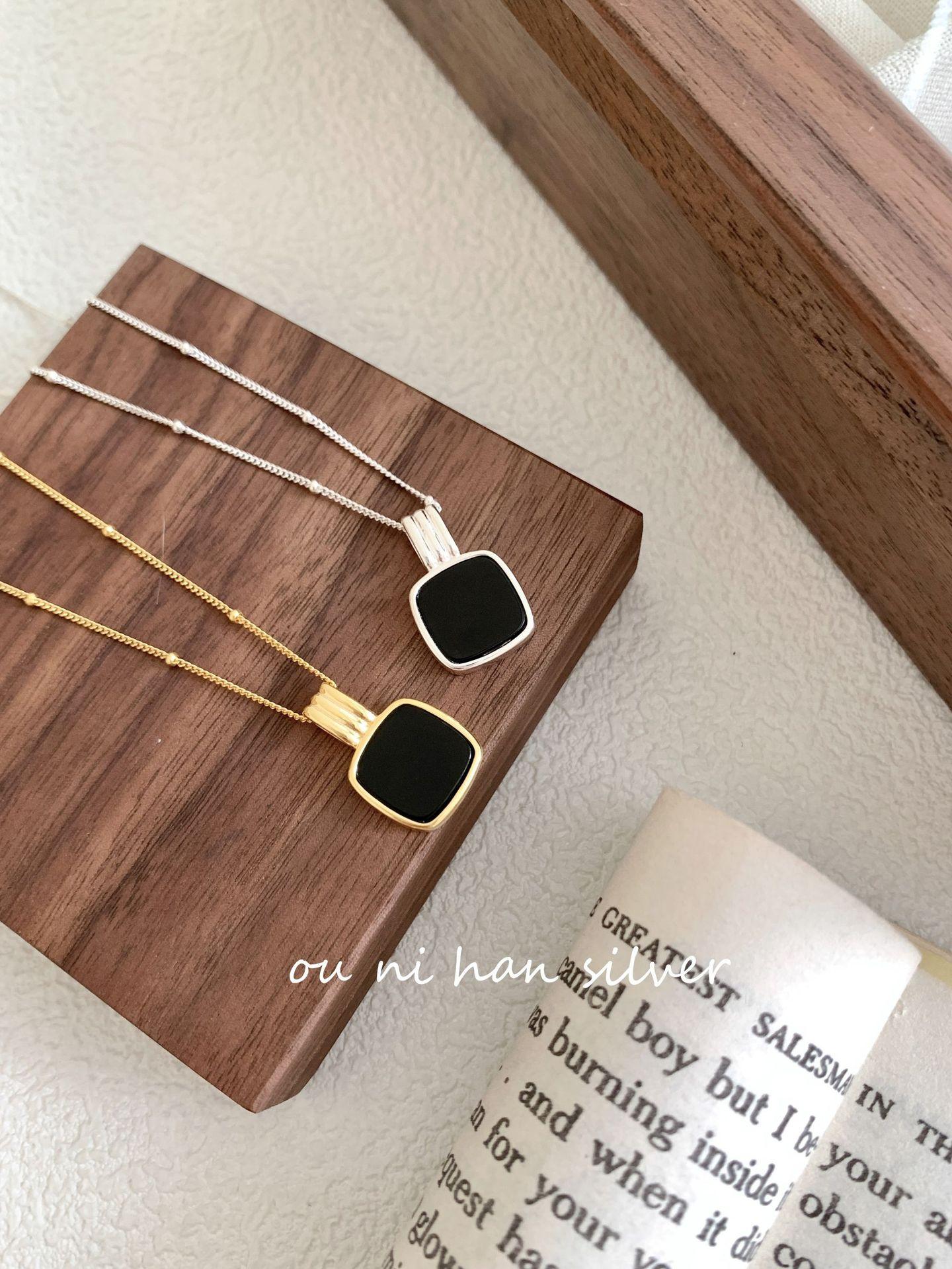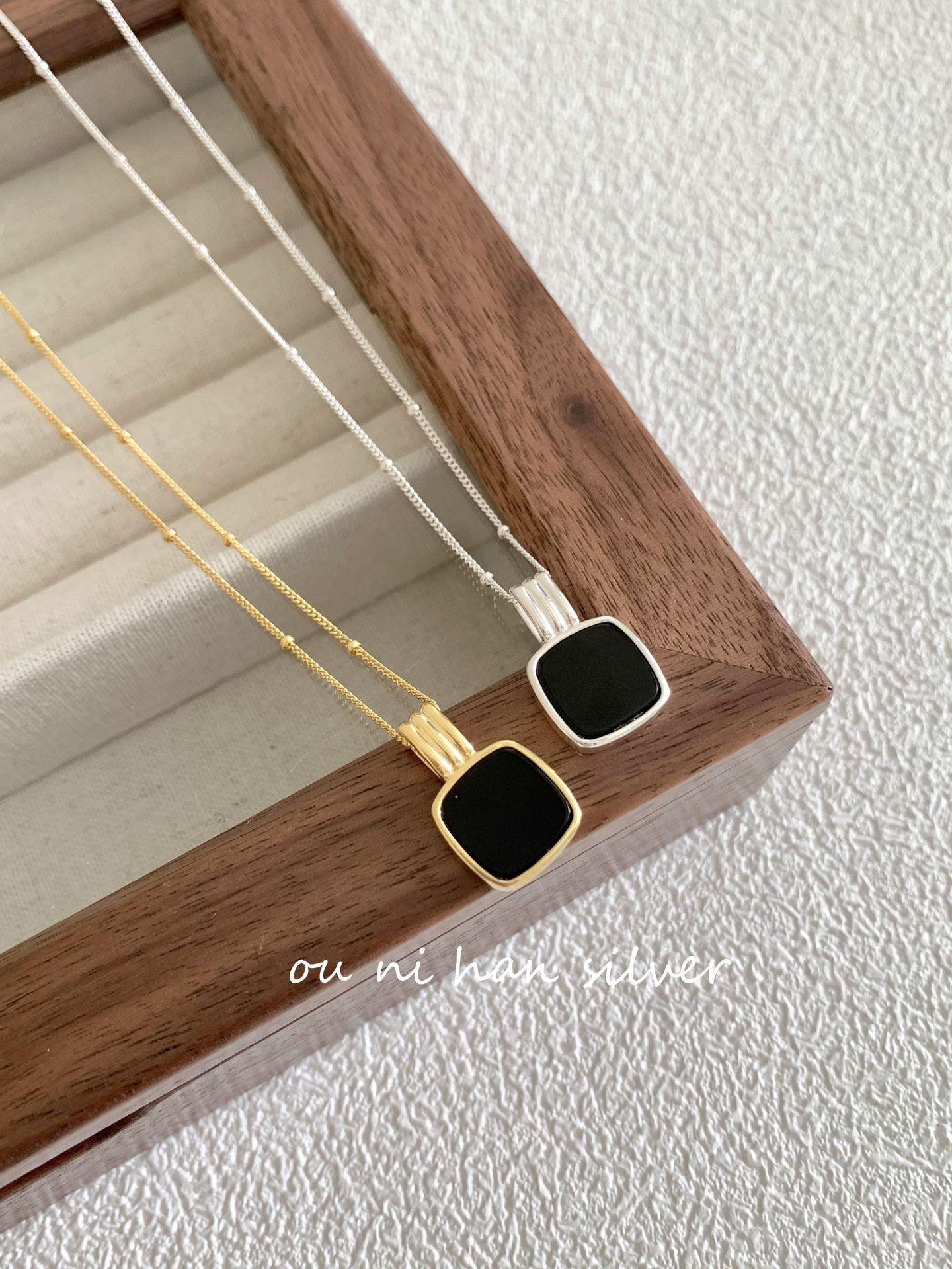 Collar con colgante cuadrado geométrico de ágata negra con diseño de nicho simple de plata esterlina S925 de Oni, cadena de clavícula estilo ins para mujer