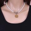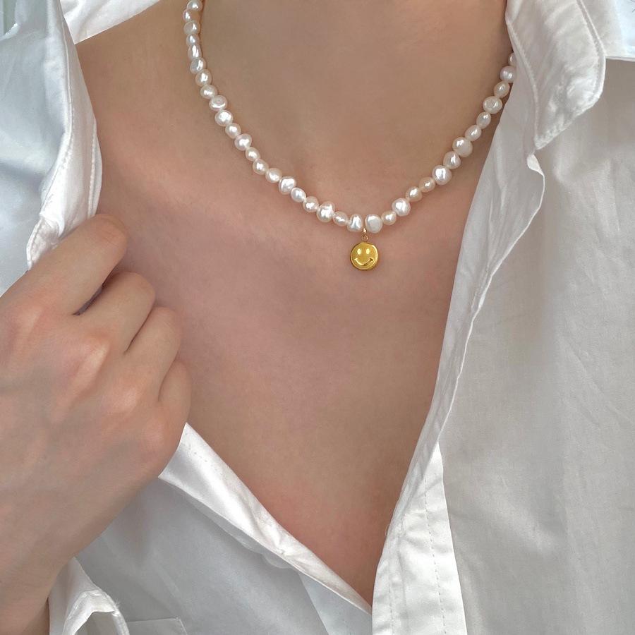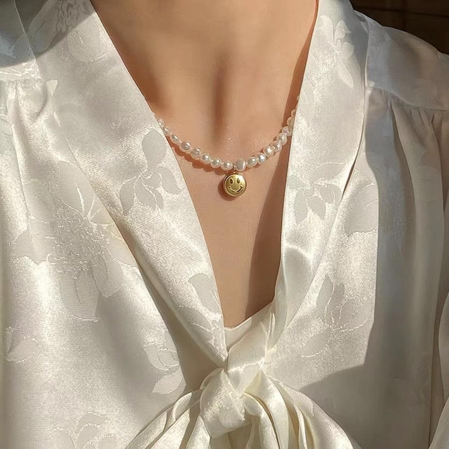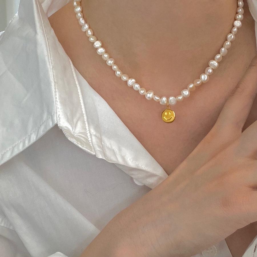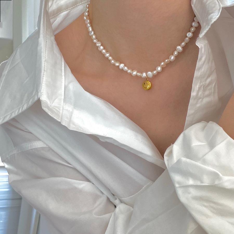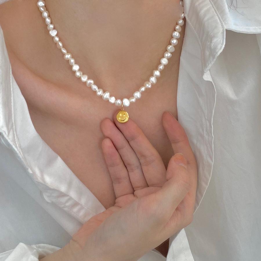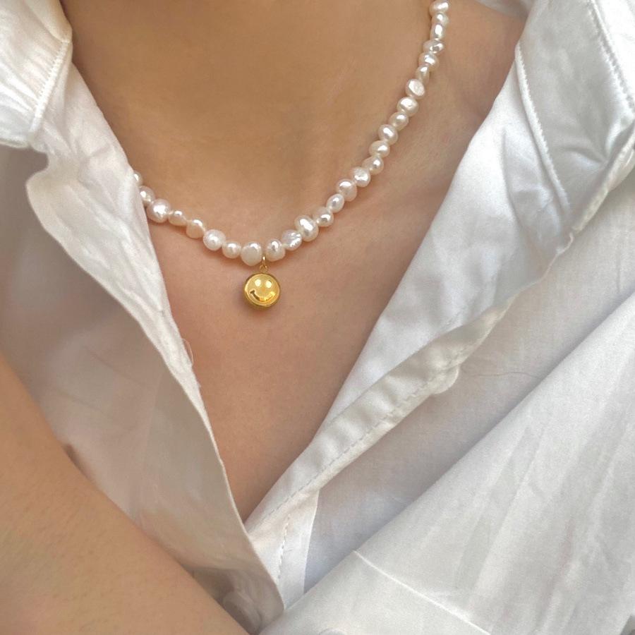 Collar de perlas barrocas de agua dulce con colgante de cara sonriente, cadena de clavícula de estilo coreano, elegante cadena de acero de titanio para mujer.