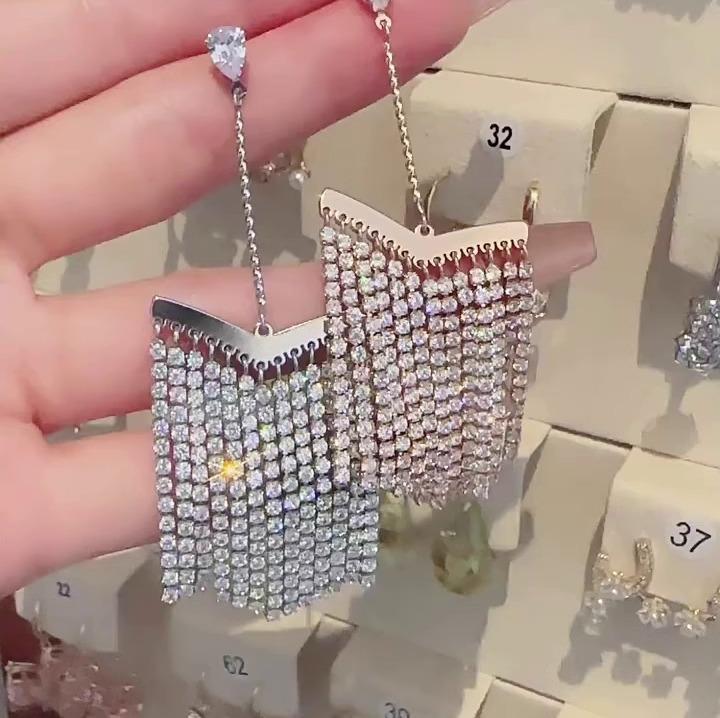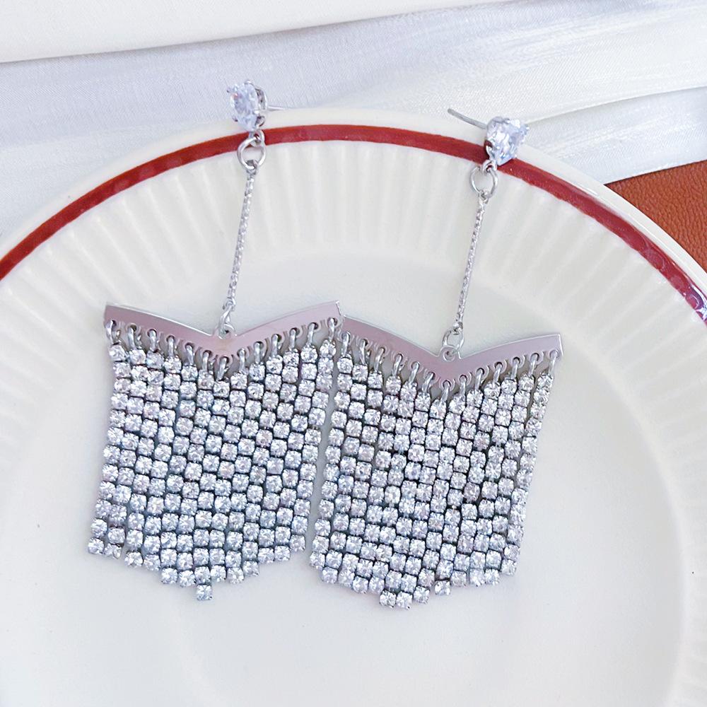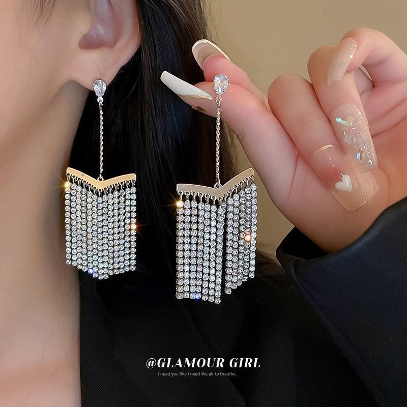 Pendientes geométricos de borlas de diamantes flash, lujo ligero, temperamento de alta gama, pendientes largos, sentido del diseño de nicho, pendientes europeos y americanos para mujer