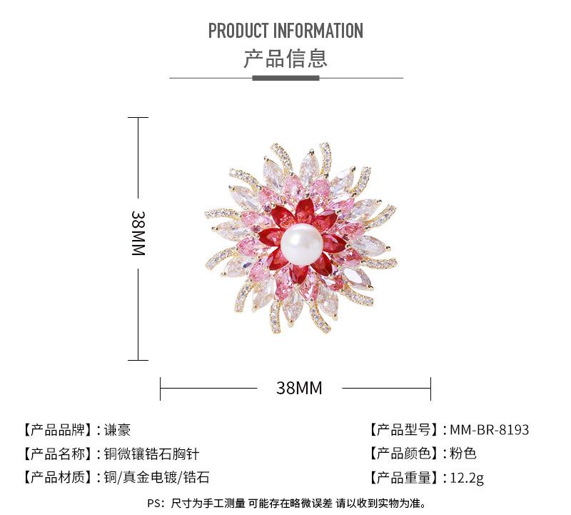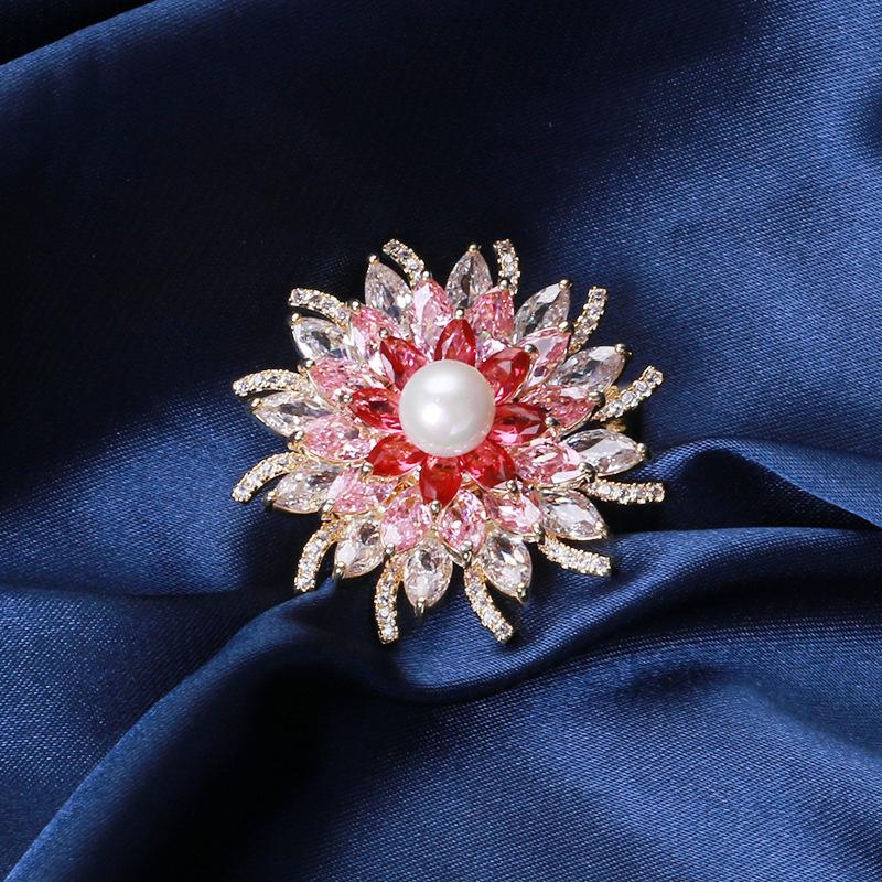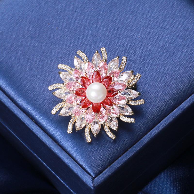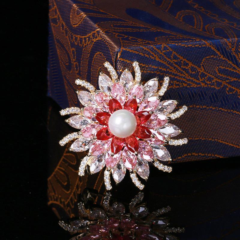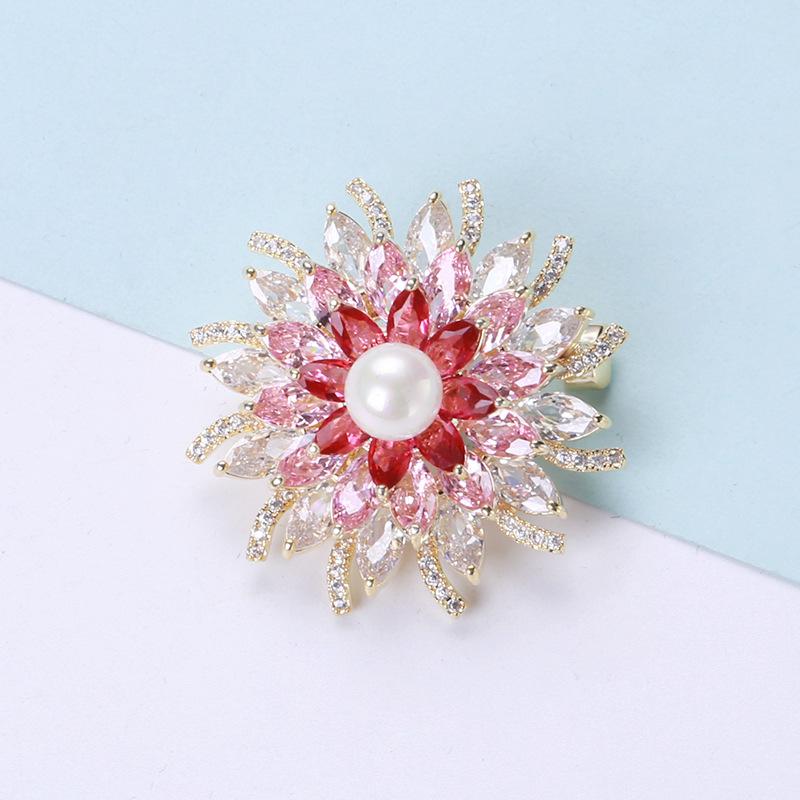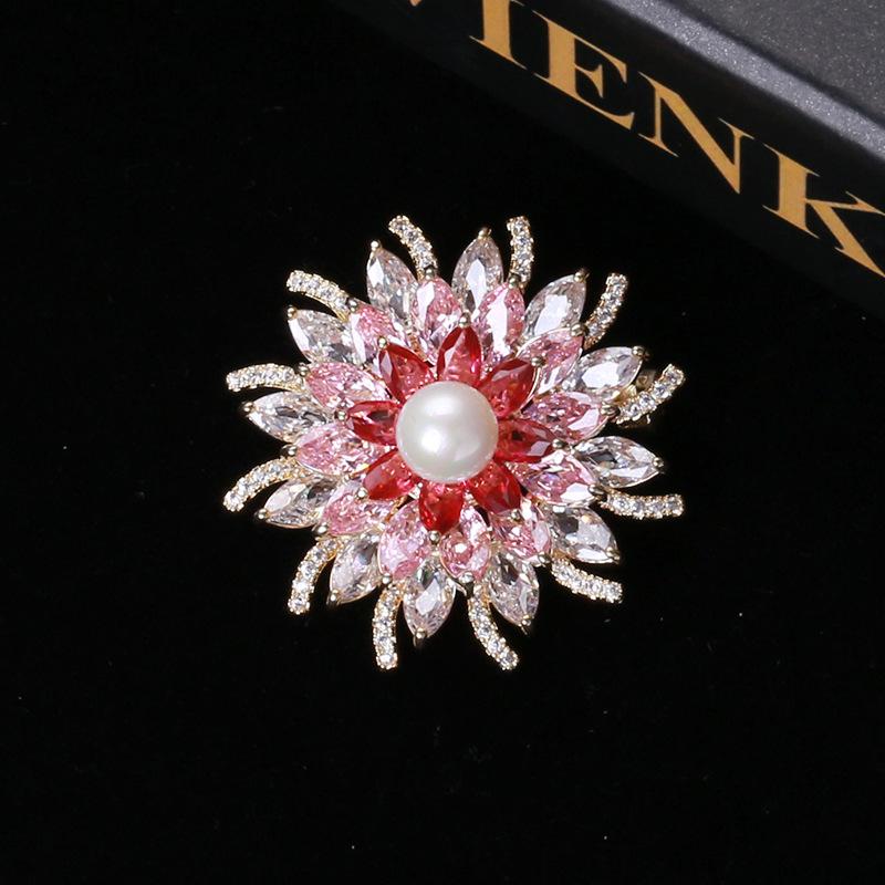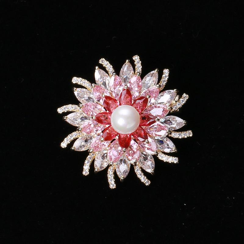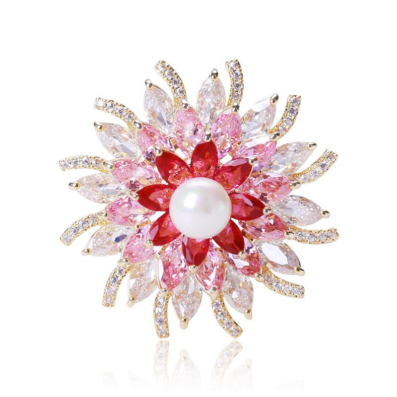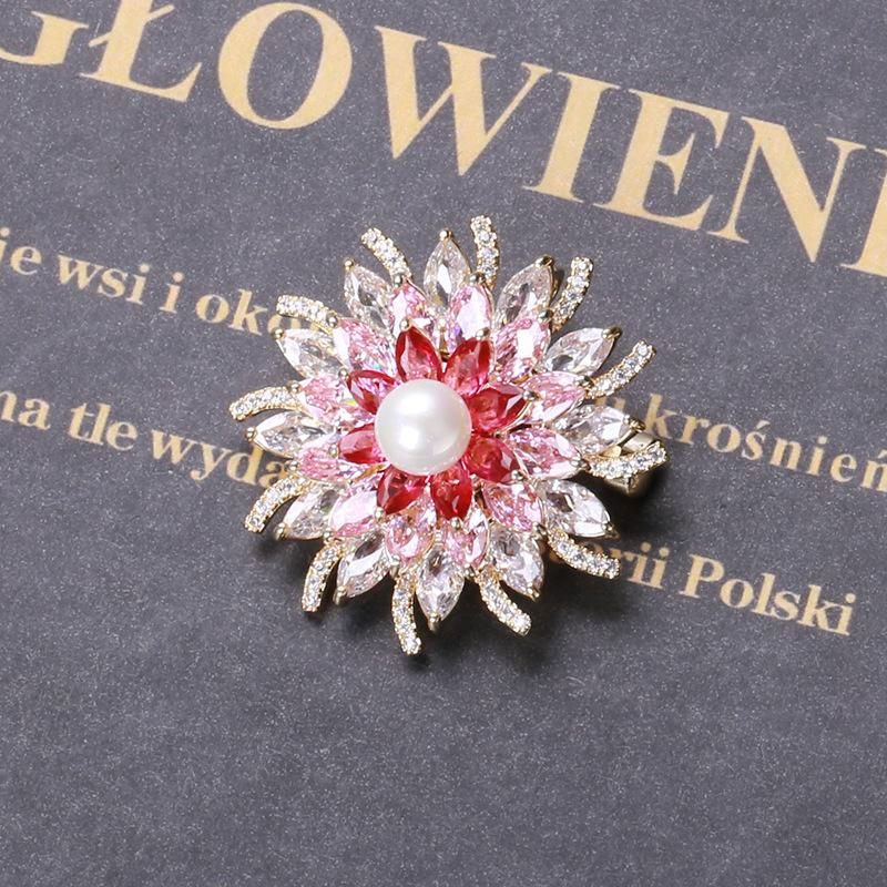 Broche de flor estéreo con perla de circón microincrustada brillante de estilo japonés y coreano, elegante broche para abrigo, suéter, joyería