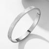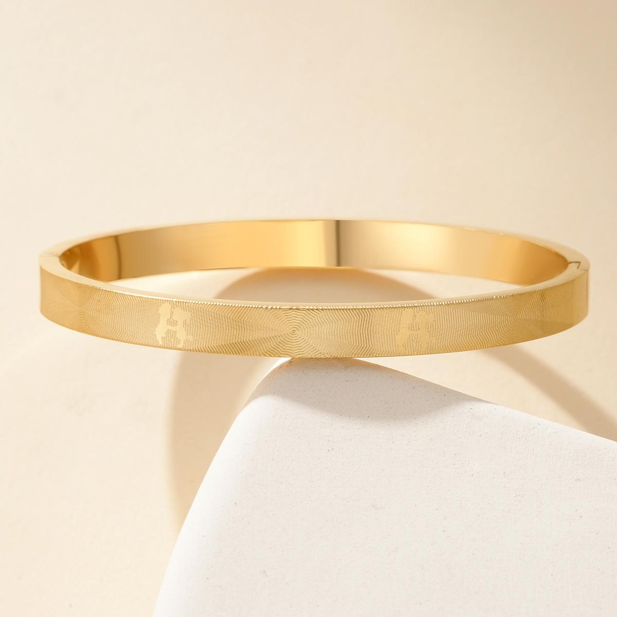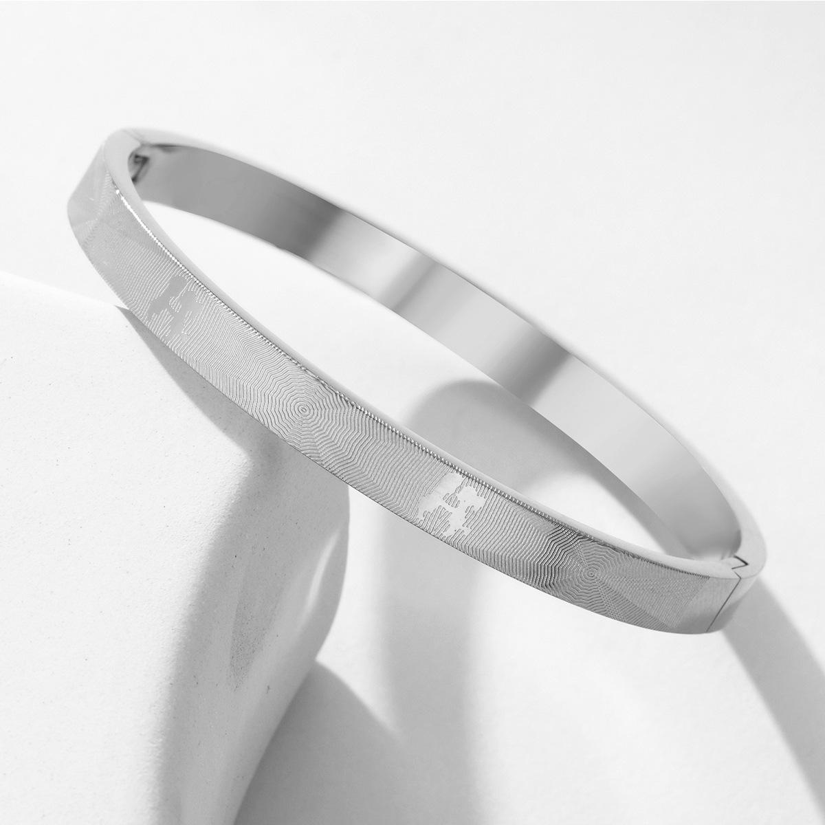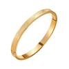 Fabricantes de pulseras de acero de titanio al por mayor, pulsera ajustable abierta en forma de C, pulsera femenina de acero inoxidable con logotipo de texto grabado.