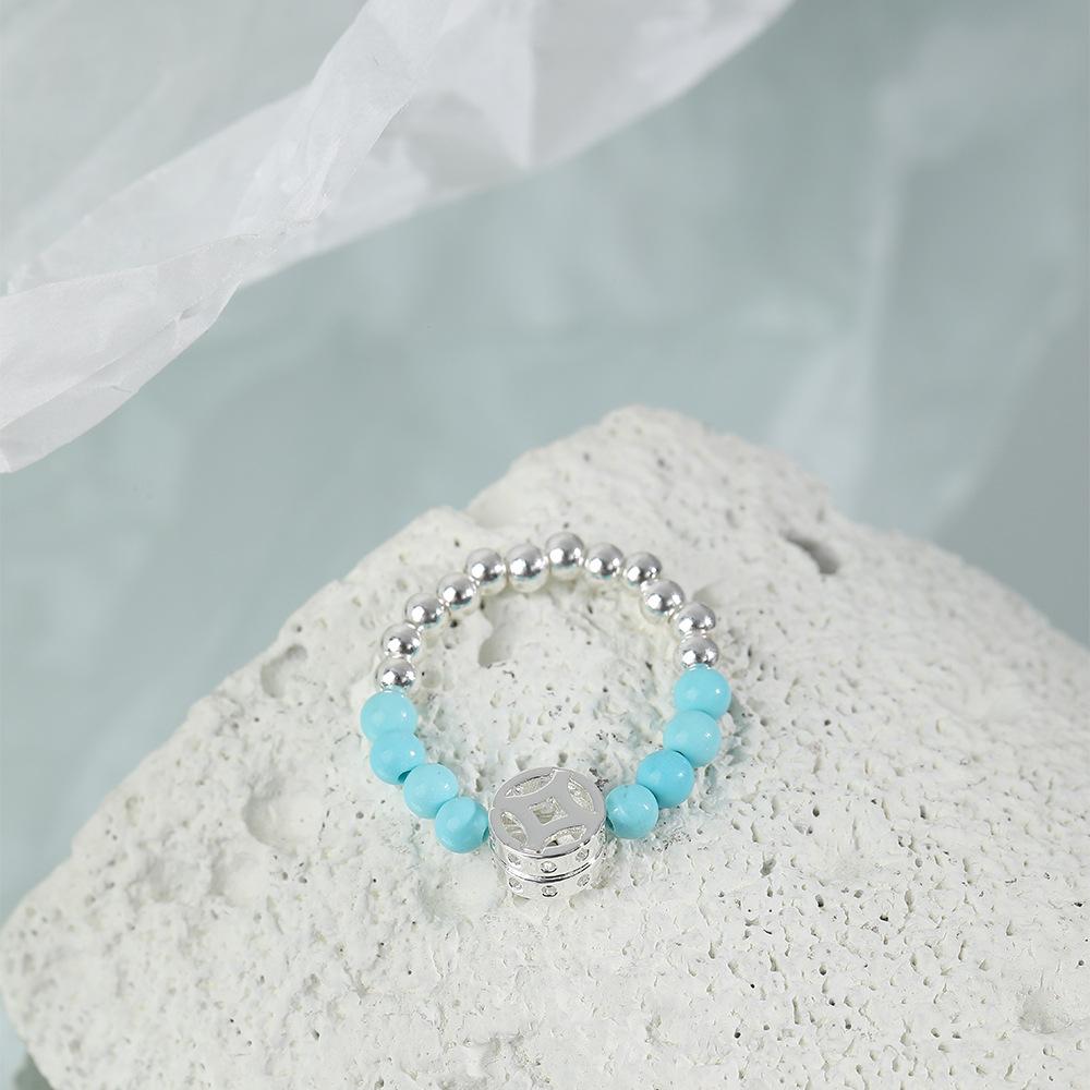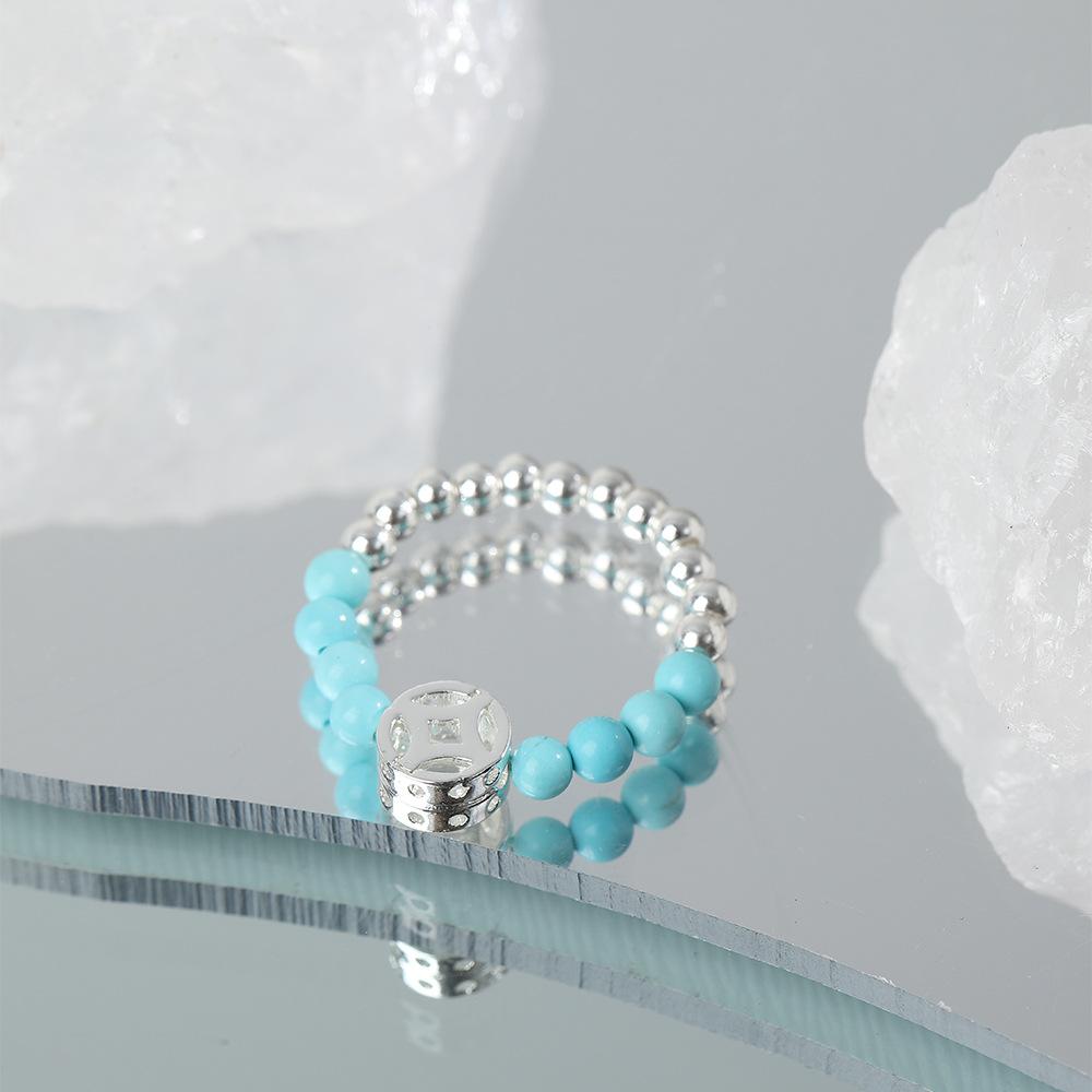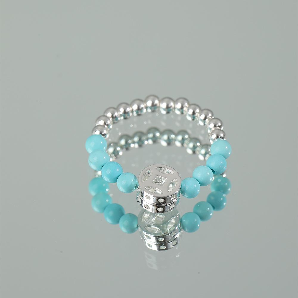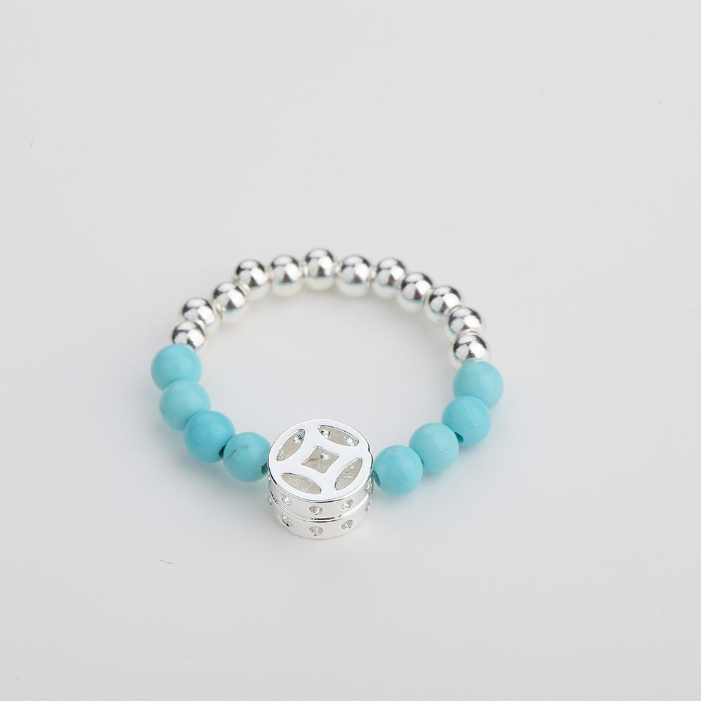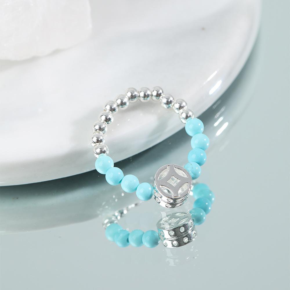 Anillo elástico con moneda de turquesa azul, anillo sencillo de cuentas de cobre pequeñas para mujer, estilo nacional, joyería de tamaño libre al por mayor.