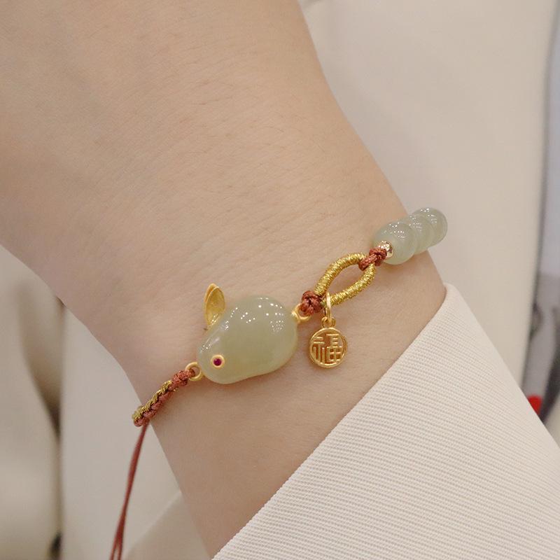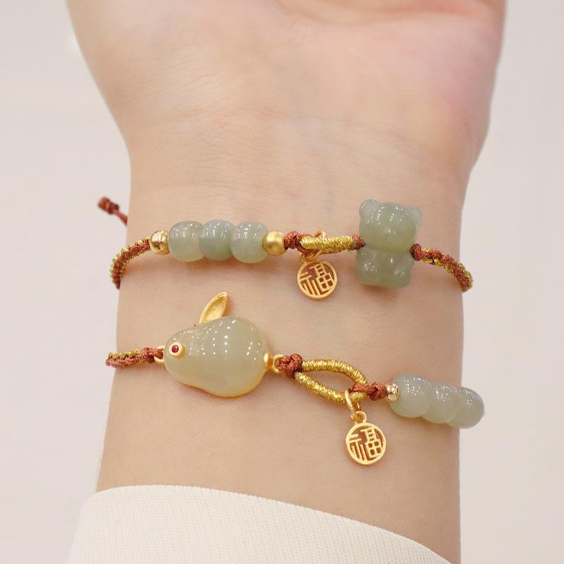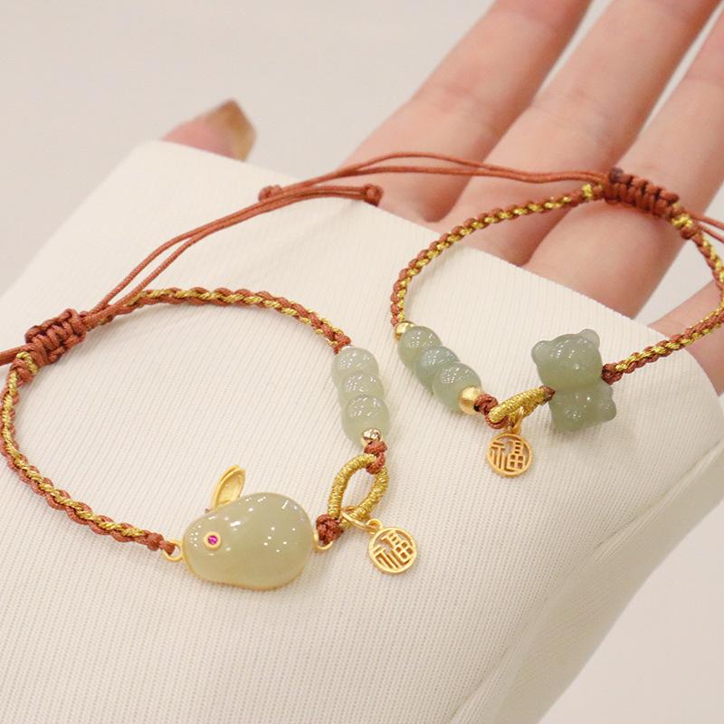 Hand-woven natural Hetian jade silver rabbit bracelet, Hand-woven natural Hetian jade bear bracelet