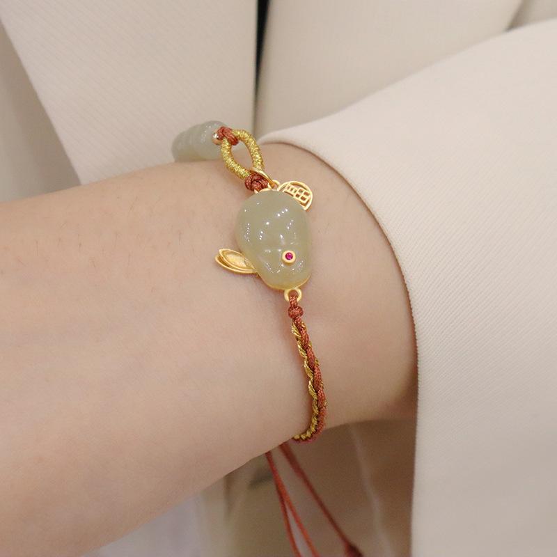 Pulsera de jade hetiano de estilo chino para mujer, de plata de ley, con forma de conejo Fu, anillo único tejido a mano, cuerda roja, regalo, joyería al por mayor