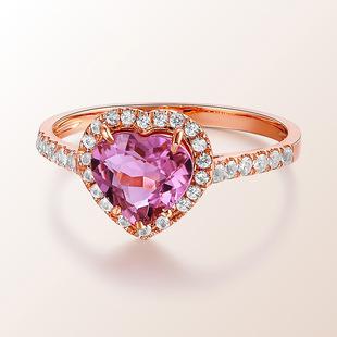 Anillo abierto de turmalina rosa simulada con forma de corazón y diamante, chapado en cobre y oro rosa de 18 quilates, para mujer, con diamante rosa de 2 quilates.