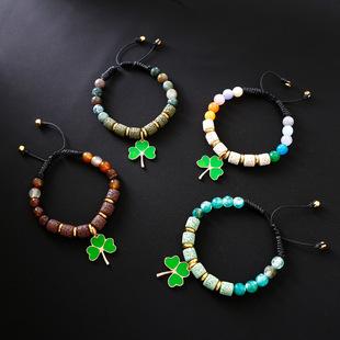 Pulsera de trébol de piedra volcánica con cuentas para mujer, pulsera bohemia de hoja de piedra natural de amatista, ágata, cristal fresaOrdene ahora