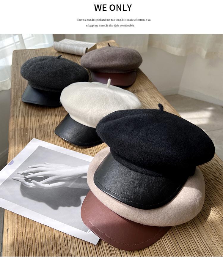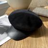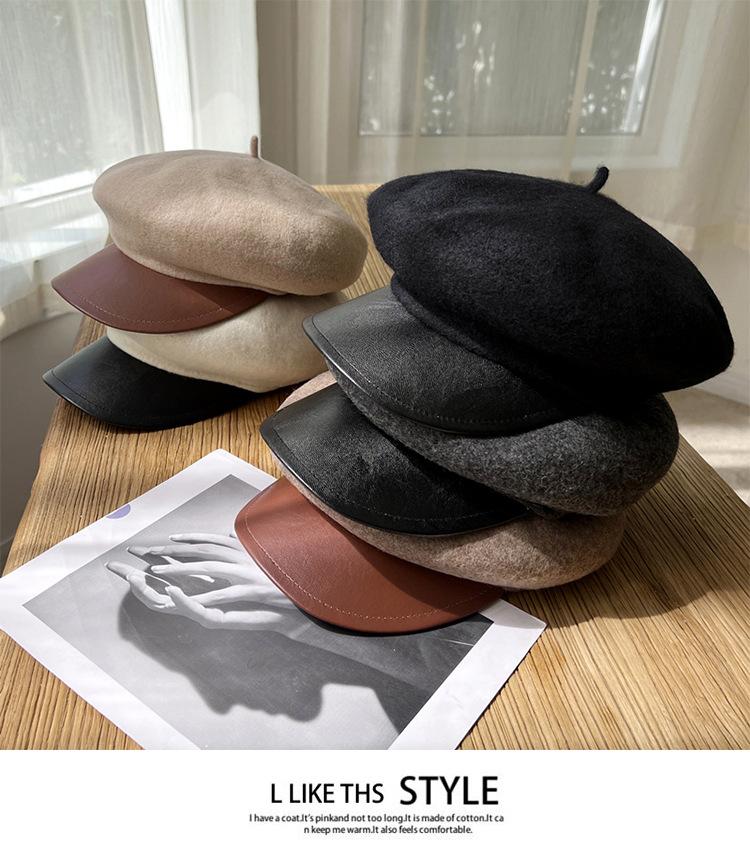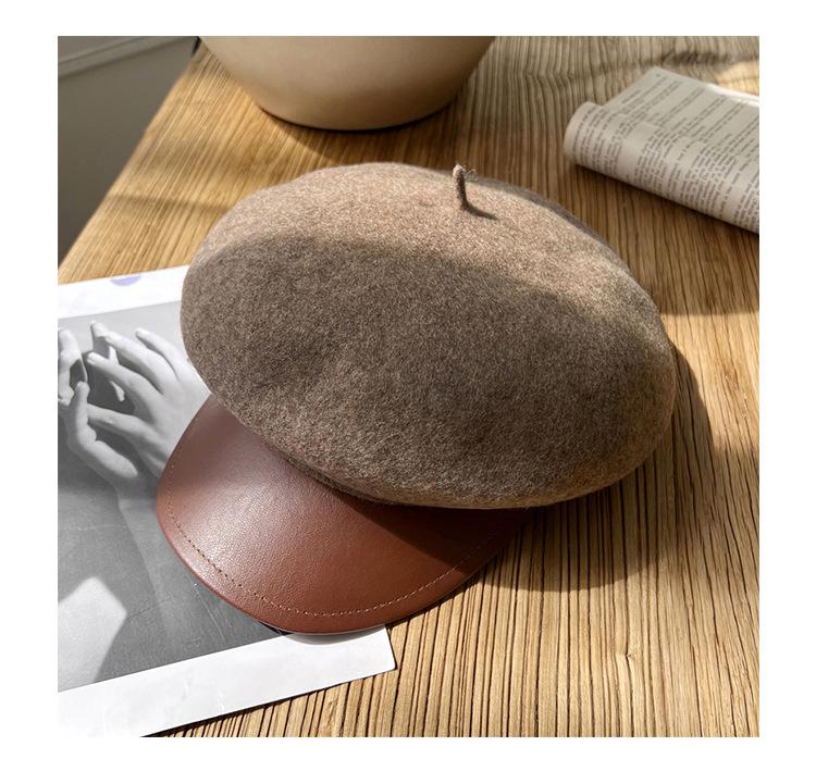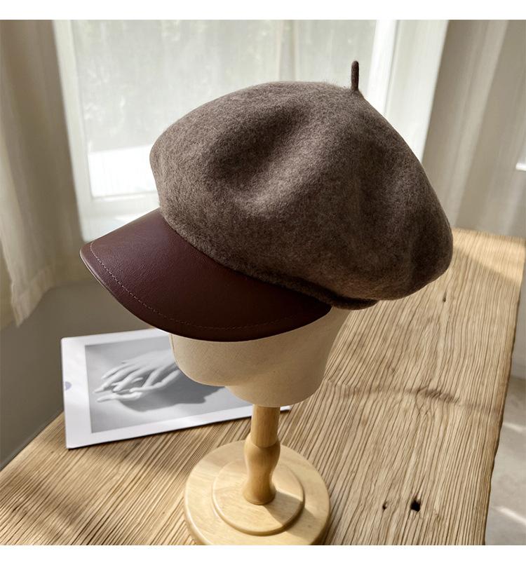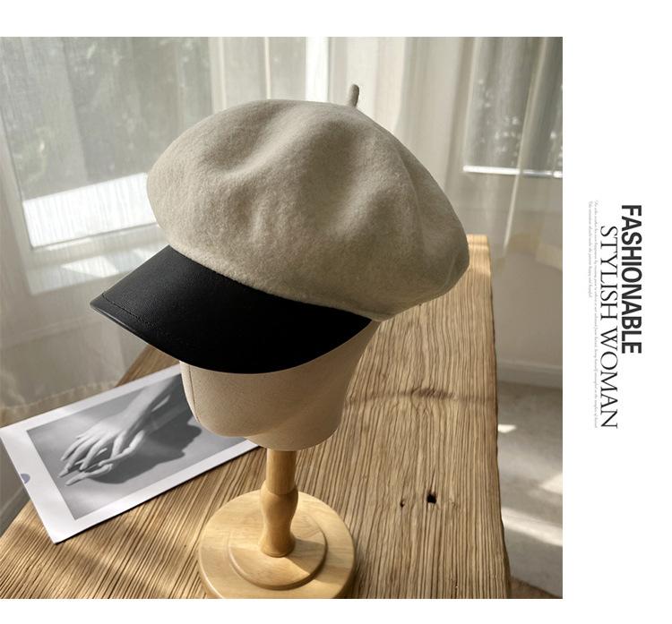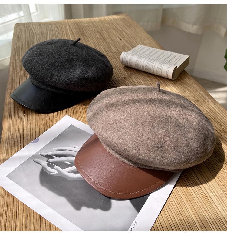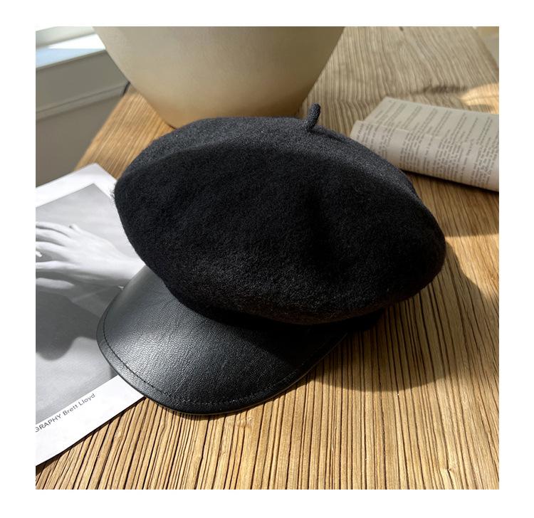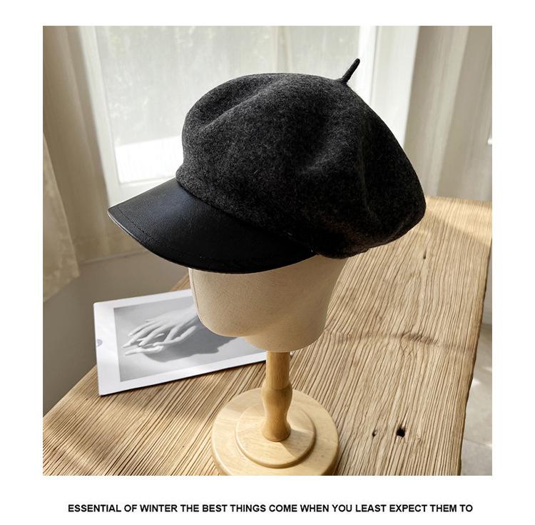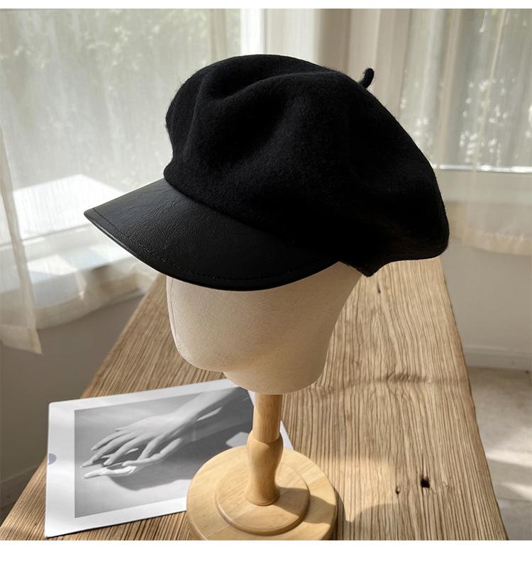 Boina de lana con ala de cuero para mujer, gorro octogonal de lana estilo coreano retro, elegante y sencillo, para otoño e invierno.
