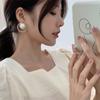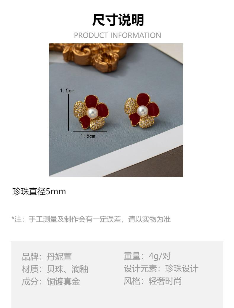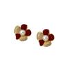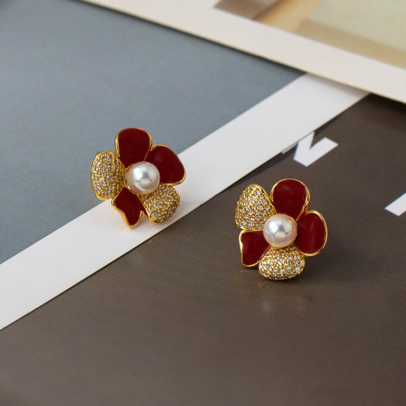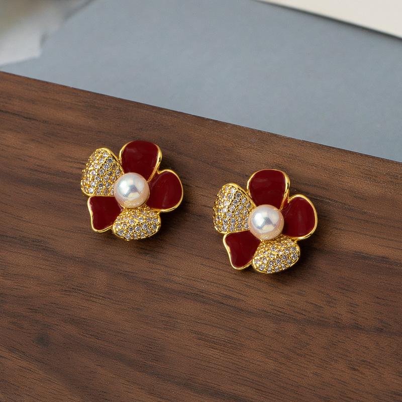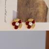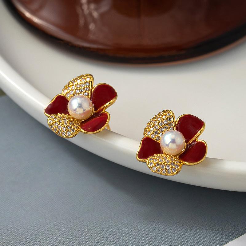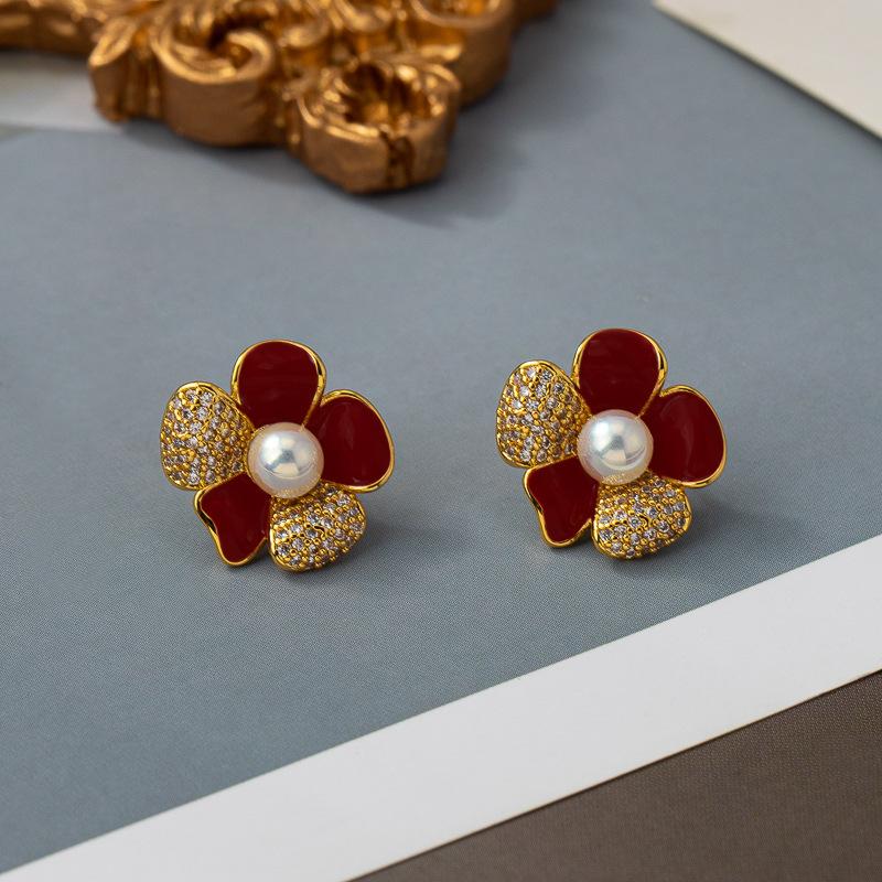 Pendientes de perlas estilo francés, pendientes de flores de alta calidad, esmalte rojo con incrustaciones completas, simples, pequeños, que combinan con todo, exquisitos y dulces.