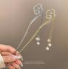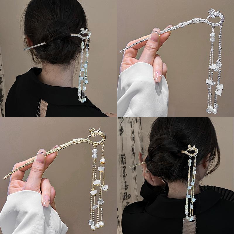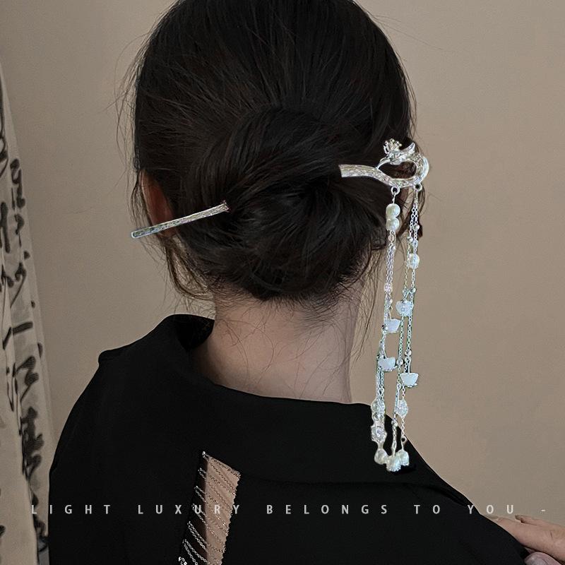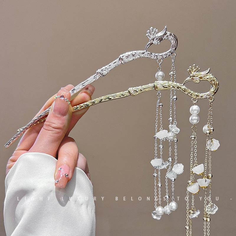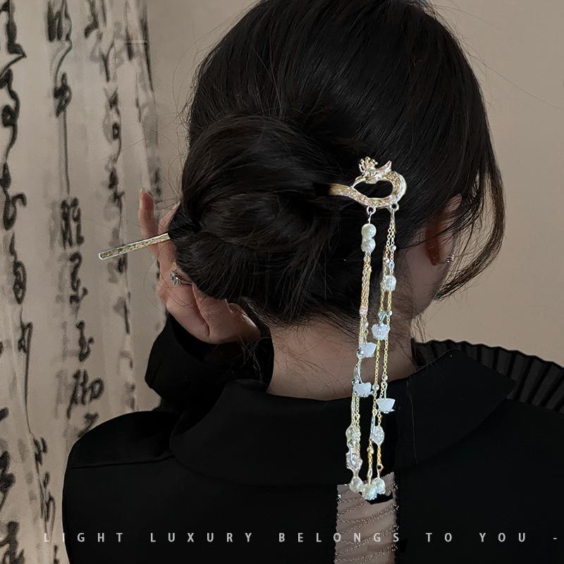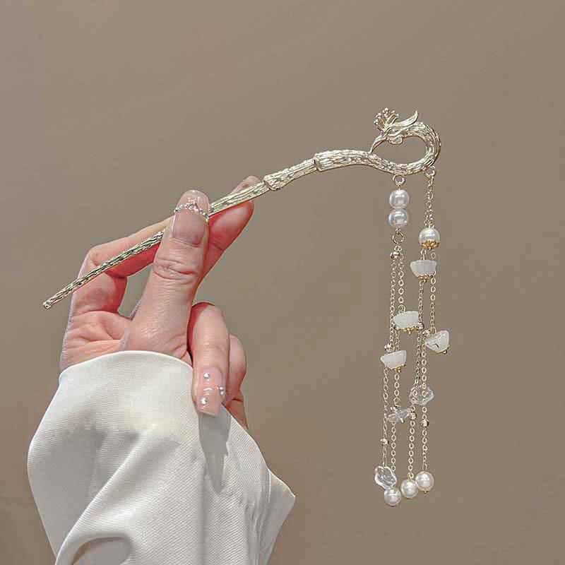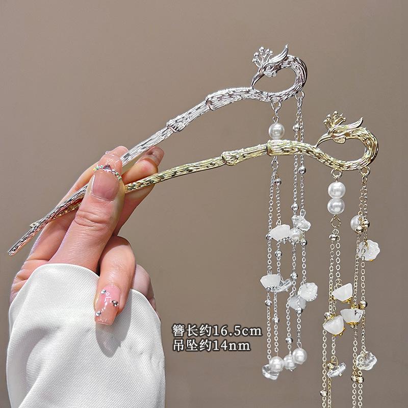 Horquilla con borla de perla antigua, sencilla y elegante, estilo Xiangyun, estilo Hanfu, con textura de fénix, con forma de disco, para colgar el cabello, con cadena y movimiento escalonado.
