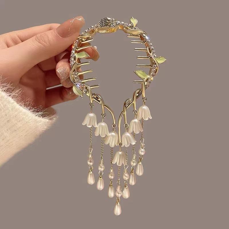 Nuevo estilo Mori, pinza para el pelo con forma de bola y borla de diamantes de imitación con hojas de belleza de hadas, accesorios para el cabello para mujer