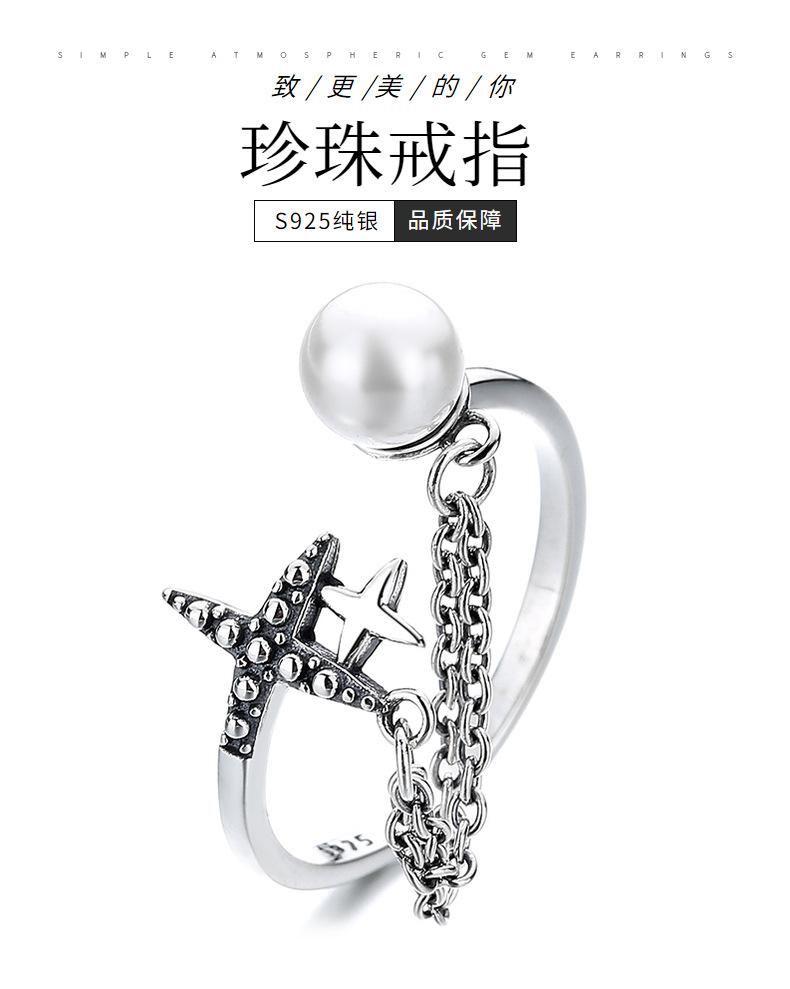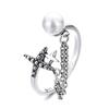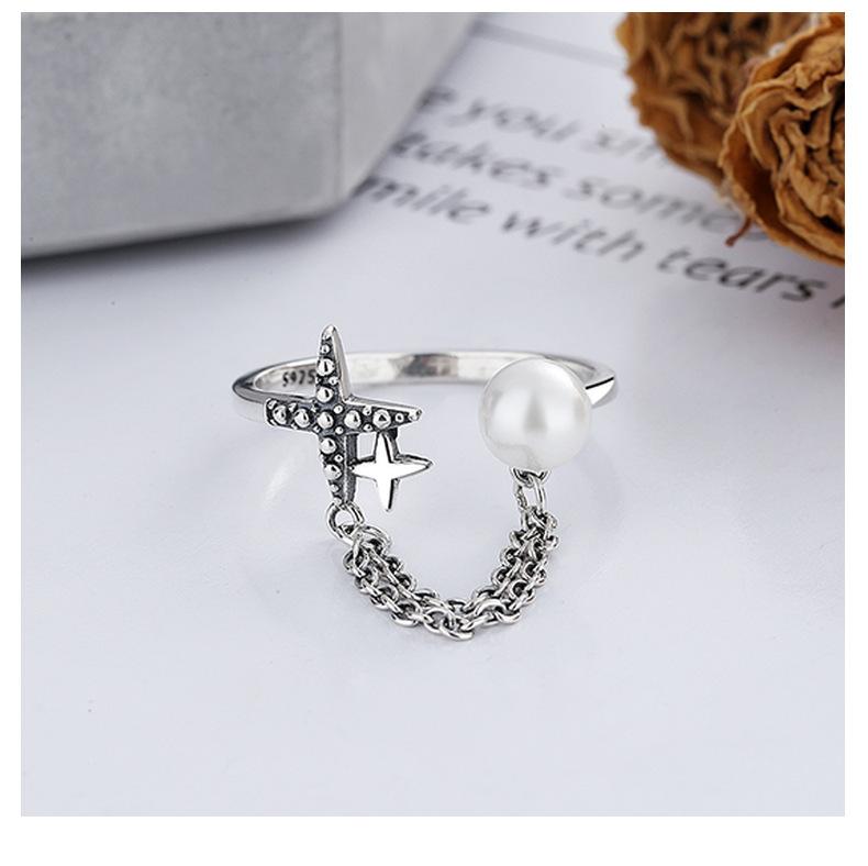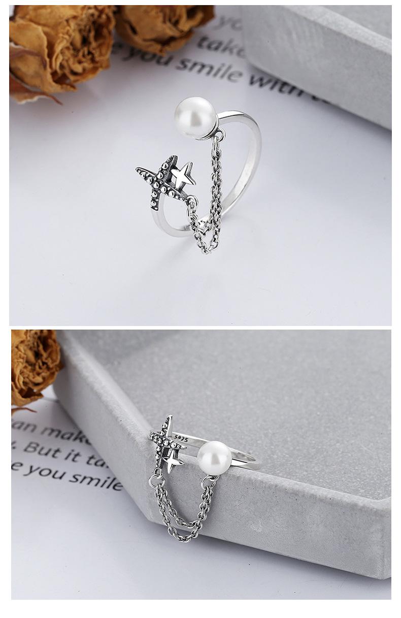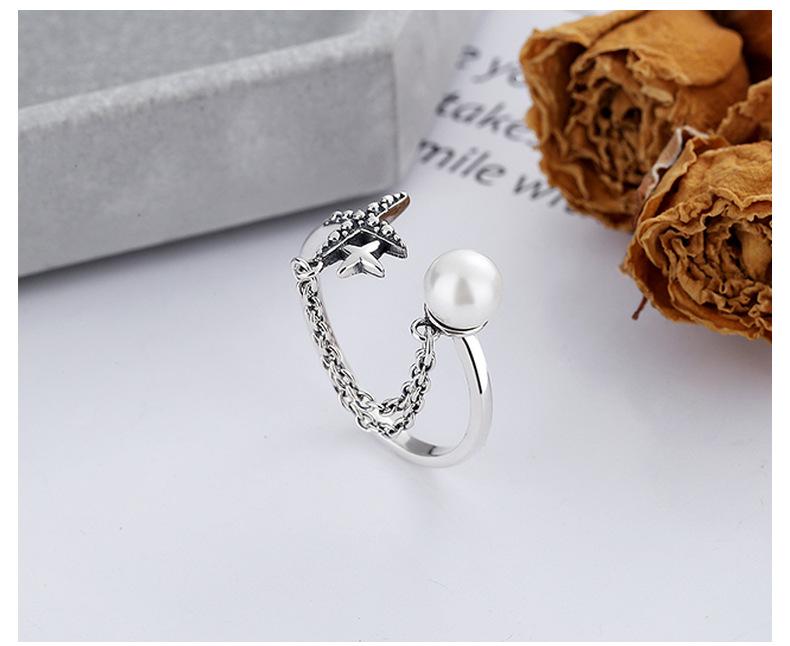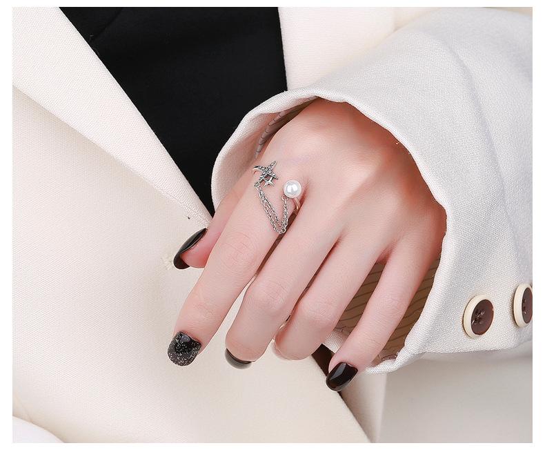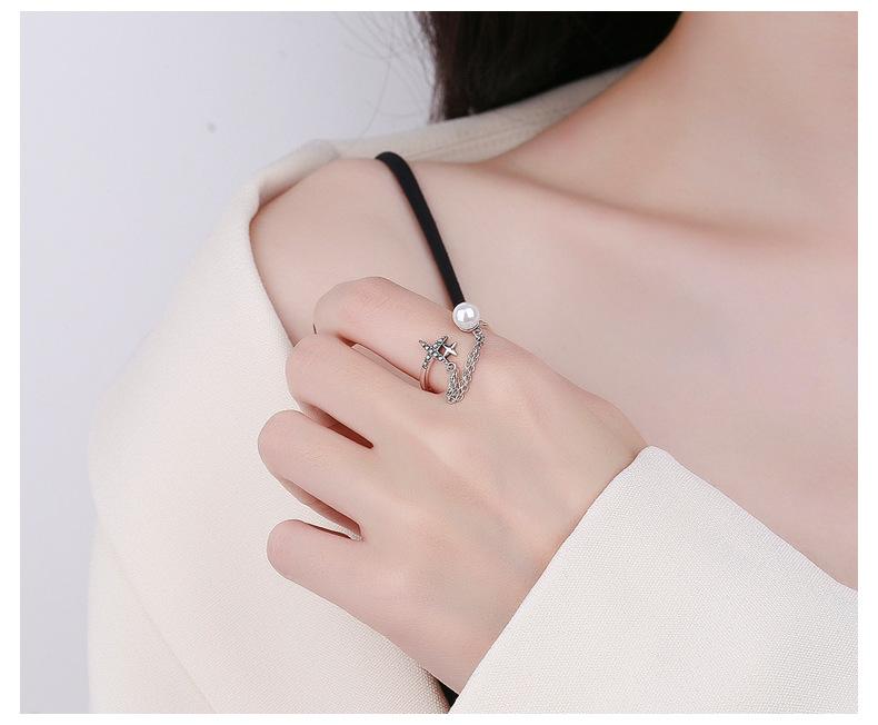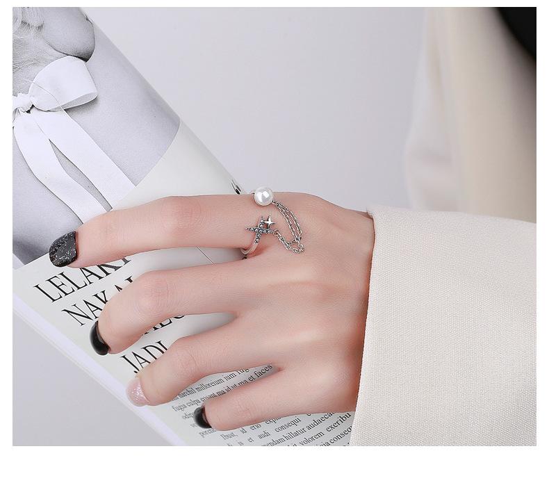 Anillo de apertura Yunchao Xuan S925 en plata esterlina con diseño de nicho de perla y cadena de punto de cruz con estrellas creativas japonesas y coreanas