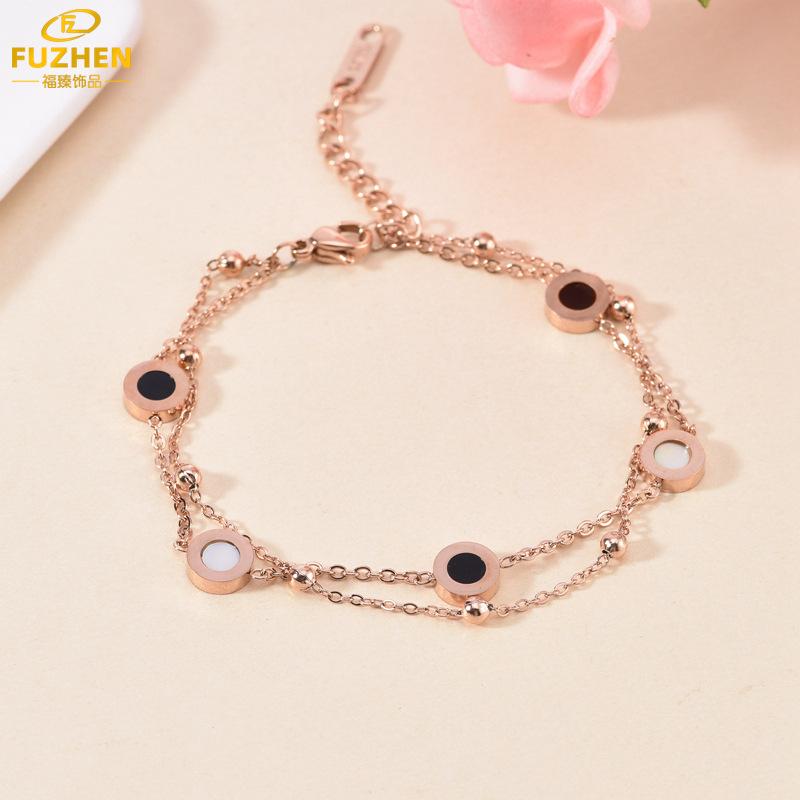 Pulsera de acero de titanio y oro rosa de 18 quilates con disco pequeño de nácar, estilo retro, doble cadena, venta al por mayor, suministro de comercio exterior¥13.5Compre ya