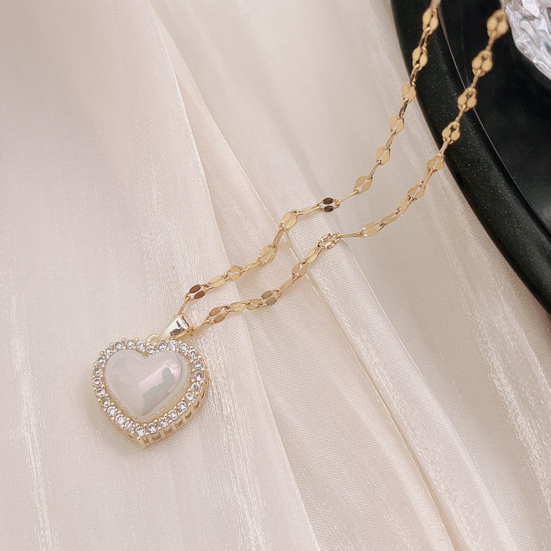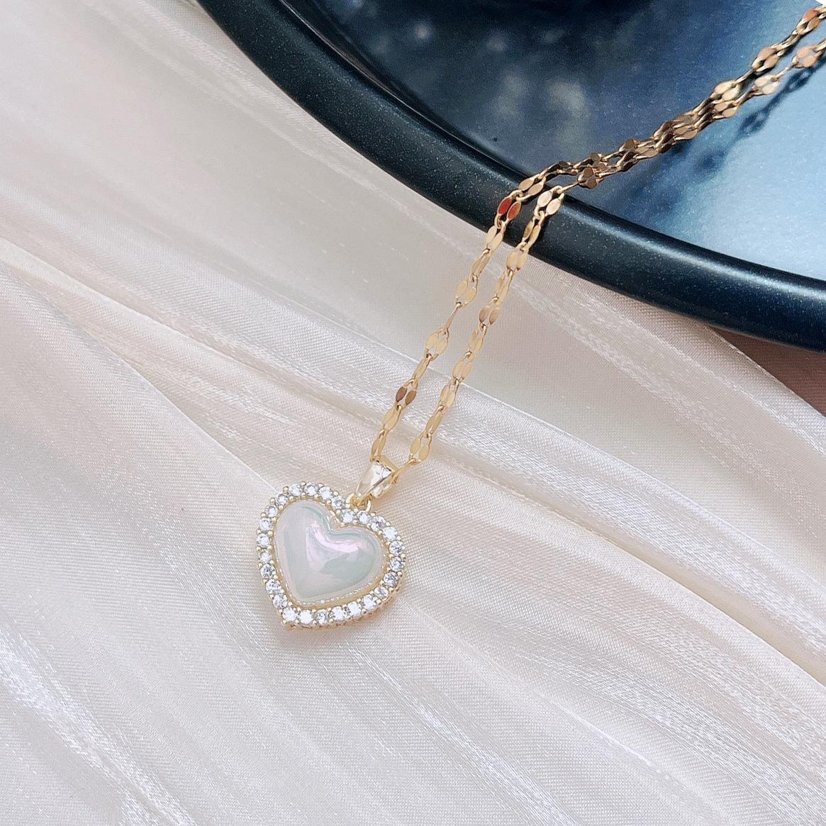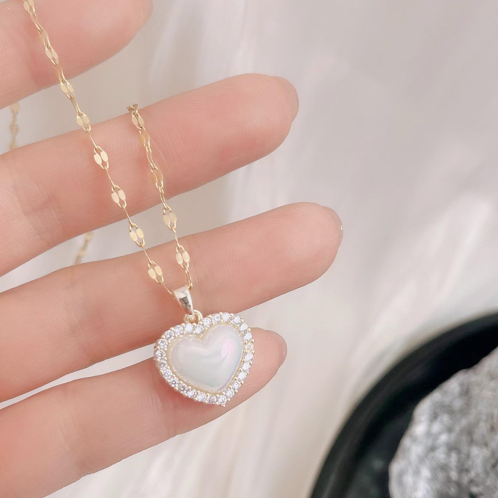 [Acero de titanio chapado en oro real] micro-incrustaciones de circonita collar hueco tridimensional en forma de corazón cuentas de color simples cadena clavicular de amor