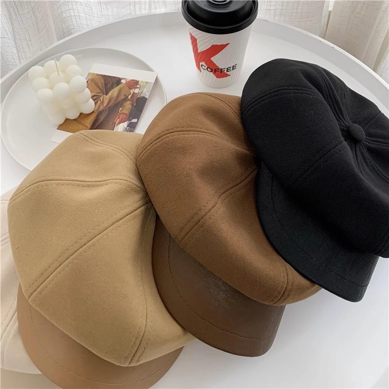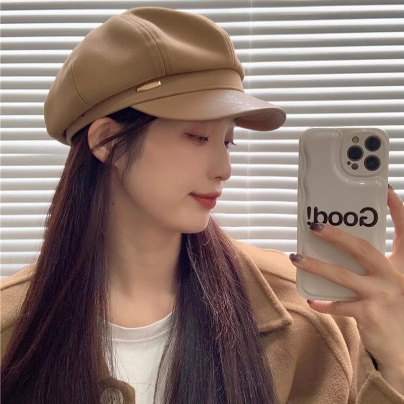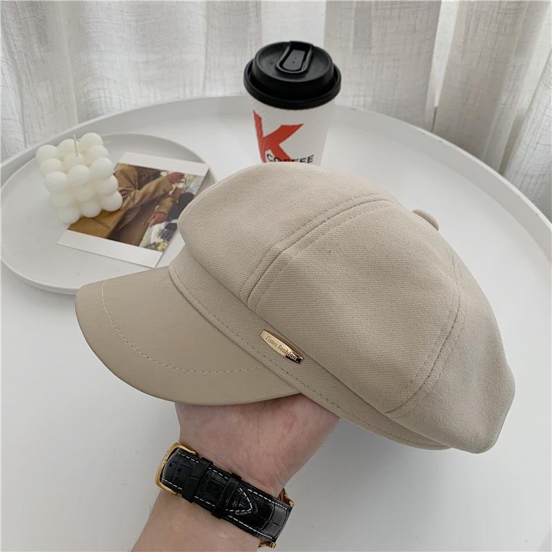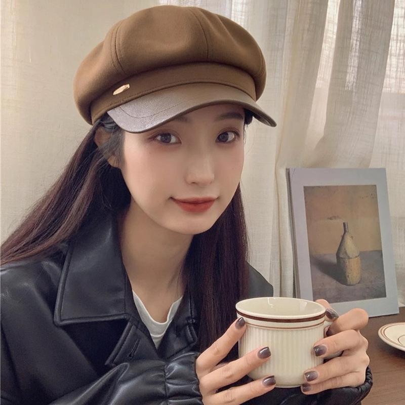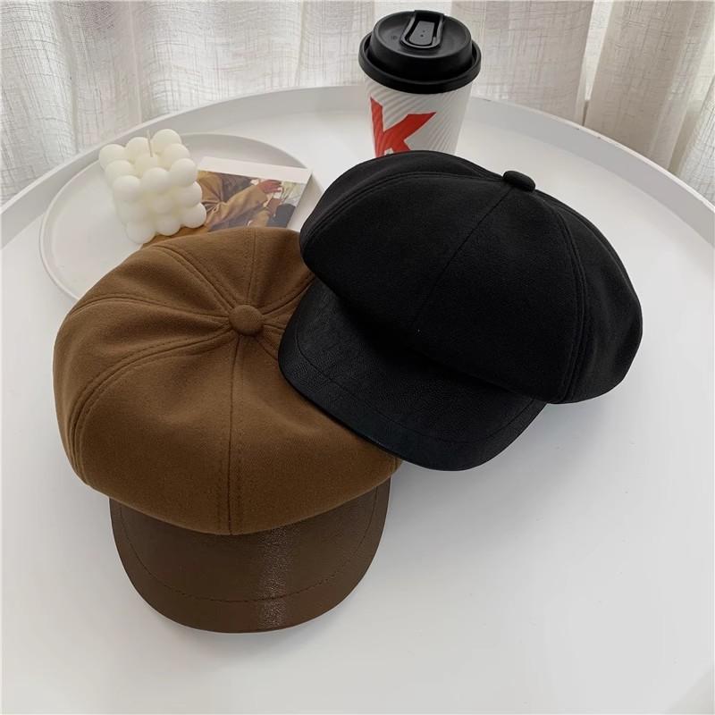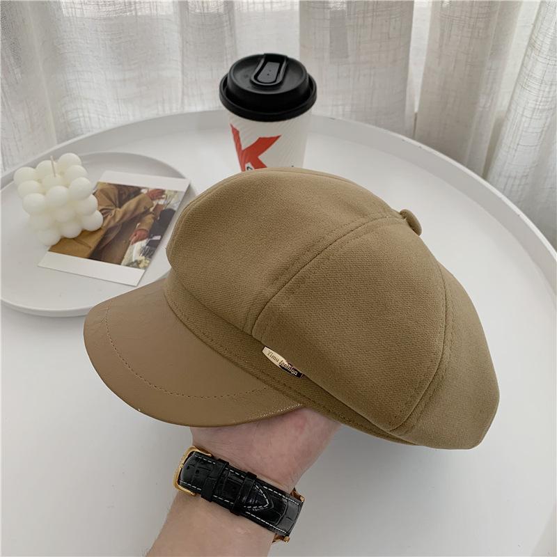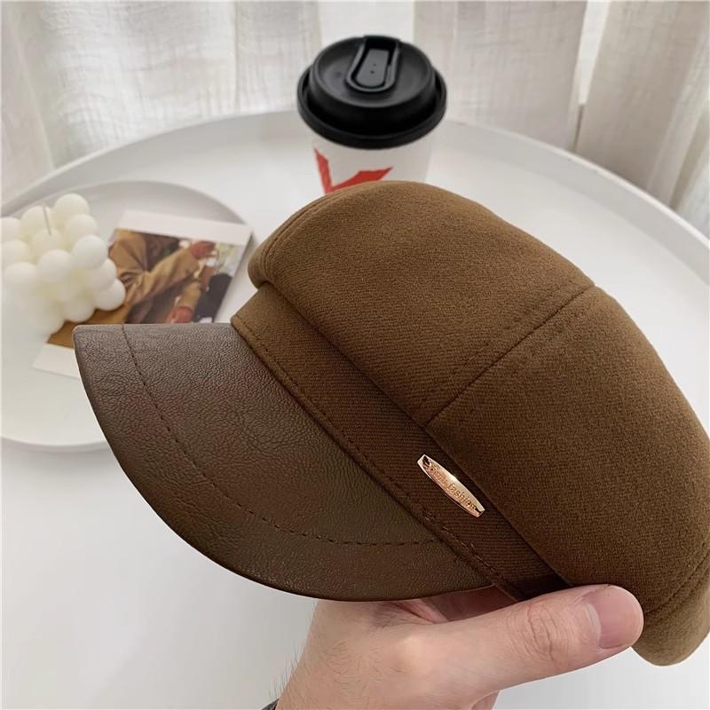 Boina octogonal de lana con visera de piel PU de diseñador para mujer, estilo coreano, cálida para invierno, combinable con todo, temperamento, etiqueta metálica