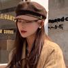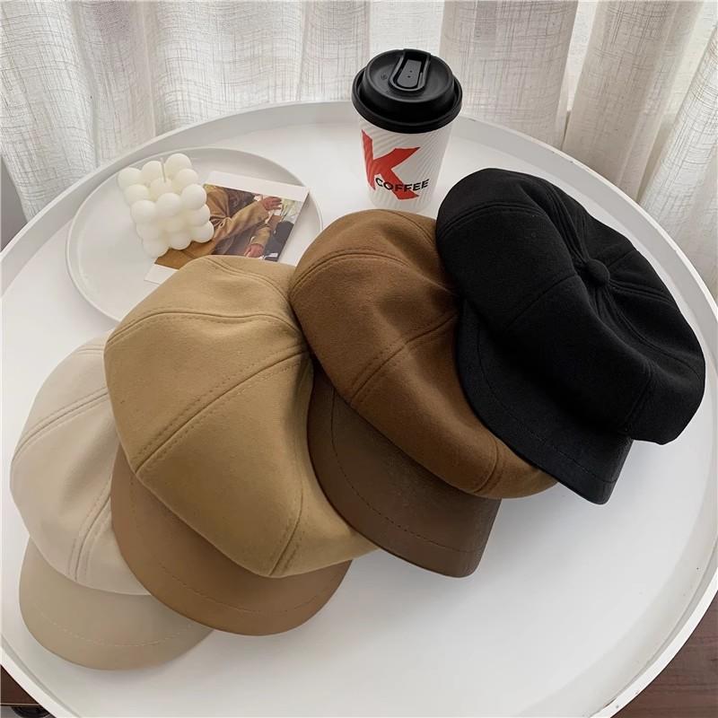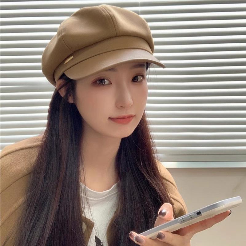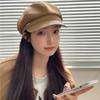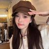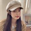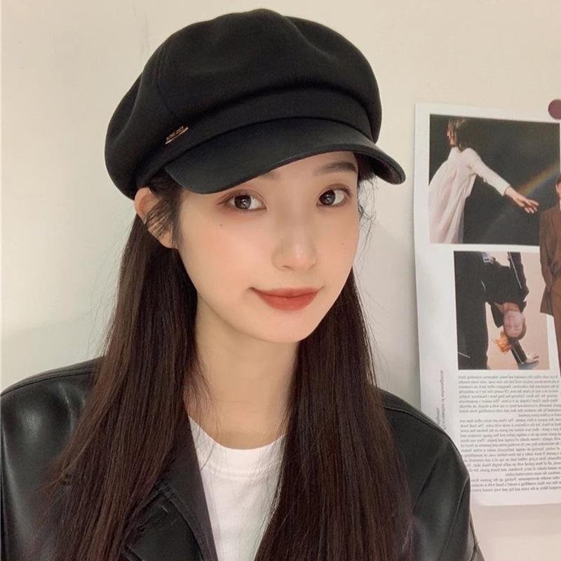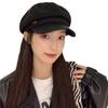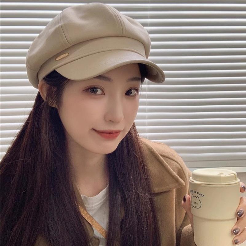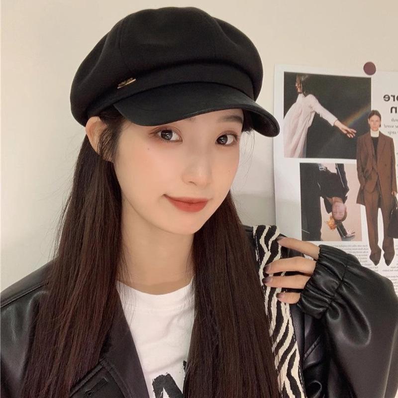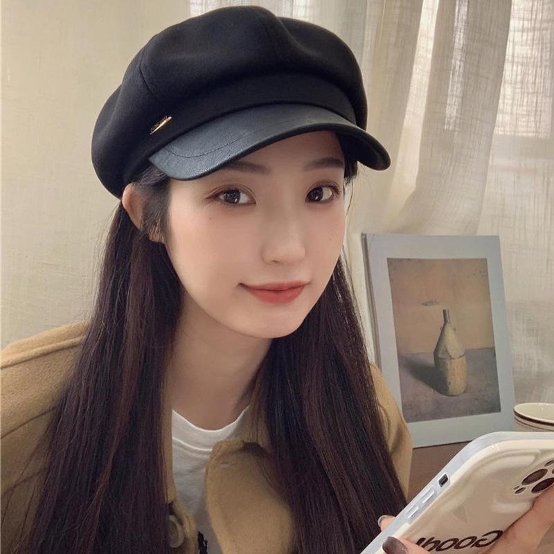 Boina octogonal de lana con visera de piel PU de diseñador para mujer, estilo coreano, cálida para invierno, combinable con todo, temperamento, etiqueta metálica