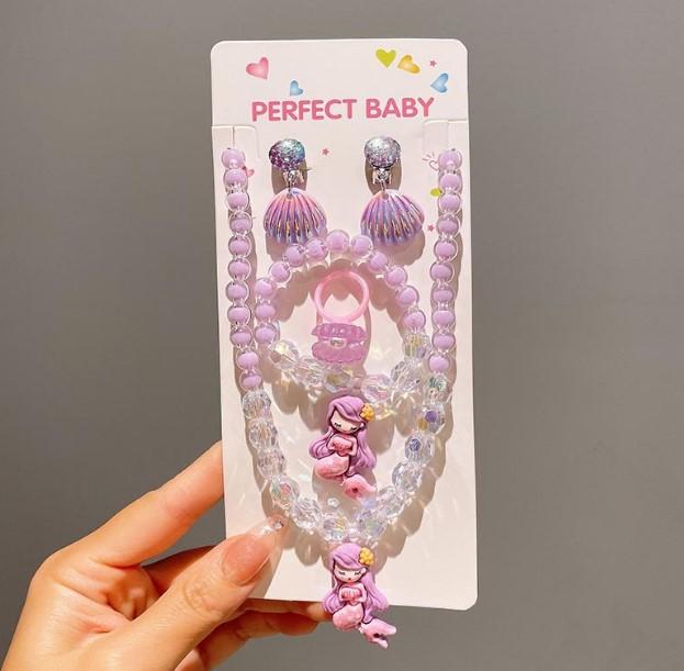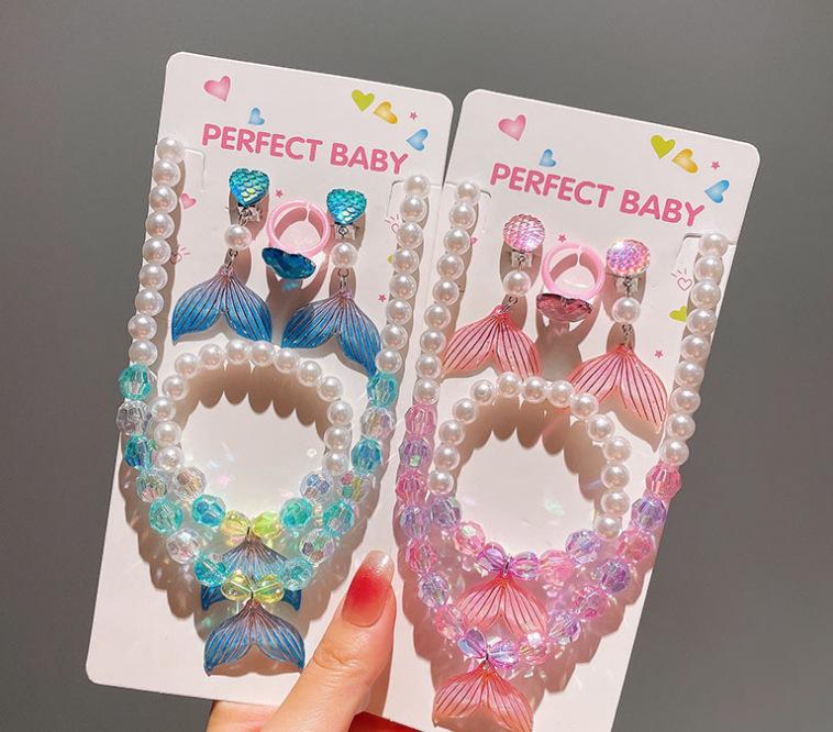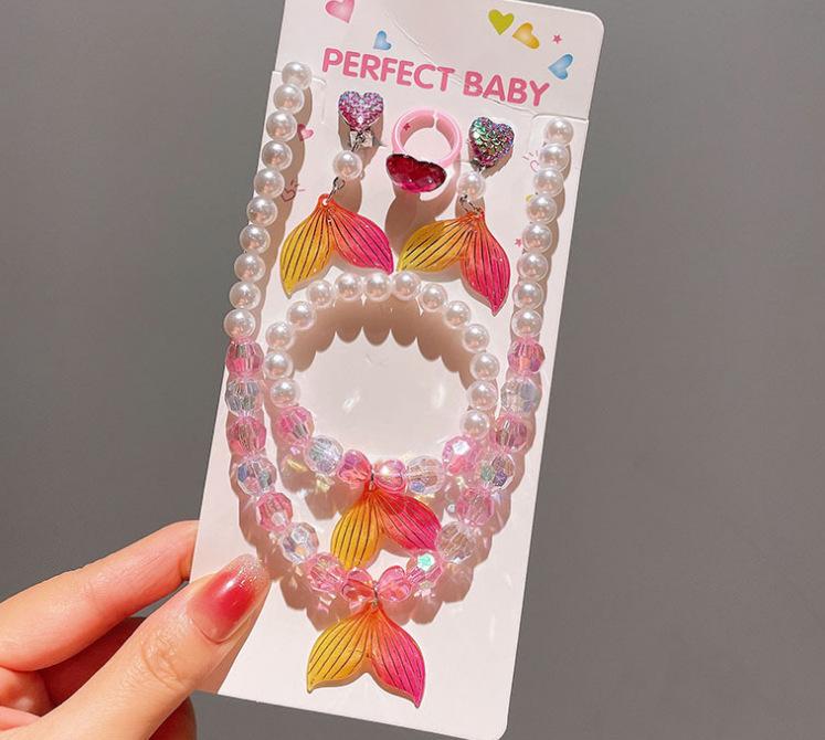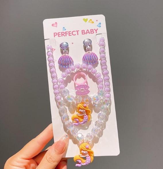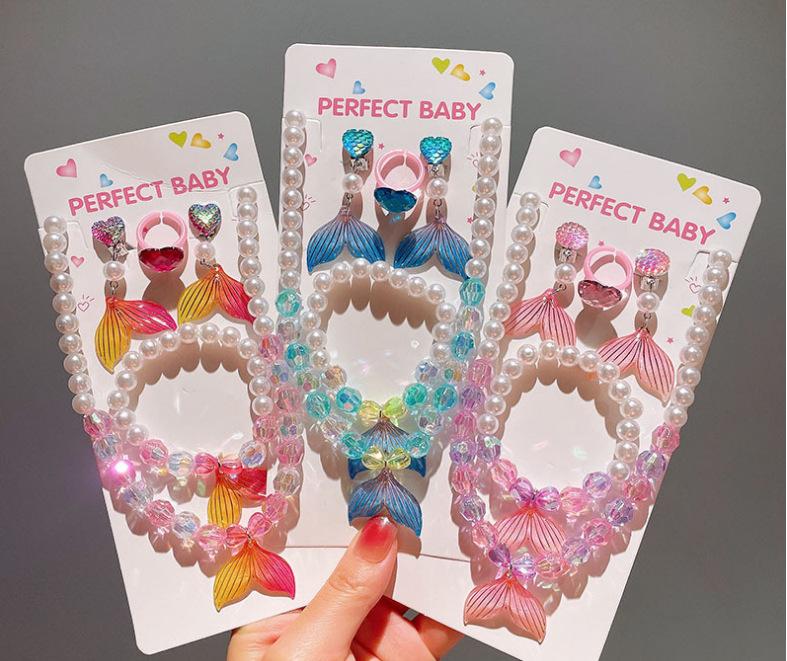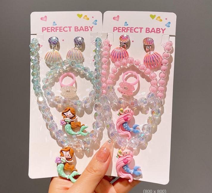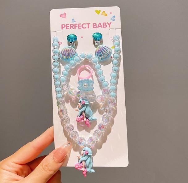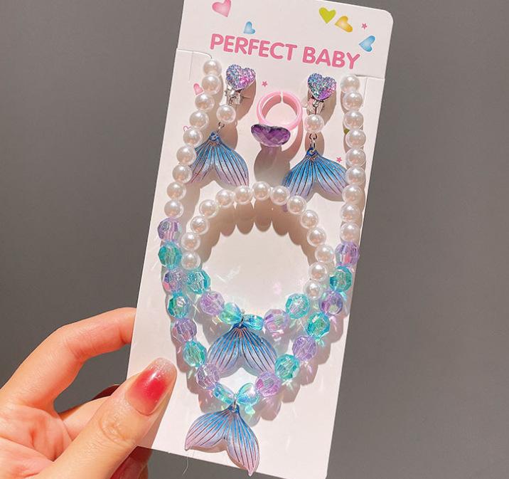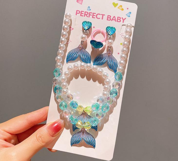 Collar de cuentas con dibujos animados para niños, accesorios, anillo, pulsera, clip para las orejas, traje de princesa sirena, joyería