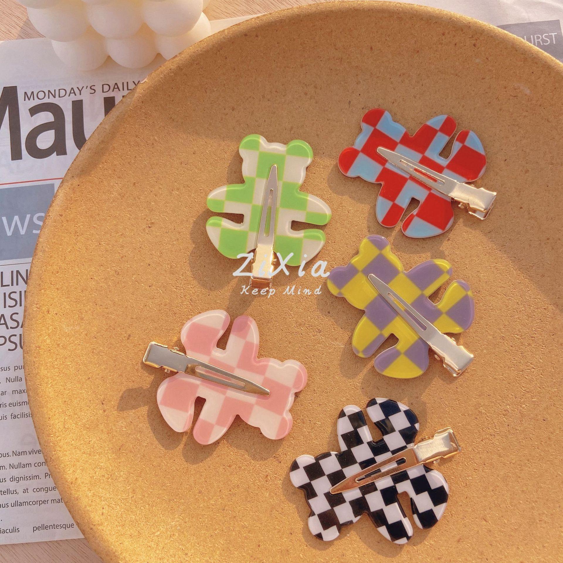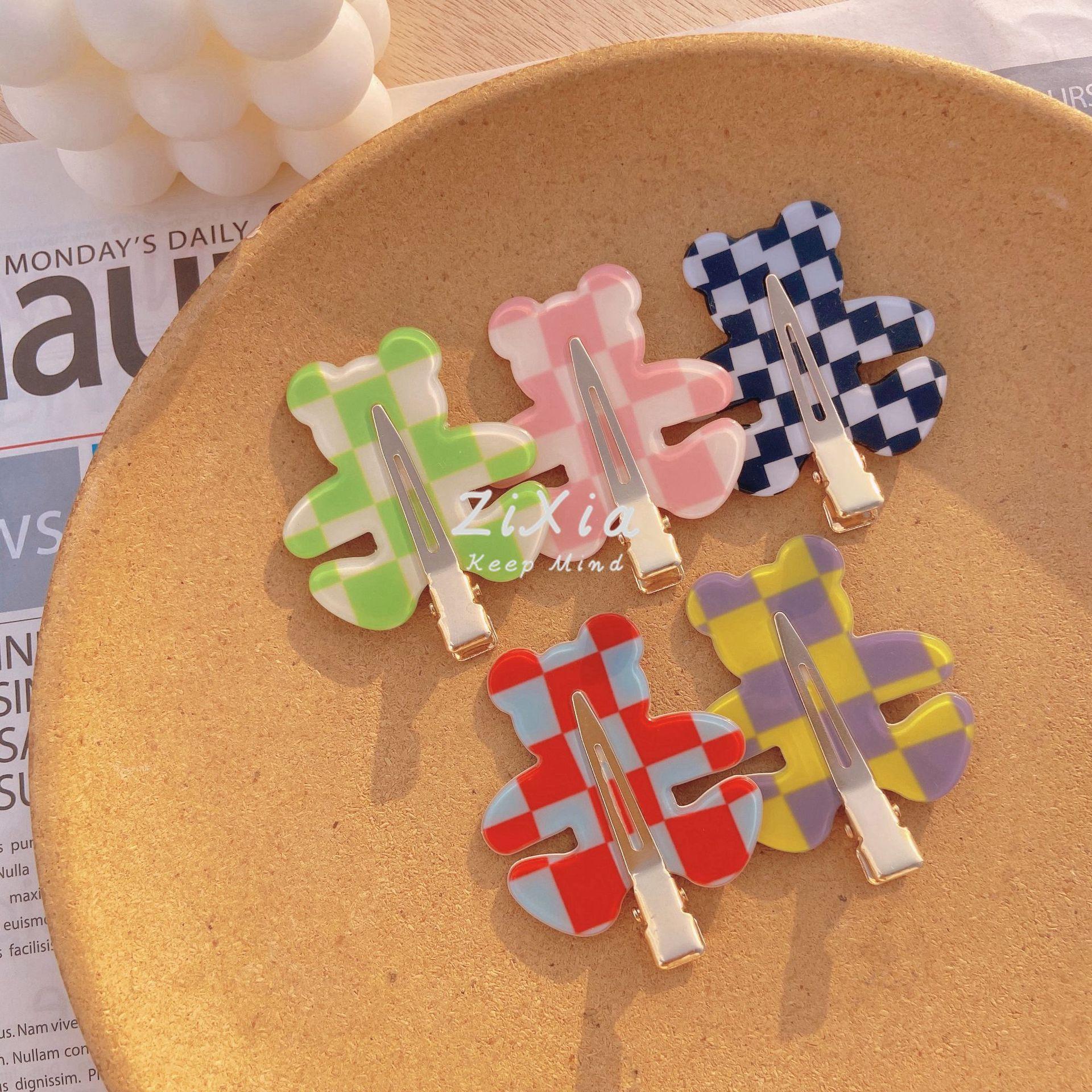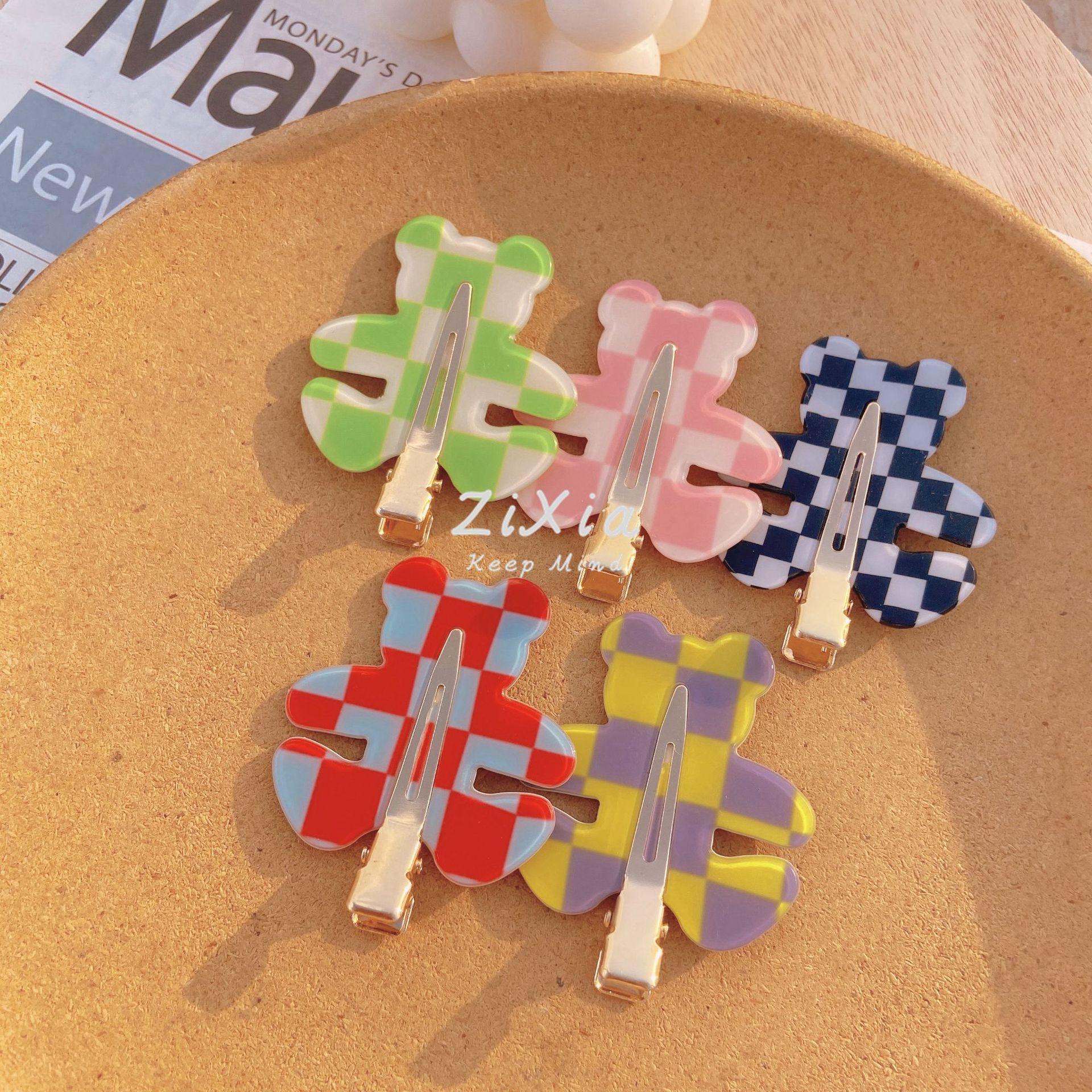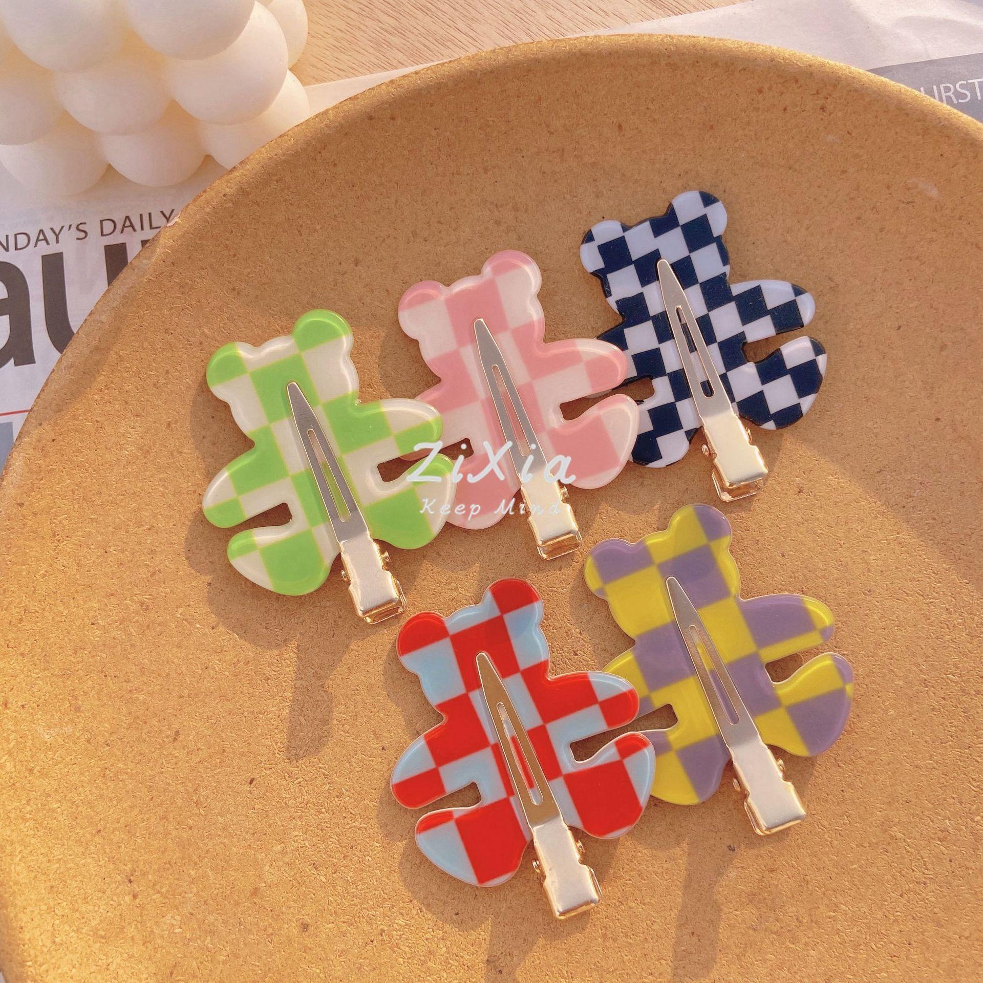 Horquilla de cuadros popular con diseño de oso sin costuras, pinza para flequillo de cuadros de colores, pinza para maquillaje de chica dulce, pinza lateral