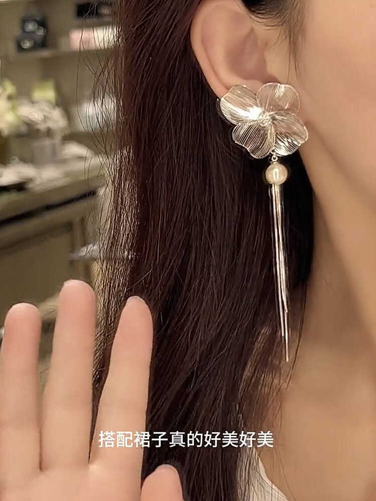 Super Fairy Hollow Flower Tassel Pearl S925 Brincos de Prata Feminino Nicho Exclusivo Exagerado Elegante Brincos