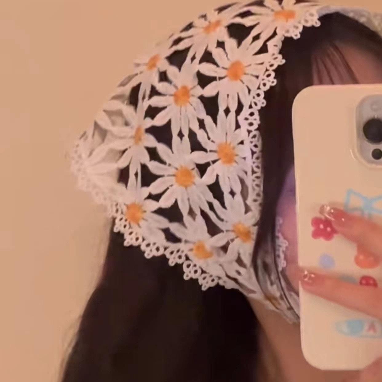 Zhao Rusi's White Flower Headscarf, Little Daisy Flower Turban, Phantom Butterfly Lace Turban, Turquoise Butte...