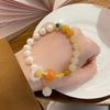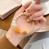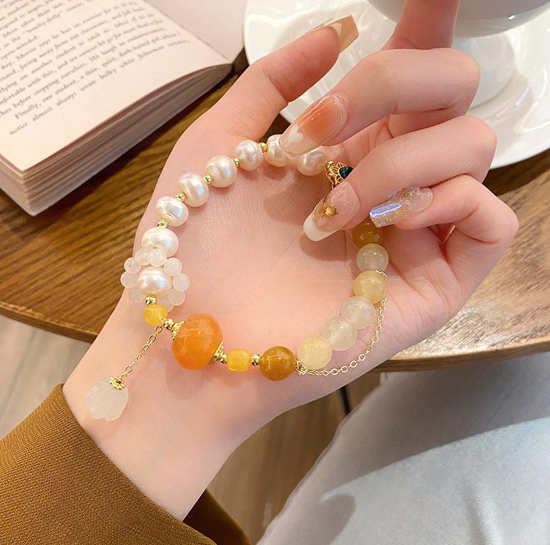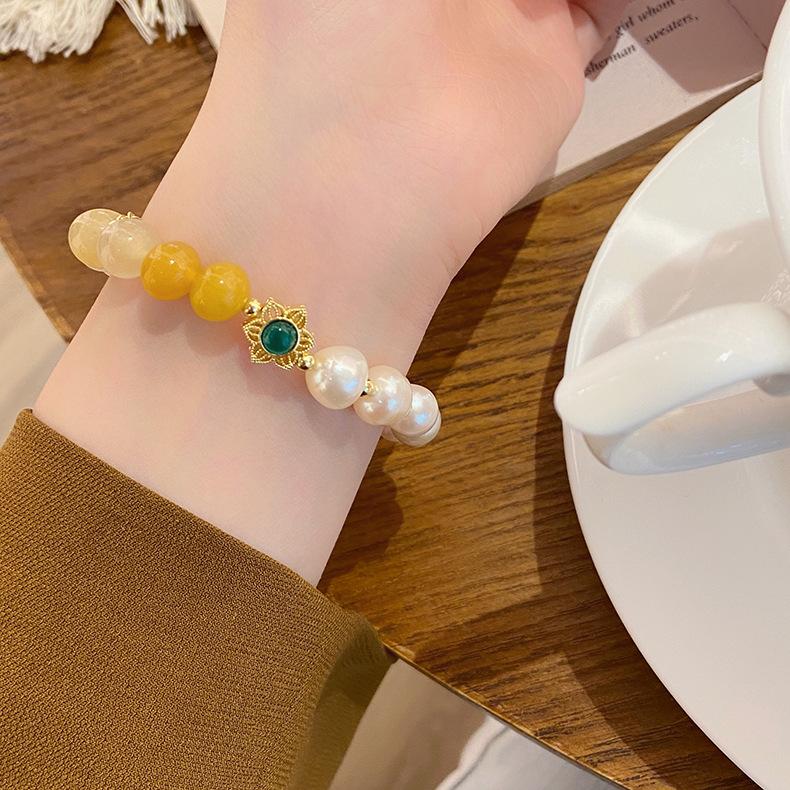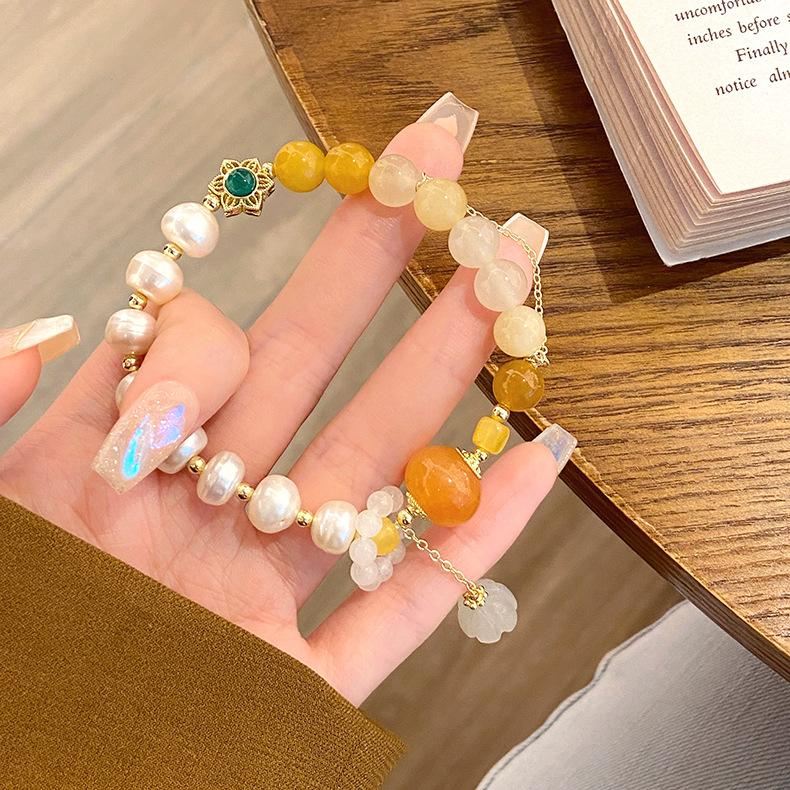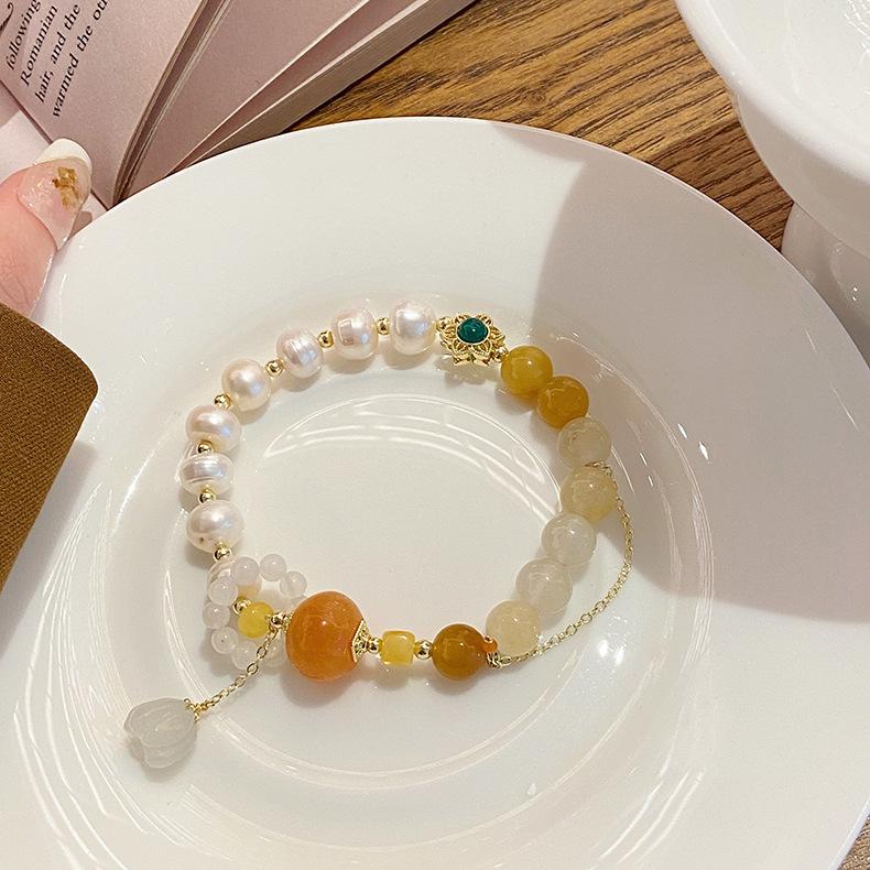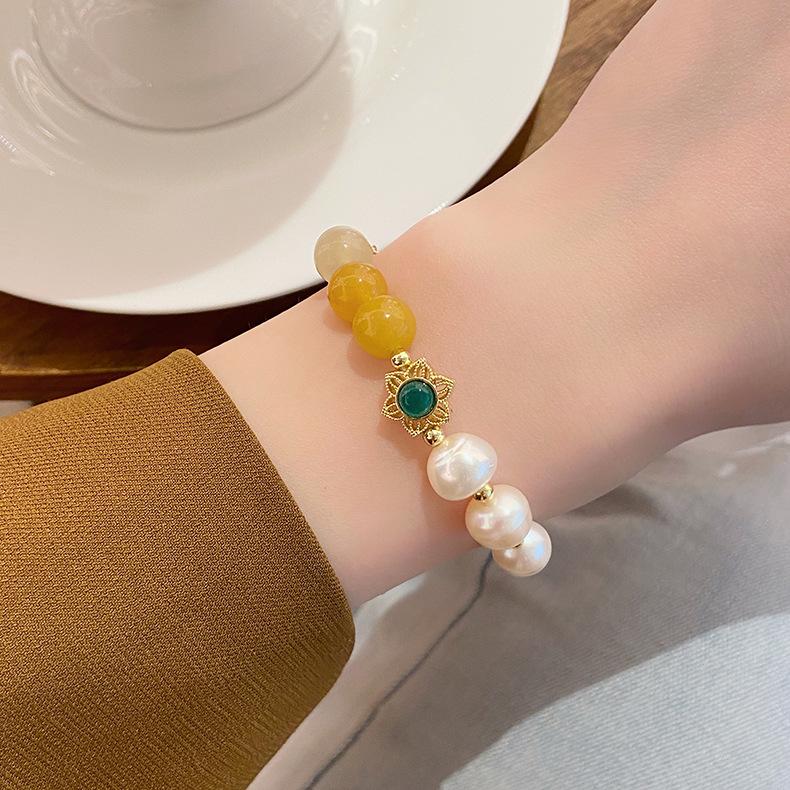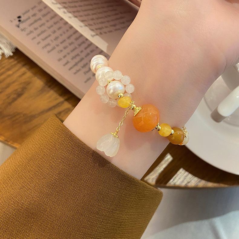 Pulsera de jade escarlata dorado de 8 mm con diseño de lirio y perlas de agua dulce, estilo retro, hecha a mano en China.