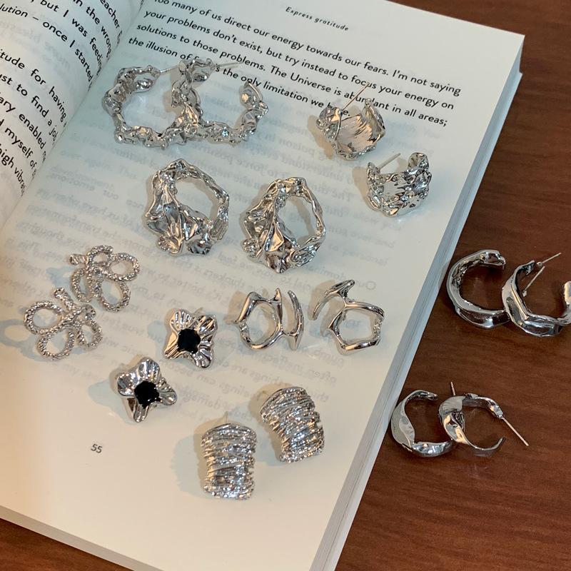 Pendientes huecos irregulares de metal líquido, pendientes de lujo ligeros de nicho, pendientes de aguja plateada de sentido avanzado, pendientes de estilo frío para mujeres