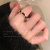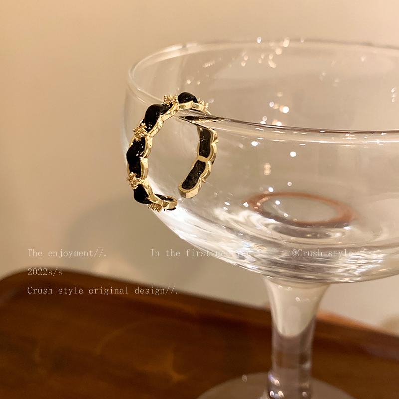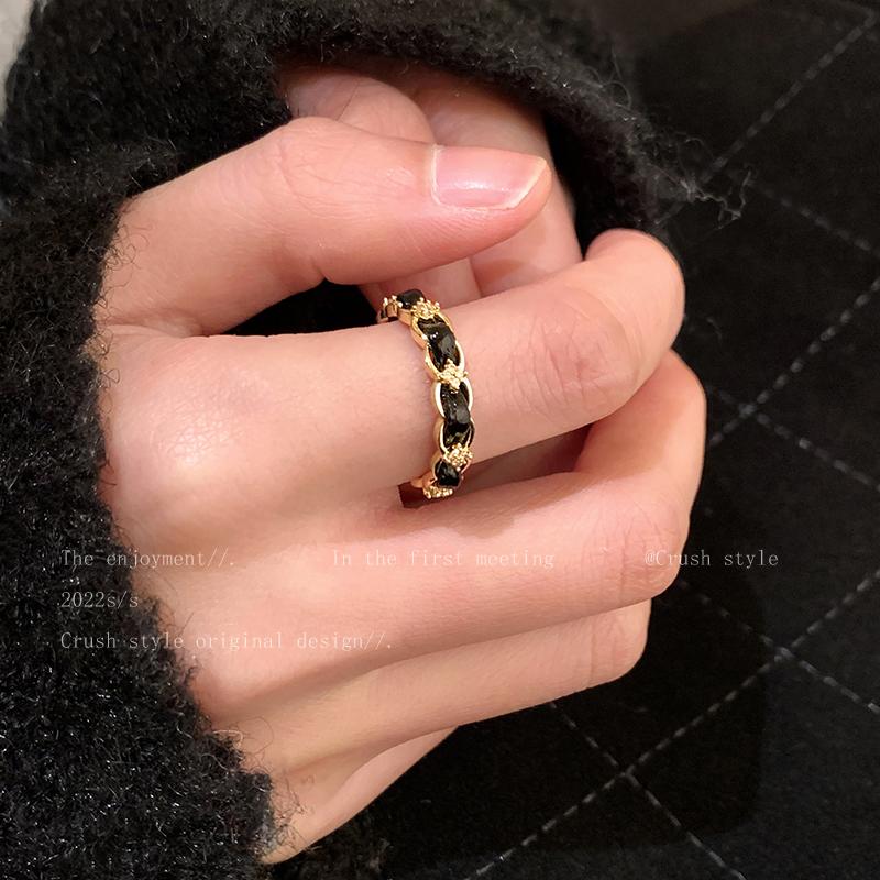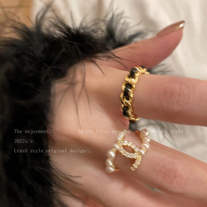 Black Leather Chain Ring, Golden Pearl Double C Ring