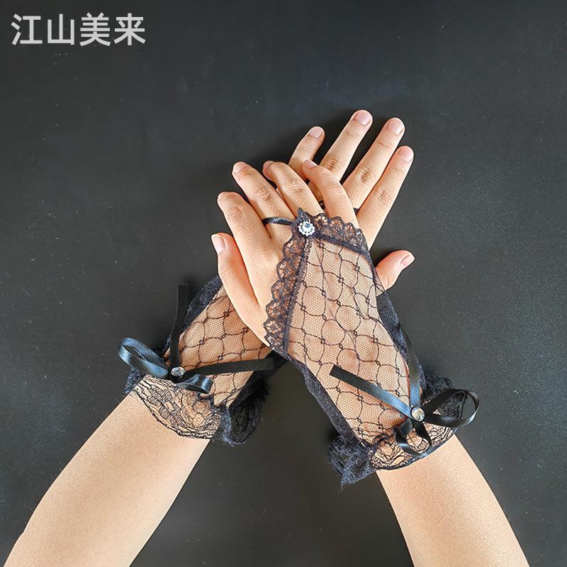 Ventas Directas de Fábrica Guantes de Boda Nupciales de Encaje Negro Corto con Lazo para Dedos de Gancho Mangas de Mano Estilo Retro