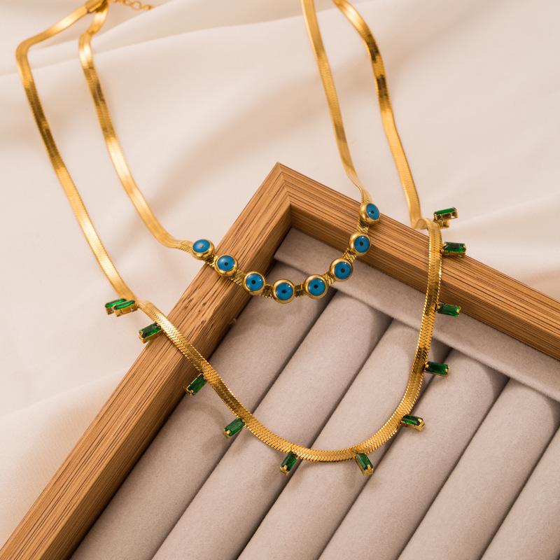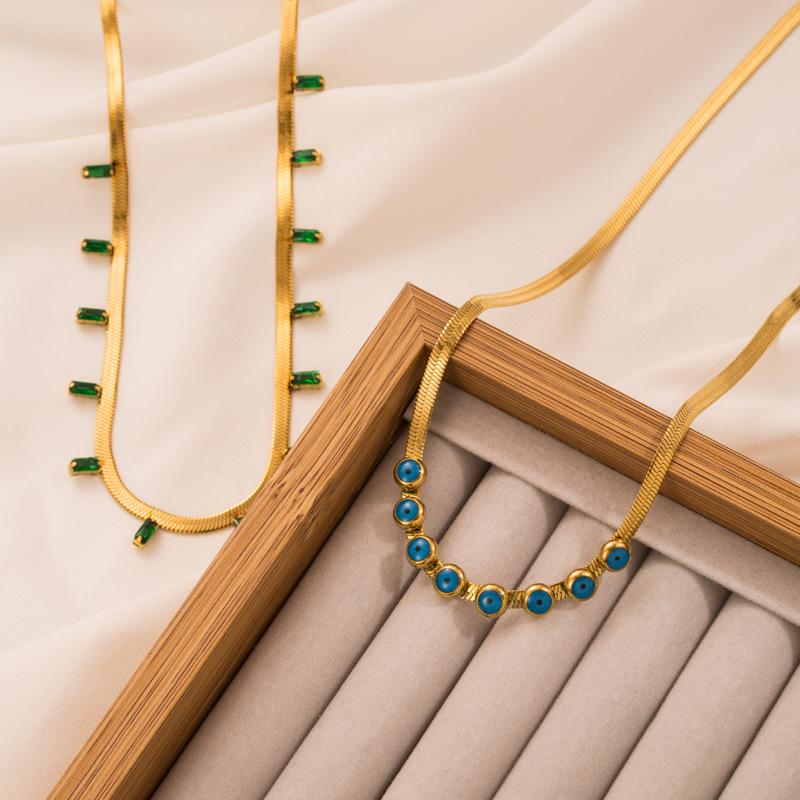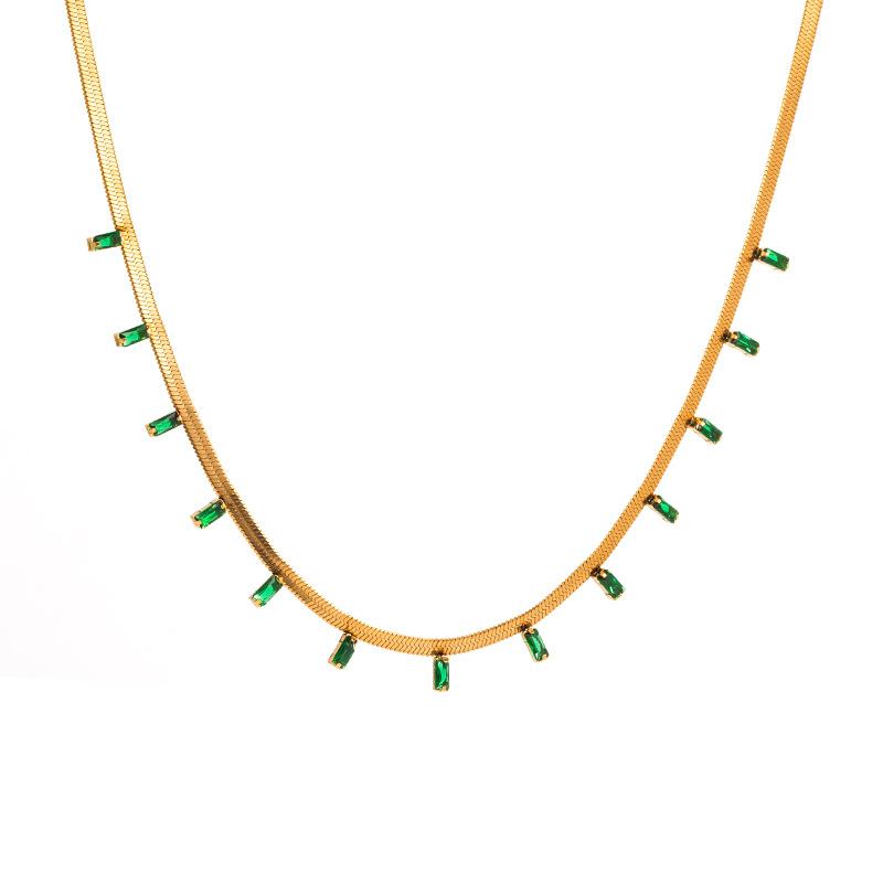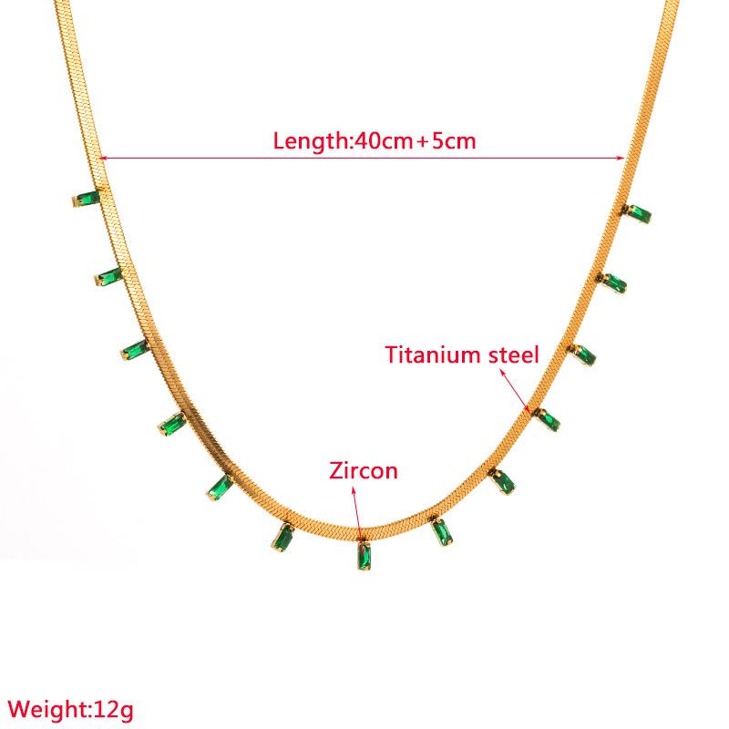 | Collar de cadena de serpiente plana de 14 quilates, nuevo, europeo y americano, con circonita verde cuadrada, collar de acero de titanio, joyería de temperamento de estilo rojo neto. |