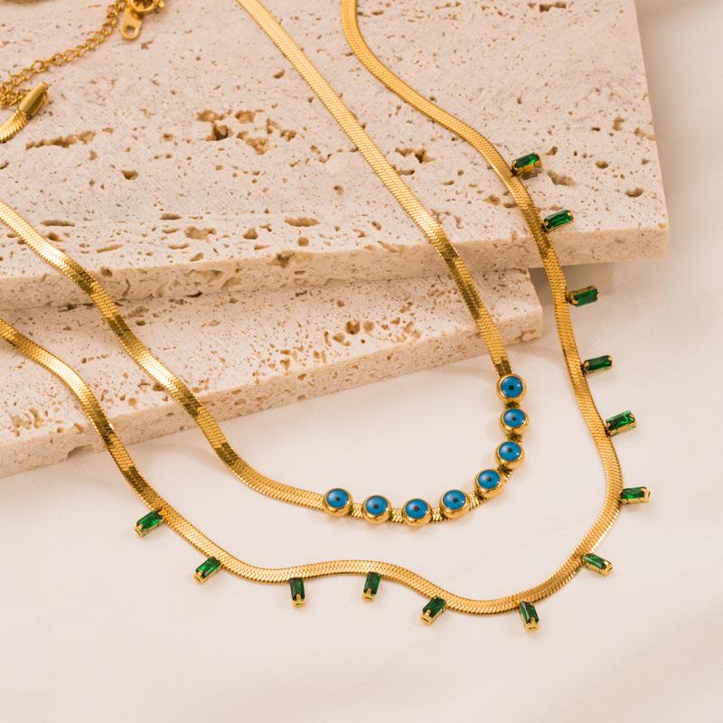 | Collar clásico de acero y titanio con estilo ins, sencillo, para mujer, con galvanoplastia que conserva el color, de acero inoxidable en oro de 18 quilates, collar de turquesa apilable de doble capa. |